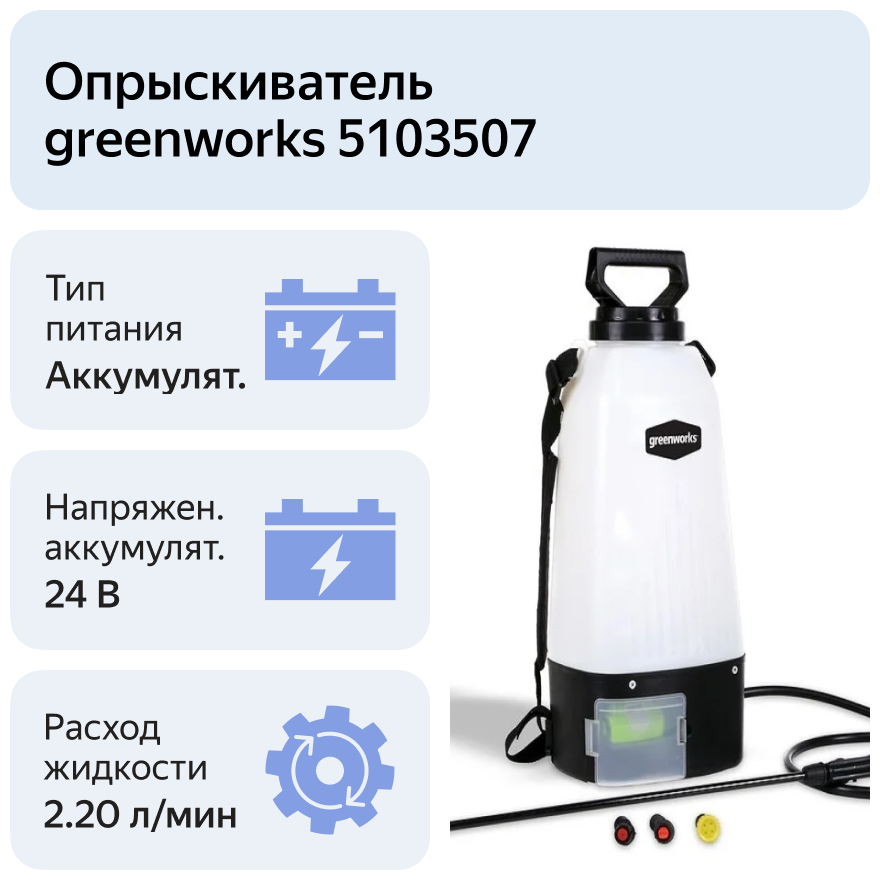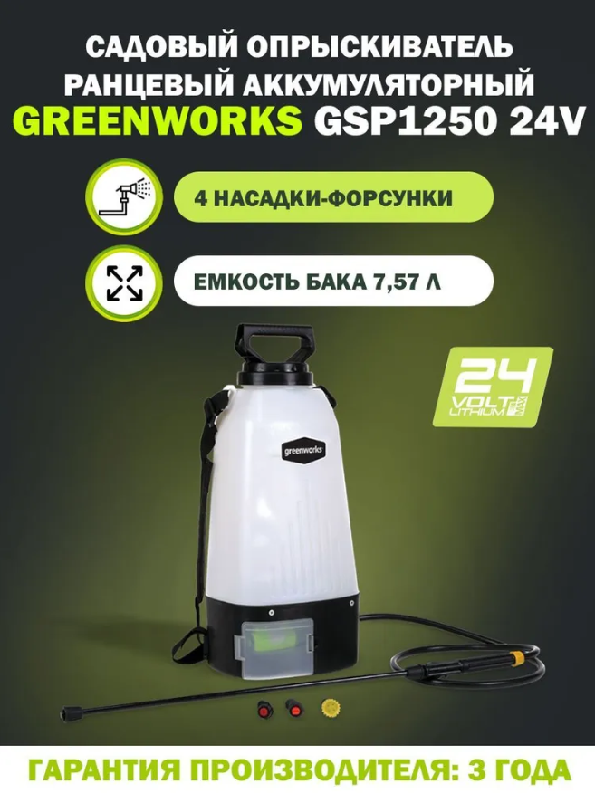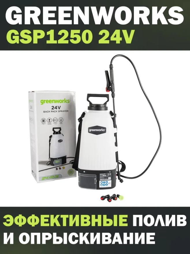 Аккумуляторный опрыскиватель GreenWorks GSP1250K2 24 В, 2 А*ч 5103507 предназначен для полива растений, опрыскивания огорода и сада.