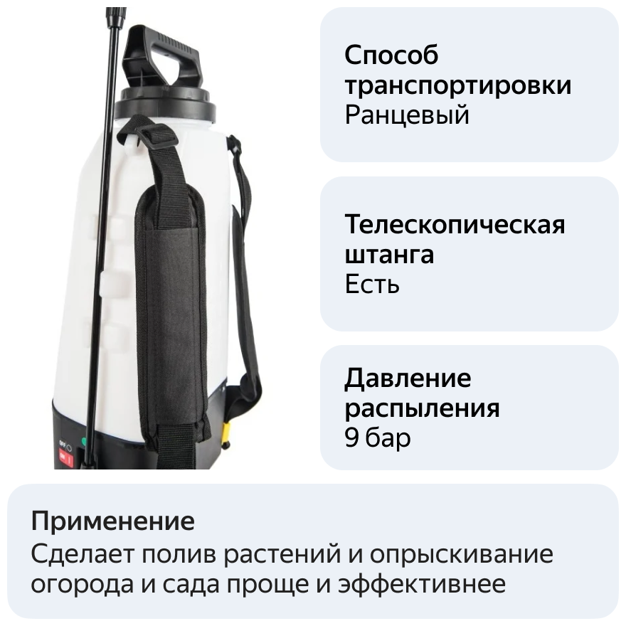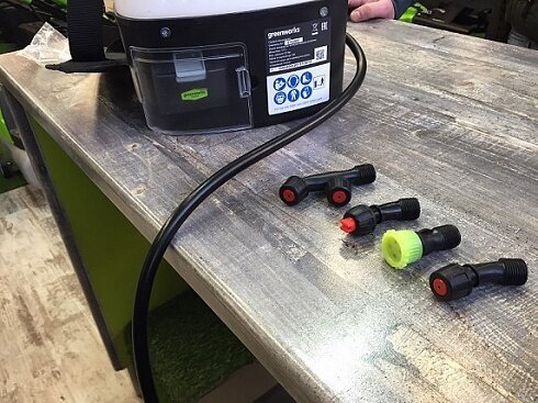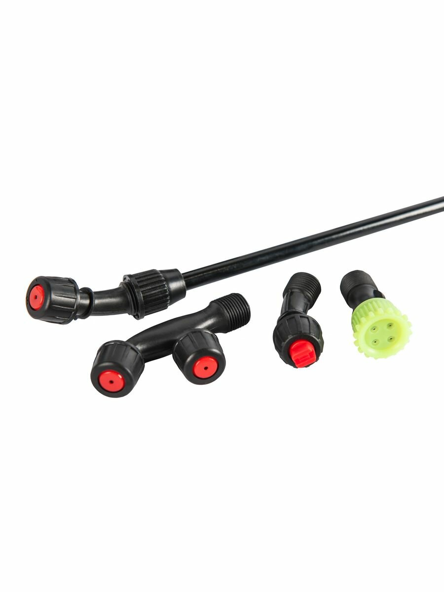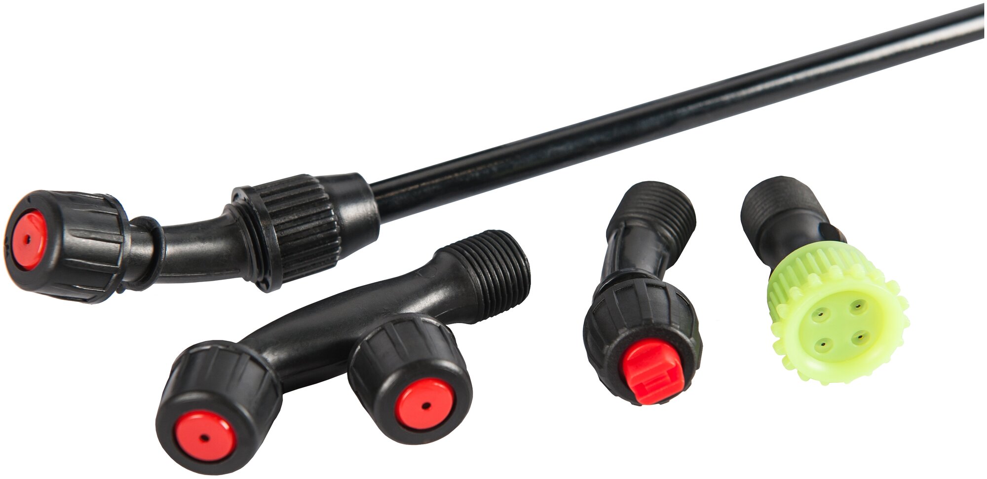 Комплектуется 4 насадками - двойной конус, конус, лейка, плоская форсунка для выполнения различных задач на участке.