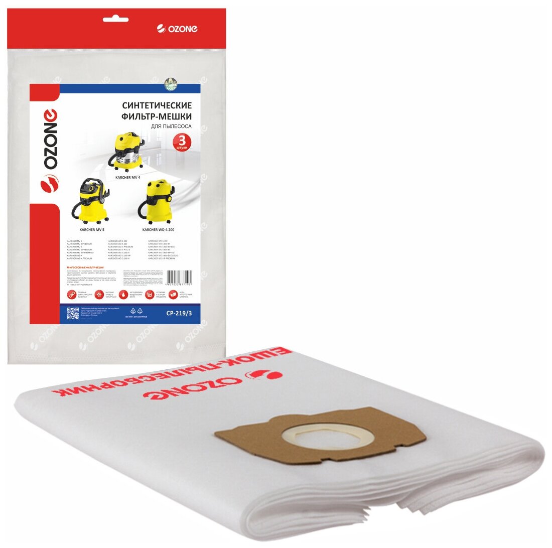 Характеристики OZONE Фильтр-мешки синтетические для пылесоса, 3 шт CP-219/3: