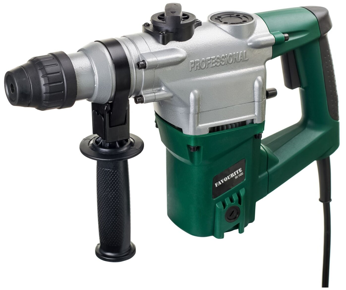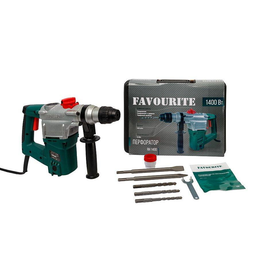 Перфоратор строительный FAVOURITE RH 1400 служит для сверления отверстий в различных материалах. Благодаря регулировке скорости можно подобрать оптимальный режим для работы с учетом особенностей материала. Для удобного использования предусмотрена дополнительная рукоятка. Технические характеристики FAVOURITE RH 1400 Тип хвостовикаsds-plusМощность, Вт1400 Количество режимов 3 Max сила удара, Дж4,5 Реверс поворотом щеток Виброзащита есть Max диаметр сверления буром (бетон), мм26 Max диаметр сверления коронкой (бетон), мм127 Легкий доступ к щеткаместь Плавный пуск есть Длина кабеля 2м Морозоустойчивый кабель есть Сверлильный патроннет Вес нетто, кг 6,5 Габариты без упаковки, мм 390х110х300 Сила удара, Дж4.5 Частота вращения шпинделя, об/мин0-900 Регулировка частоты вращения есть Частота ударов, уд/мин0-4000 Мах диаметр сверления (дерево), мм40 Max диаметр сверления (металл), мм13 Max диаметр сверления буром (кирпич), мм30 Max диаметр сверления коронкой (кирпич), мм127 Предохранительная муфта да Преимущества FAVOURITE RH 1400 Удобный переключатель режимов работы Дополнительная рукоять для лучшего контроля над инструментом Независимость от заряда батареи и, соответственно, большая производительность без простоев для зарядки Мощный двигатель для высокой производительности Патрон SDS-plus для простой смены оснастки Регулировка частоты вращения - для точной настройки под разные материалы Легкий доступ к щеткам – удобство самостоятельного обслуживания Двигатель расположен вертикально, что позволит работать в труднодоступных местах Удобный кейс решает вопрос хранения и транспортировки FAVOURITE RH 1400