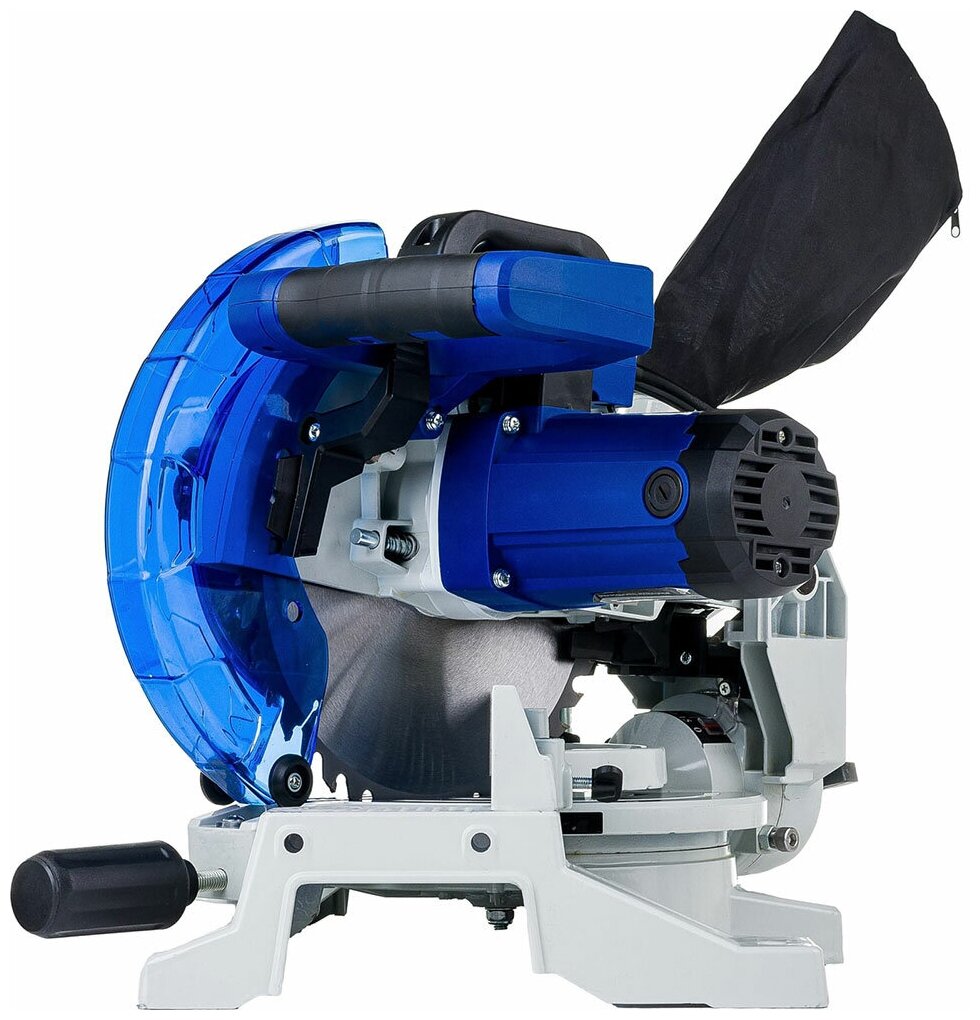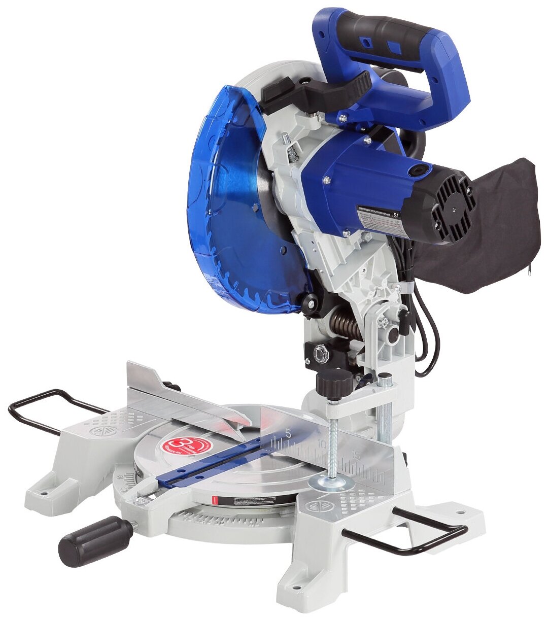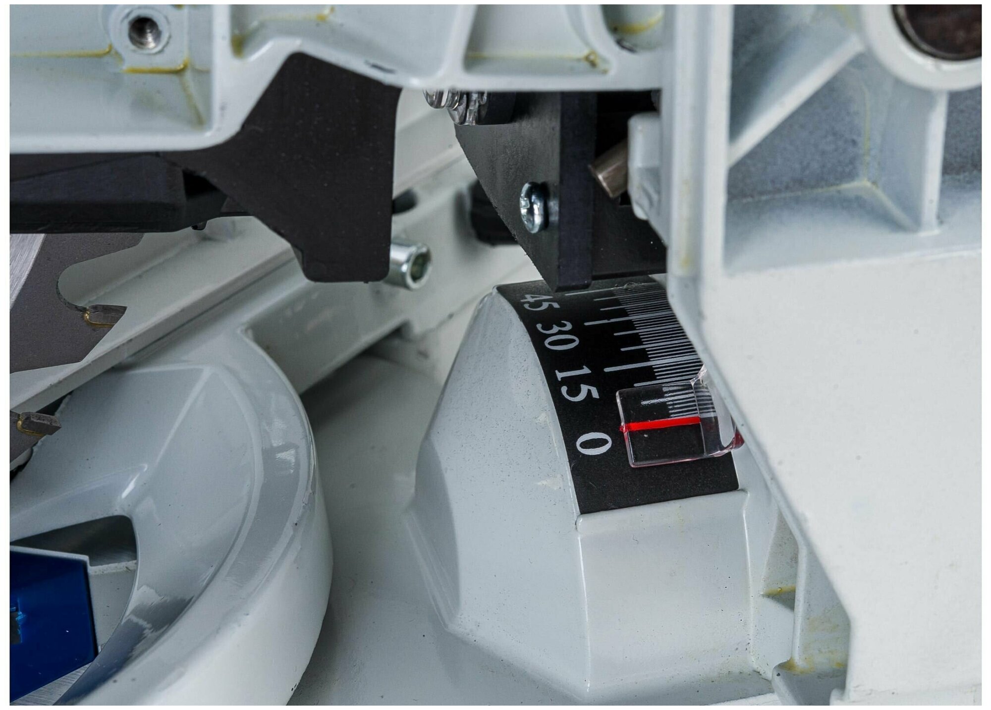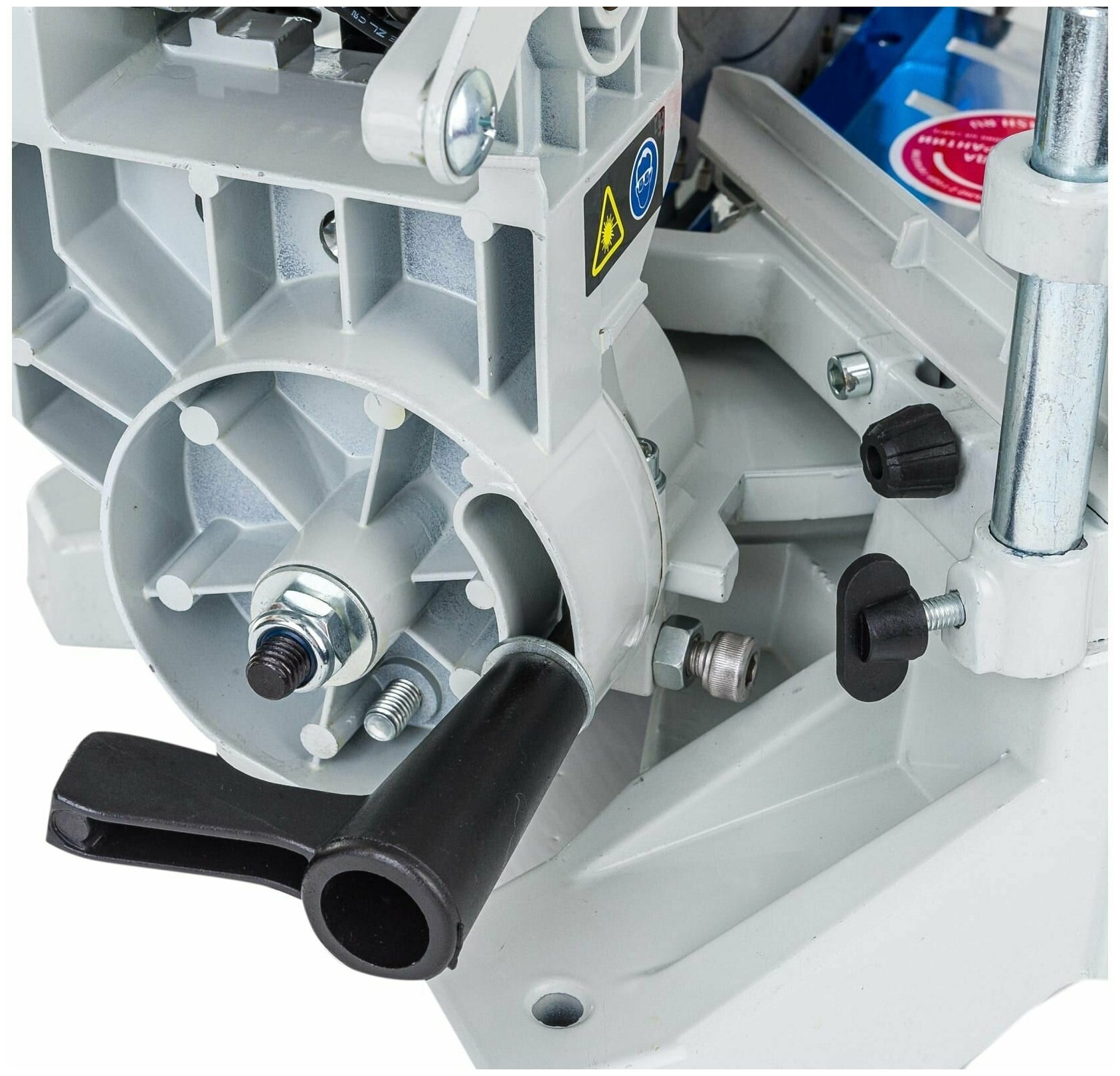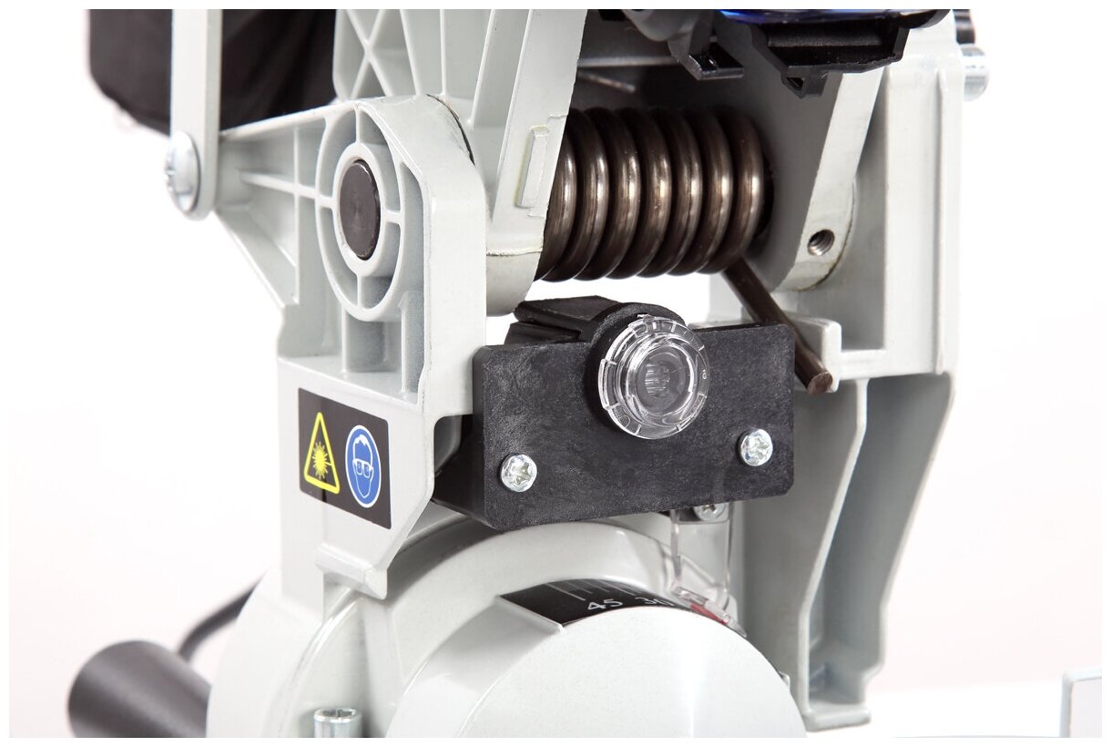 Специальный сплав обеспечивает легкость и прочность конструкции пилы. Режущая головка имеет возможность наклона до 45 градусов влево, защитный кожух закрывается автоматически. Стол поворотный. Для дополнительной точности предусмотрена лазерная направляющая. Замена диска осуществляется после нажатия кнопки блокировки шпинделя.