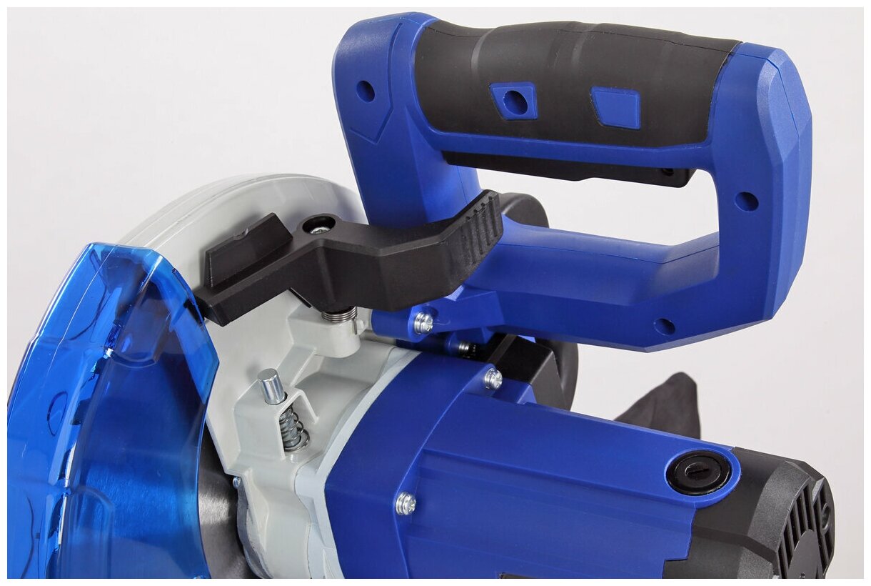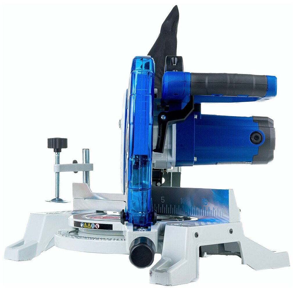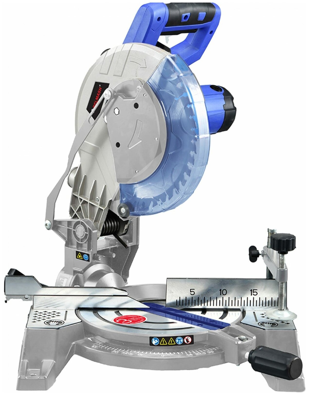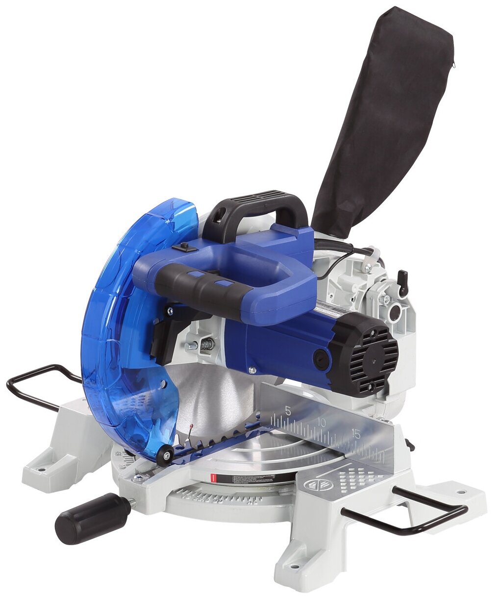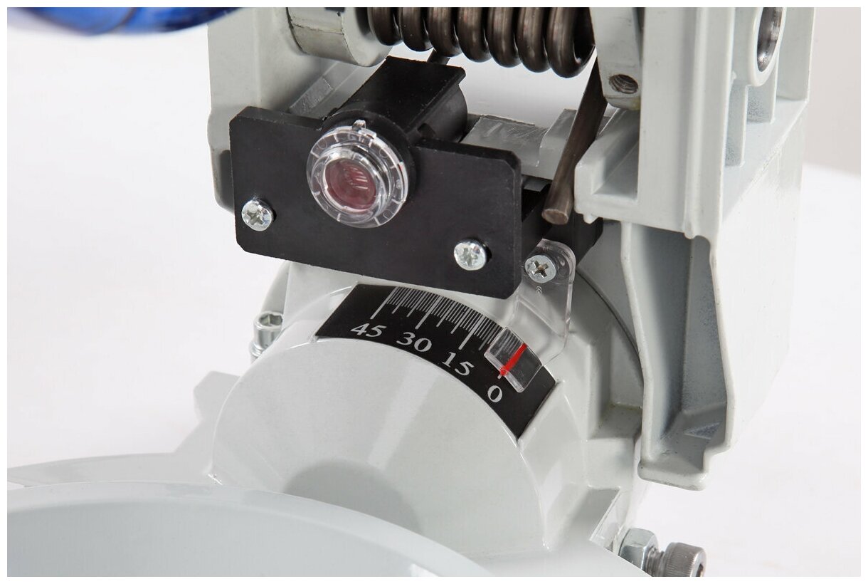 Специальный сплав обеспечивает легкость и прочность конструкции пилы. Режущая головка имеет возможность наклона до 45 градусов влево, защитный кожух закрывается автоматически. Стол поворотный. Для дополнительной точности предусмотрена лазерная направляющая. Замена диска осуществляется после нажатия кнопки блокировки шпинделя.