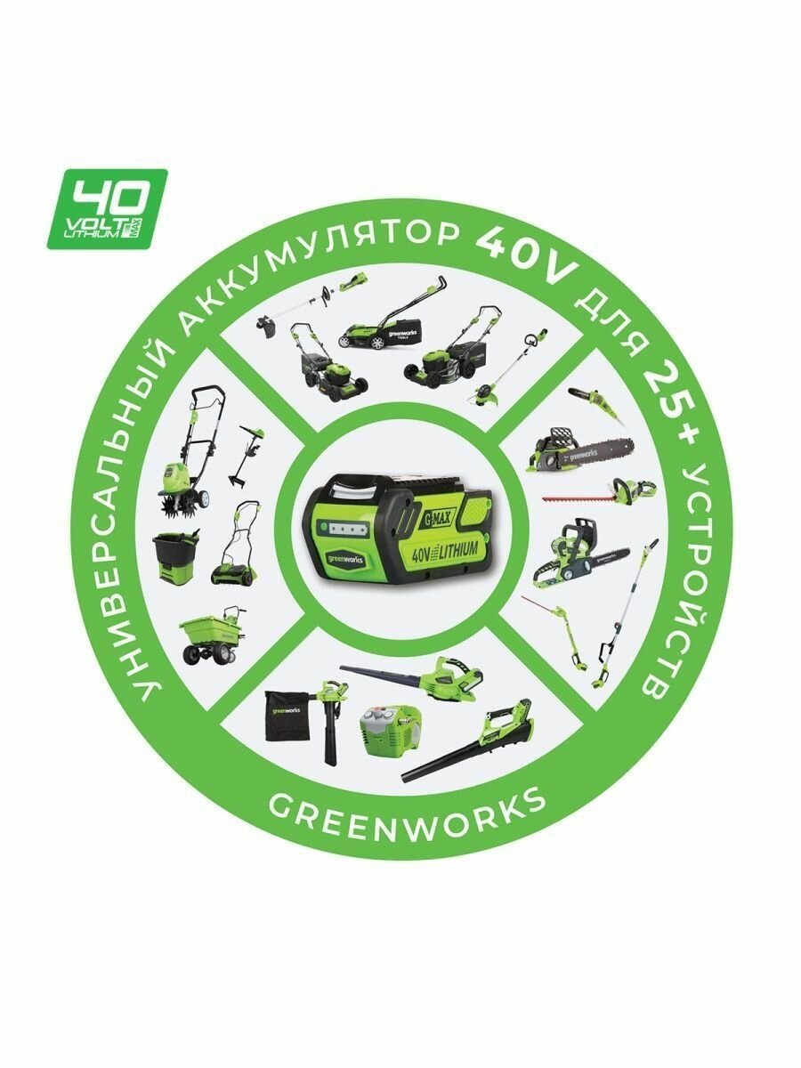 Комплект G40CS30IIK4 (Арт. 2007807UB), состоящий из цепной пилы аккумуляторной Greenworks (артикул 2007807) 40V, аккумулятора 40V 4А*ч и зарядного устройства. Цепная аккумуляторная пила Greenworks 40 вольт (артикул 2007807) - небольшая, легкая (всего 2,74 кг садовая пила. Благодаря ее компактным размерам она легко помещается в багажнике автомобиля или даже в рюкзаке. Это отличный выбор для подрезки толстого кустарника или сучков, пиления бревен, а также подойдет рыбакам, охотникам и любителям походов. Благодаря бесключевой системе фиксации, при монтаже/демонтаже/подтяжке цепи и шины не требуется специальный инструмент . Для удобства работы с пилой рукоятка прорезинена и имеет эргономичную форму. Система автоматической смазки продлит срок службы шины и цепи, а для контроля уровня масла бачок имеет прозрачный корпус. Для работы с этой пилой вам не нужно тратить время на подготовку масляно-бензиновой смеси, " дергать" стартер - пила готова к работе нажатием одной кнопки. Более того, так как двигатель электрический - он не требует обслуживания (например замену свечей, масла и фильтров), а также пила, не загрязняет воздух, меньше шумит и вибрирует, вы не дышите выхлопными газами. Для безопасности у пилы предусмотрен кнопка-предохранитель от случайного старта и щиток для защиты рук от порезов. Работа от 40V аккумулятора G-Max совместимого с другими устройствами из линейки 40V, что даёт существенную экономию. Спецификация: Скорость вращения без нагрузки: 4,2 м/сДлина пильной шины: 305 ммОстановка цепи: < 2 сПрозрачный масляный бачок 200 мл - для удобного контроля уровня масла; Паз цепи: 0,043”Безопасность: Кнопка- предохранитель от случайного старта, тормоз цепи. Крутящий момент: 0,2 НмПрорезиненная рукоятка; Без ключевая замена и натяжение цепи; Работа от 40V аккумулятора совместимого с другими устройствами из линейки 40V. Расширенная гарантия на инструмент 3 года. ПреимуществаНебольшой вес, низкие уровень шума и вибраций, абсолютная экологичность и простота эксплуатации; Позволяет работать в любом месте в отличии от инструмента с сетевым питанием; Компактная – легко помещается в багажнике или даже рюкзаке; Бесключевая фиксация – при монтаже/демонтаже цепи и шины, подтяжке цепи не требуется инструмент; Прорезиненная рукоятка; Предохранитель (кнопка блокировки) от случайного старта; Щиток для защиты рук; Работа от 24V аккумулятора совместимого с другими устройствами из линейки 24V. Расширенная гарантия на инструмент 3 года. Состав комплекта: аккумуляторная цепная пила 30 см арт. 2007807; аккумулятор Greenworks 40V 4A*ч; Зарядное Устройство Greenworks 40V; Руководство по эксплуатации; Гарантийный талон. Скорость вращения без нагрузки: 4,2 м/сДлина пильной шины: 305 мм (12"Остановка цепи: < 2 сМасляный резервуар: 200 млПаз шины: 1,1 мм (0,043”)Шаг цепи 3/8" Крутящий момент: 0,2 НмВес (без батареи): 2.74 кгАксессуары: 2947107 цепь, 2947007 шинаРабота от 40V аккумулятора совместимого с другими устройствами из линейки 40V.