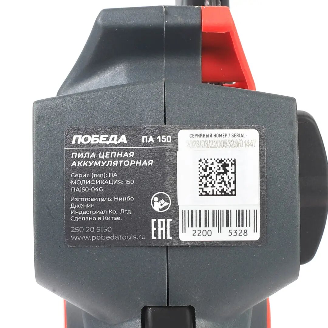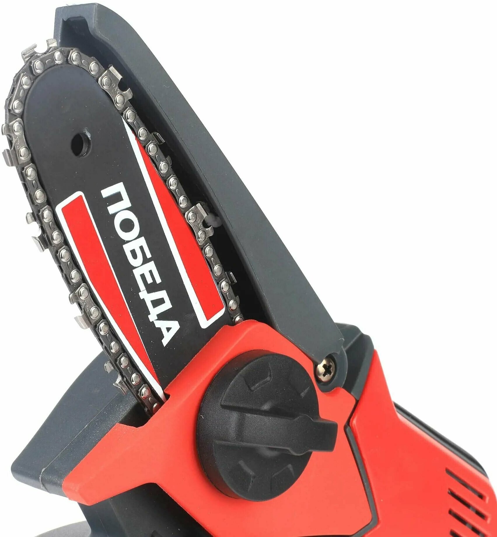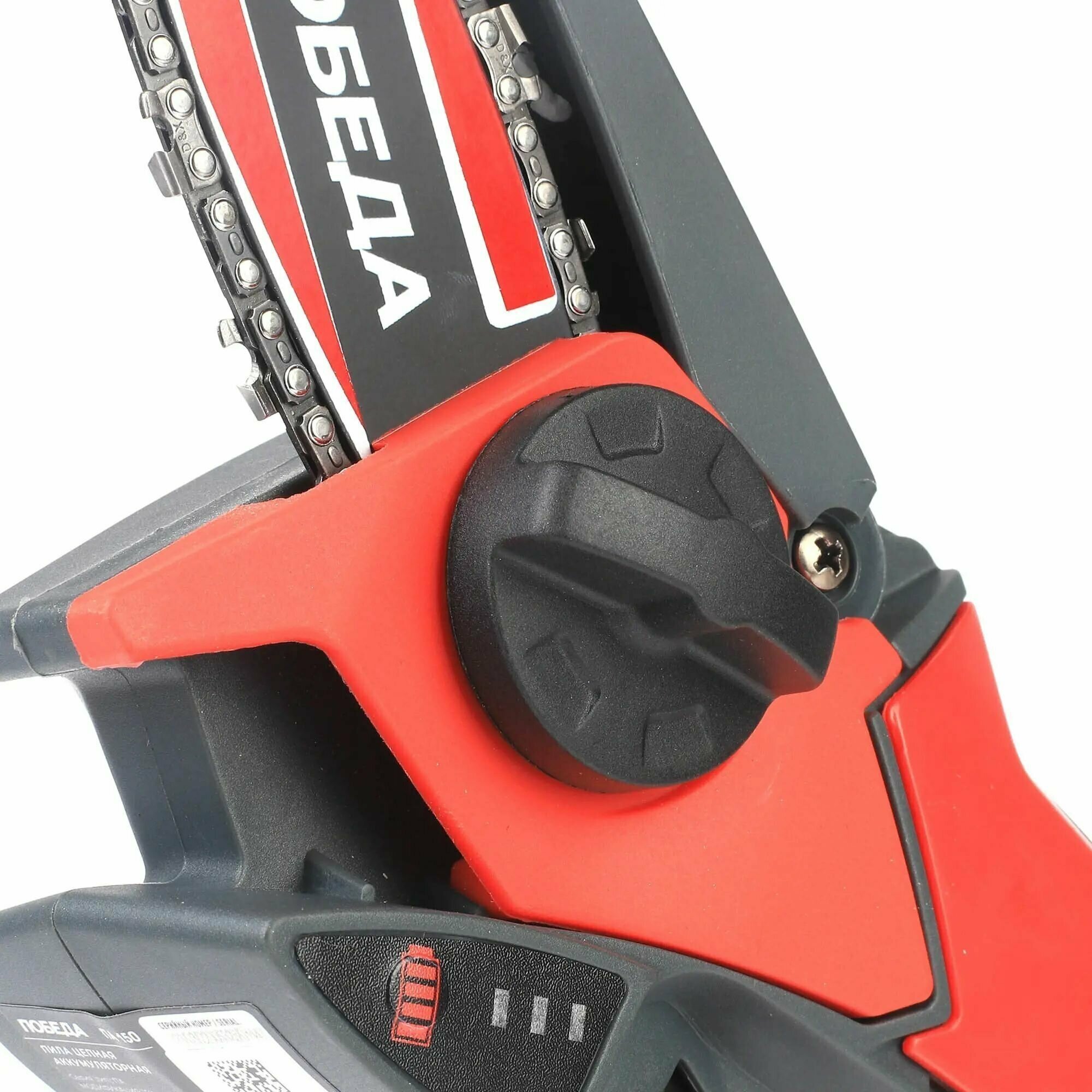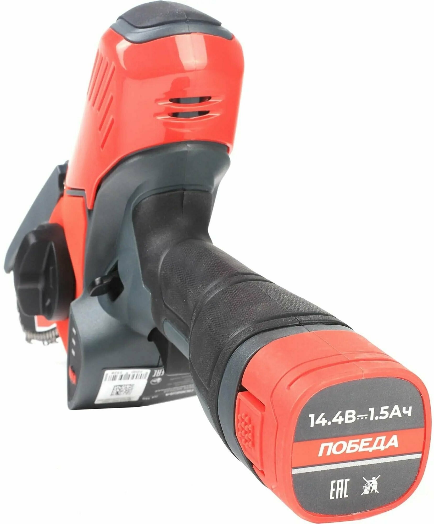 Цепная аккумуляторная пила Победа ПА 150 14.4 В предназначена для распилки древесины, обрезки сучьев и кустарника. Рукоятка имеет эргономическую конструкцию, обеспечивающую повышенный комфорт, баланс и более простое управление инструментом. Благодаря работе от аккумулятора модель имеет низкий уровень шума, небольшой вес и независима от источников электричества. Удобство регулировки натяжения цепи. Оснащена бесключевой системой фиксации, благодаря которой установить, подтянуть или демонтировать цепь можно без специальных инструментов. Преимущества Компактные размеры и небольшой весПростота эксплуатацииПила не выделяет вредных газов в атмосферу - экологичность и возможность использования в закрытых помещенияхБыстрое натяжение цепи - быстрая регулировка цепи без дополнительных приспособленийАккумулятор и зарядное устройство в комплекте Комплектация ПилаШина - 1 шт. Цепь - 1 шт. Аккумулятор - 1 шт. Зарядное устройство - 1 шт. Защитный кожух - 1 шт. Емкость для масла - 1 шт. ИнструкцияУпаковка Характеристики Тип аккумулятора: Li-ionЕмкость аккумулятора: 1.5 А*чКоличество аккумуляторов в комплекте: 1Тип двигателя: щеточныйРасположение двигателя: продольноеНапряжение: 14.4 ВКласс товара: БытовойКоличество звеньев: 28 штБесключевая регулировка натяжения цепи: даДлина шины: 4 дюймДлина шины: 10 смВес нетто: 1.7 кгНаличие тормоза: естьШирина паза: 1.1 ммШаг цепи: 1/4 дюймСкорость вращения цепи: 8 м/сПроизводительность с аккумулятором 1.5А*ч: 25 минут