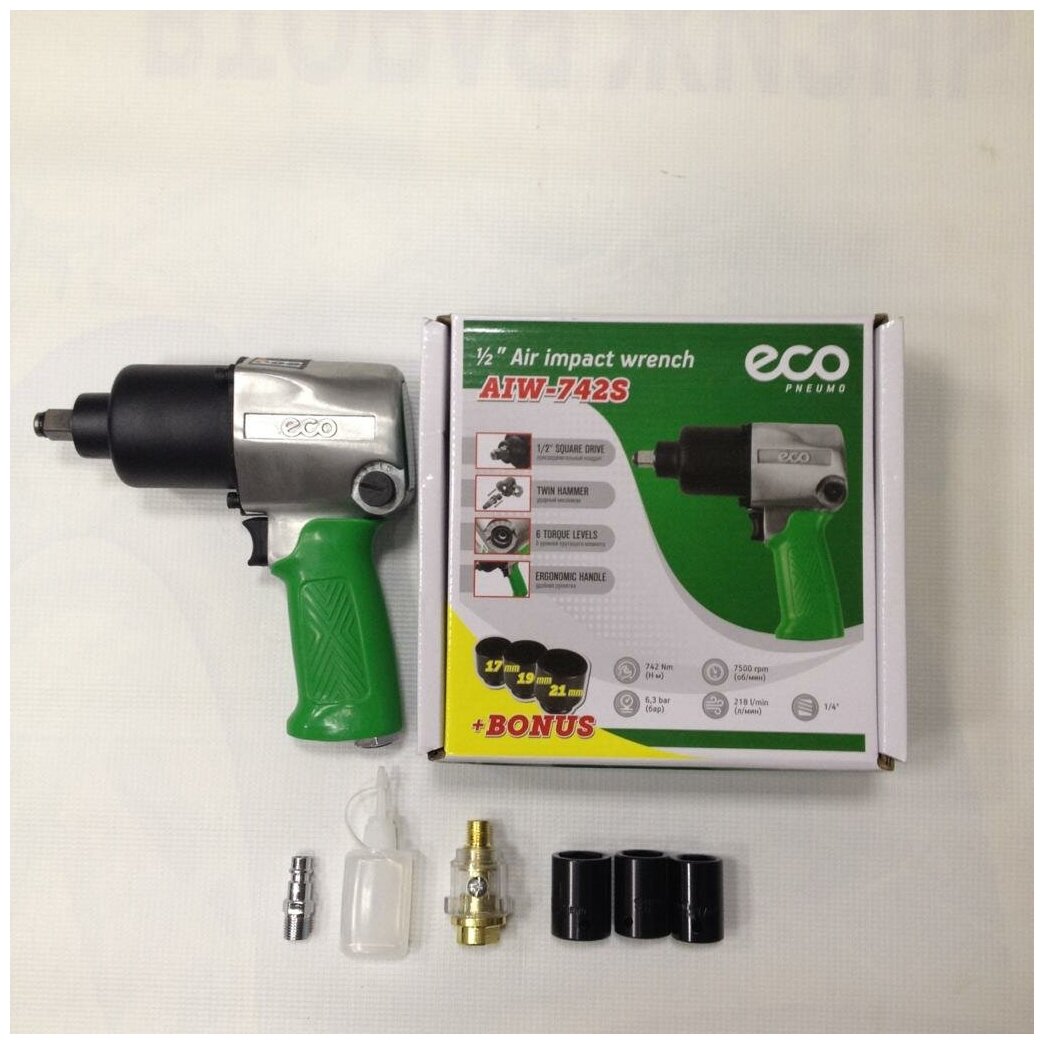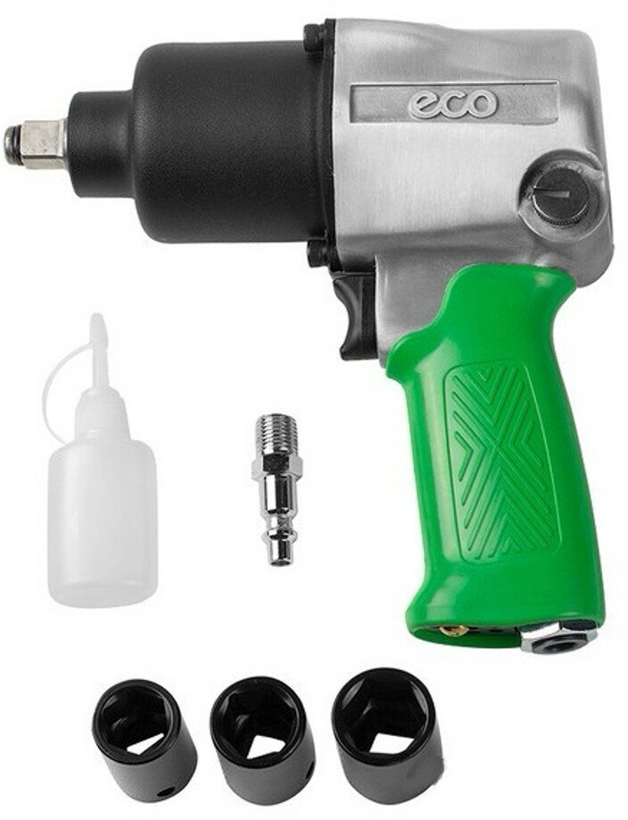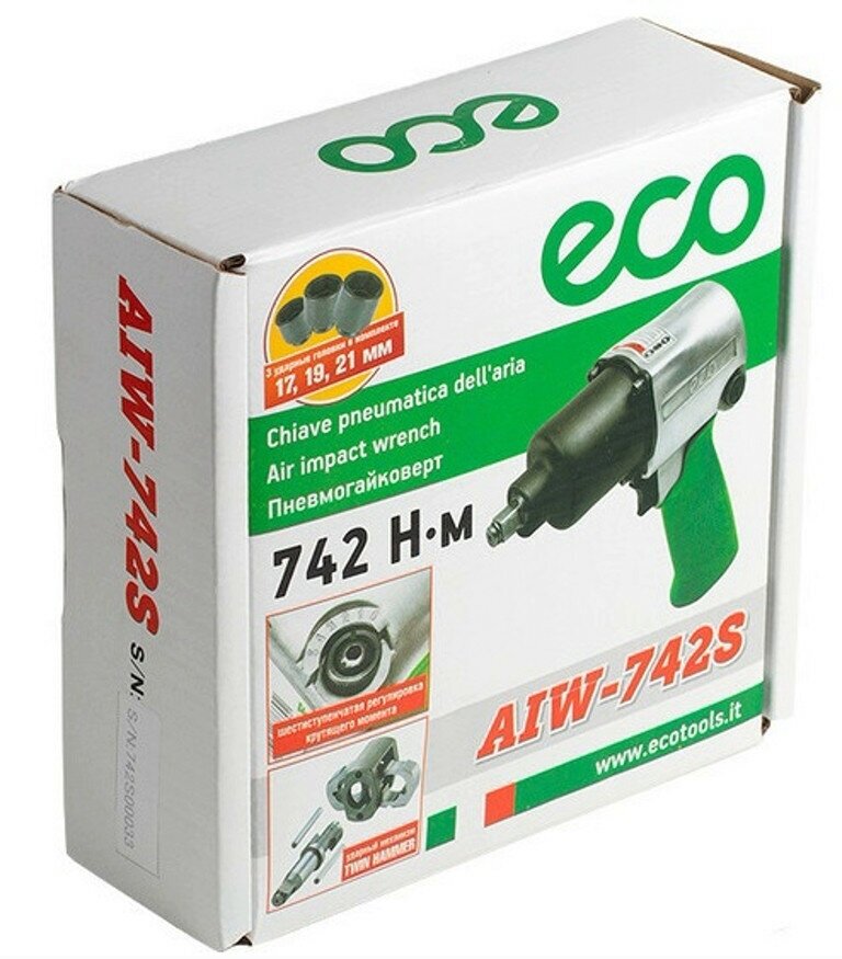 Пневмогайковерт Eco AIW-742S - это надежный и удобный инструмент для работы с резьбовыми соединениями. Он предназначен для отвинчивания и завинчивания гаек и болтов при помощи соответствующей сменной головки, что особенно важно при монтаже или демонтаже деталей в домашних или профессиональных мастерских. В комплекте с гайковертом идут набор сменных ударных головок различного размера, масленка и специальный штуцер, что делает его универсальным. Стальной корпус обеспечивает прочность и надежность инструмента, а шестиступенчатая регулировка крутящего момента помогает настроить оптимальный уровень усилия для каждой конкретной задачи. Эргономичная рукоятка пневмогайковерта имеет виброгасящую накладку, что обеспечивает удобство и комфорт при работе. Инструмент не требует подключения к сети питания и работает от сжатого воздуха, что позволяет использовать его в любом месте, где есть доступ к компрессору. Преимущества пневмогайковерта Eco AIW-742S: - Надежный и прочный стальной корпус. - Шестиступенчатая регулировка крутящего момента. - Удобная эргономичная рукоятка. - Набор сменных ударных головок в комплекте. - Наличие реверса. - Малый вес и компактный размер. Пневмогайковерт Эко AIW-742S станет незаменимым помощником в любой мастерской, позволяя быстро и эффективно выполнять работы по сборке и разборке резьбовых соединений.