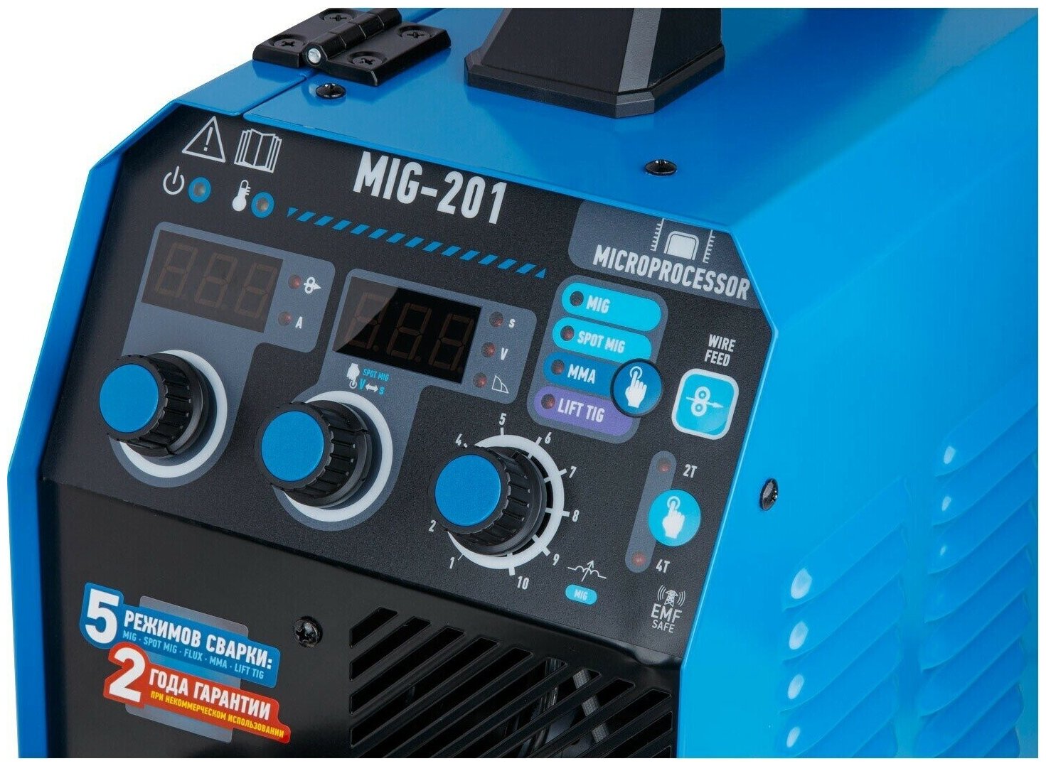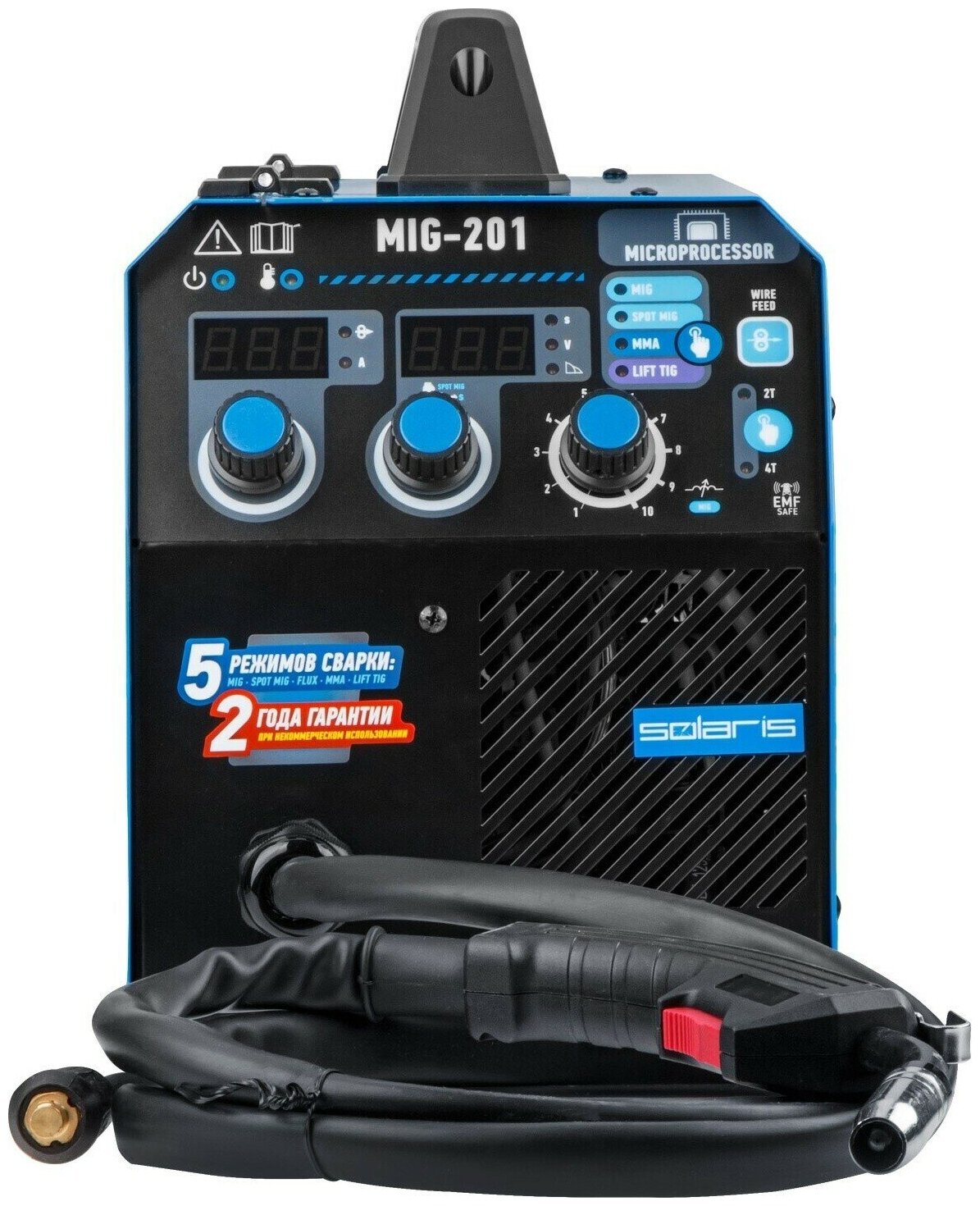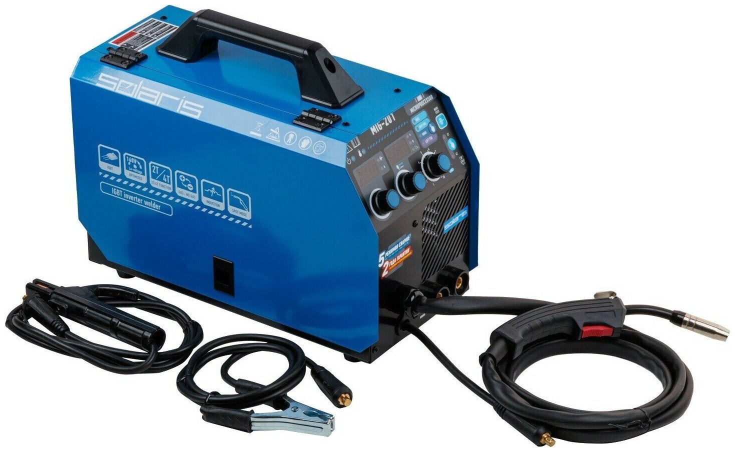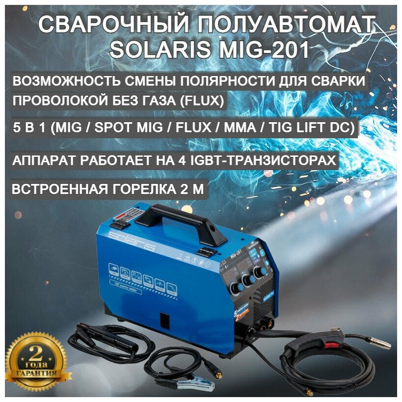 Встроенная горелка 2 м; - 5 в 1 (MIG / SPOT MIG / FLUX / MMA / TIG lift DC); - Микропроцессорное управление; - Аппарат работает на 4 IGBT-транзисторах, что делает его надежным решением; - Высокая продолжительность включения аппарата 60% при 20°С; - Размер устанавливаемой катушкидо 5 кг / 200 мм; - Кнопка подачи/заправки проволоки (без подачи напряжения) - безопасно для оператора; - Возможность смены полярности для сварки проволокой без газа (FLUX); - Стабильная работа в сетях с пониженным напряжением (от 160В); - Режим 2Т/4Т (для MIG); - Режим сварки SPOT (сварка точками с длительностью от 0,3 до 30 секунд); - Регулировка индуктивности дуги изменяет параметры глубины провара и формы валика сварочного шва; - Регулировка интенсивности форсажа дуги (MMA); - Сетевой кабель 2 м (без сетевой вилки); - Помехоподавляющий фильтр для защиты других устройств от помех. внимание! Аппарат поставляется без вилки. В случае работы на максимальных токах, аппарат необходимо оснащать силовой однофазной вилкой 32А 230В (не входит в комплект). Комплектация: Инверторный полуавтомат; Горелка сварочная 2 метра; Электрододержатель с кабелем 2 метра; Клемма заземления с кабелем 1,5 метра; Подающий ролик для проволоки 0,6-0,8 мм (установлен в механизм подачи проволоки);