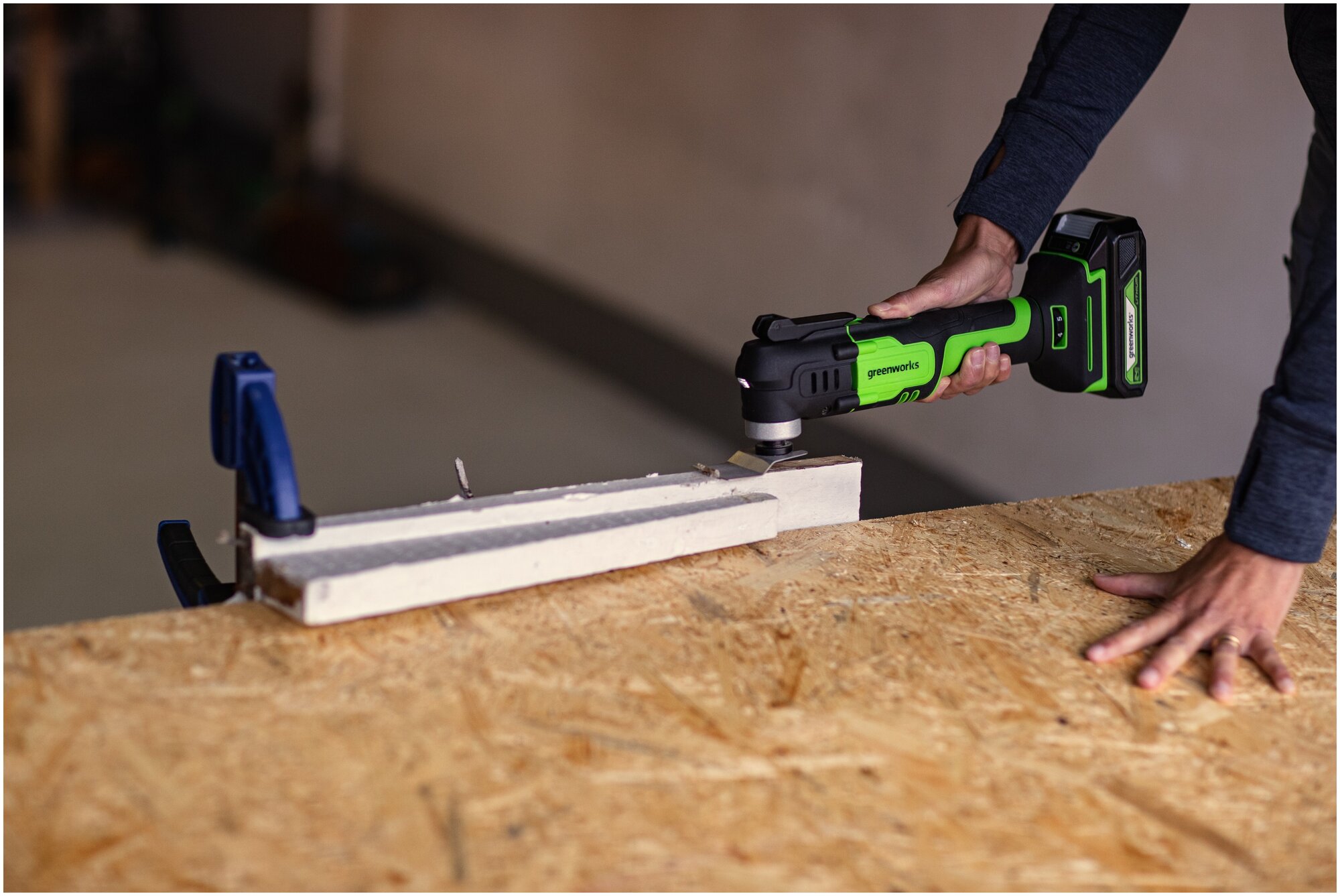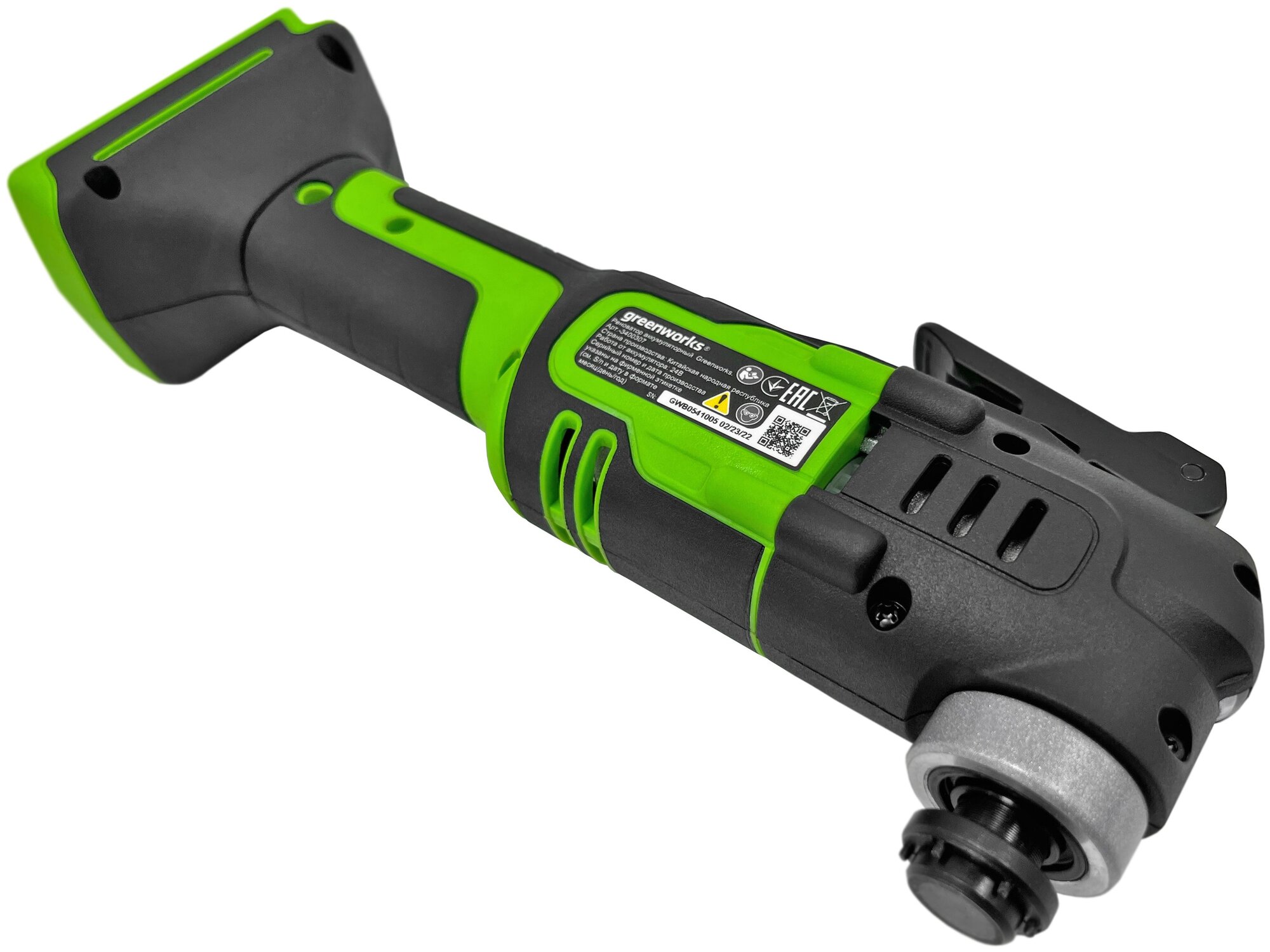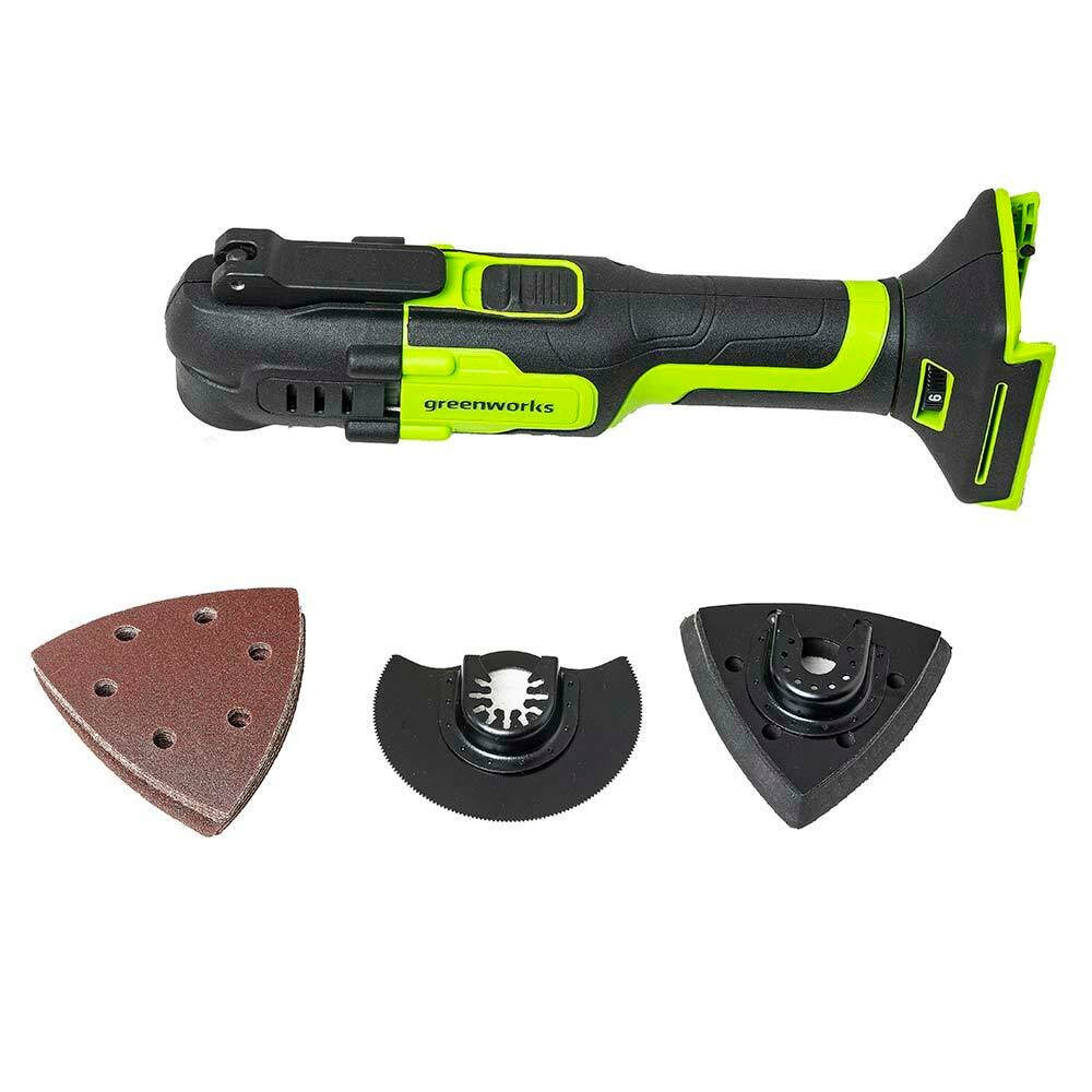 Реноватор аккумуляторный Greenworks, G24MT, (Арт. 3400307), 24 В, без АКБ и ЗУ - это многофункциональный инструмент для резки гипсокартона, металла, дерева, пластика, композитных материалов. Также используется для чистой шлифовки. Позволяет быстро и легко производить погружное врезание в материал или резать заподлицо без повреждения его поверхности.