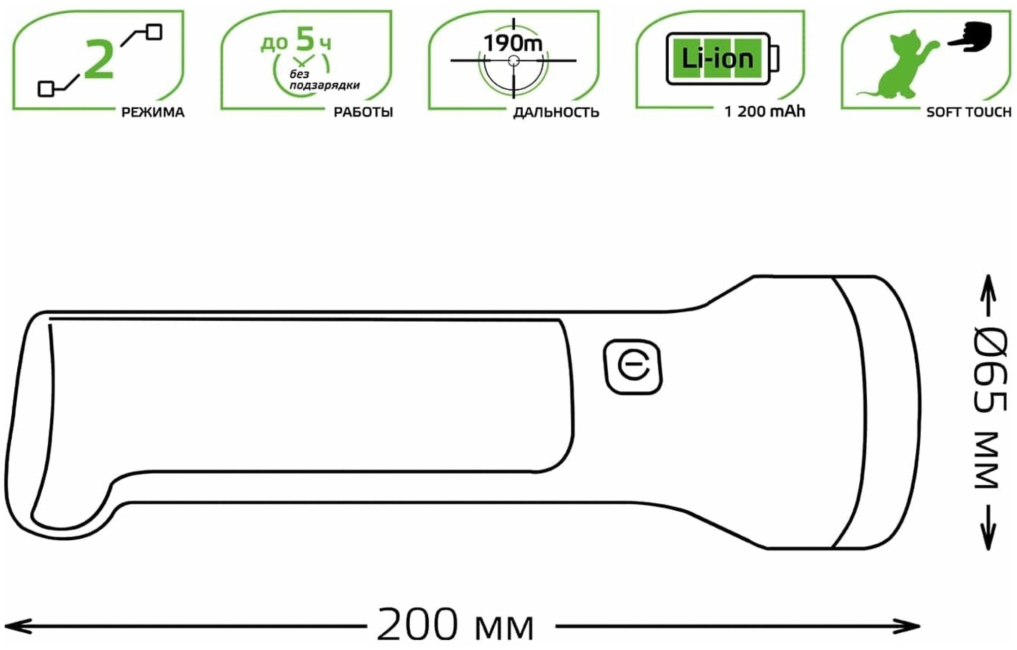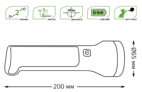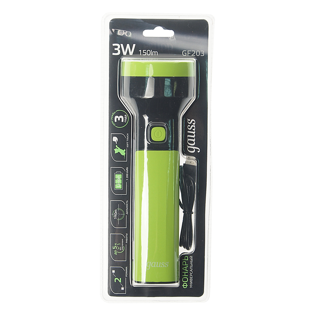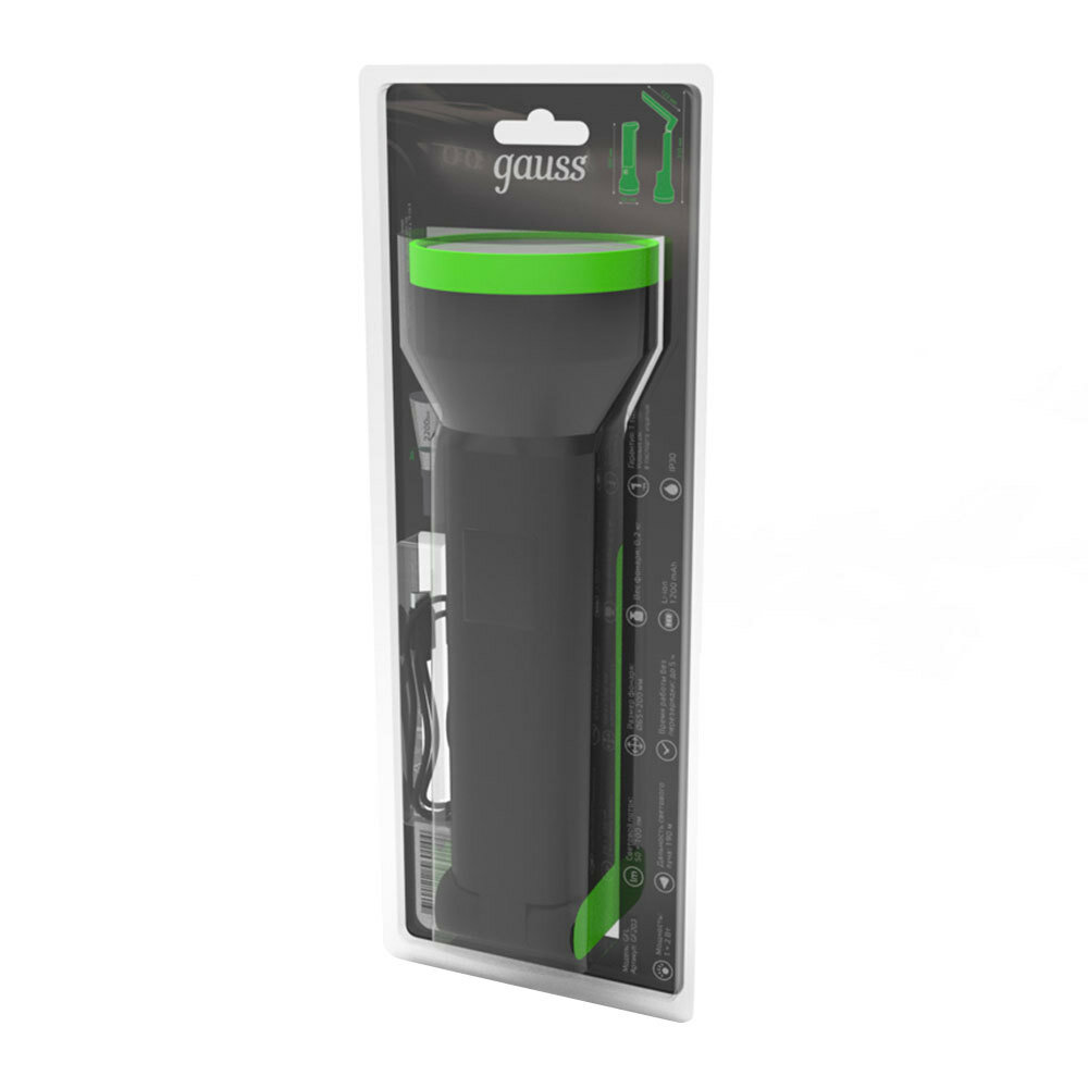 Фонарь светодиодный ручной аккумуляторный Gauss GF203 (1 + 2 Вт, 50 + 100 лм, Li-ion 1200 мА*ч, USB, IP30) Универсальный светодиодный фонарь Gauss GF203 с двумя источниками освещения работает от аккумулятора. Заряжается через USB разъем (шнур в комлпекте). Дополнительная раскладная панель позволяет использовать фонарь в качестве небольшого настольного светильника. Преимущества Легкий. Компактный. Мощный дальний свет. Размеры Материалы и цвета Тип рассеивателя основного фонаря прозрачный Цвет корпуса Черный, Зеленый Материал корпуса пластик Функциональные возможности Режимы работы: Первое нажатие - основной фонарь (максимальная мощность). Второе нажатие - раскладная панель (максимальная мощность). Технические характеристики Тип изделия фонарь ручной Источник света светодиоды Исполнение основной фонарь + раскладная панель Мощность фонаря, Вт 1 + 2 Световой поток, лм 50 + 100 Количество режимов работы 2 Полезная дальность светового луча прожектора, м 190 Номинальное время работы, минут 300 Питание встроенный аккумулятор Тип аккумулятора литий-ионный Емкость аккумулятора, мА*ч. 1200 Напряжение аккумулятора, В 3,7 Зарядка аккумулятора через USB разъем Время зарядки аккумулятора, час. 2 - 4* Температура эксплуатации, °C -10. +40 Степень защиты от пыли и влаги IP30 Срок службы светодиодов, часов 35000 Вес изделия, г 155 В комплекте шнур USB 0,5 м * Время зарядки аккумулятора зависит от выходного тока USB разъема устройства, с которого происходит зарядка. Например, если ток обычного USB разъема ноутбука составляет 500 мА, время заряда аккумулятора составит 4 часа; если ток встроенного USB разъема в бортовой сети автомобиля и зарядного устройства для телефона составляет 1000 мА, время заряда аккумулятора составит 2 часа. Правила эксплуатации Рекомендуется перед первым использованием фонаря провести полную зарядку встроенного аккумулятора. Для продолжительной и надежной работы фонаря необходимо следить за состоянием аккумуляторной батареи: не реже чем раз в 6 месяцев проводить подзарядку батареи, не оставлять батарею разряженной. Для подзарядки фонарь необходимо выключить и подключить к USB разъему (5 В) с помощью шнура (в комплекте).