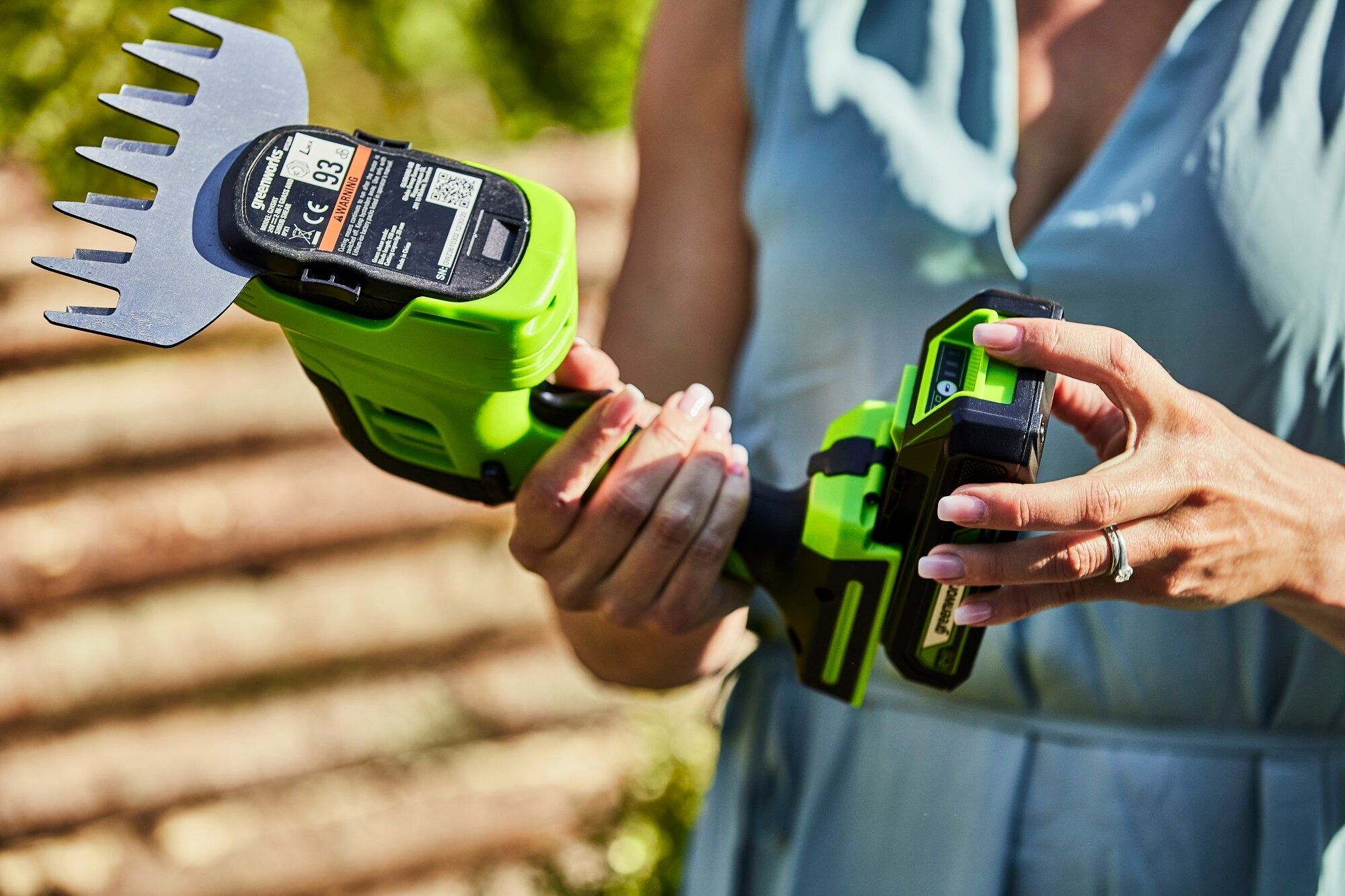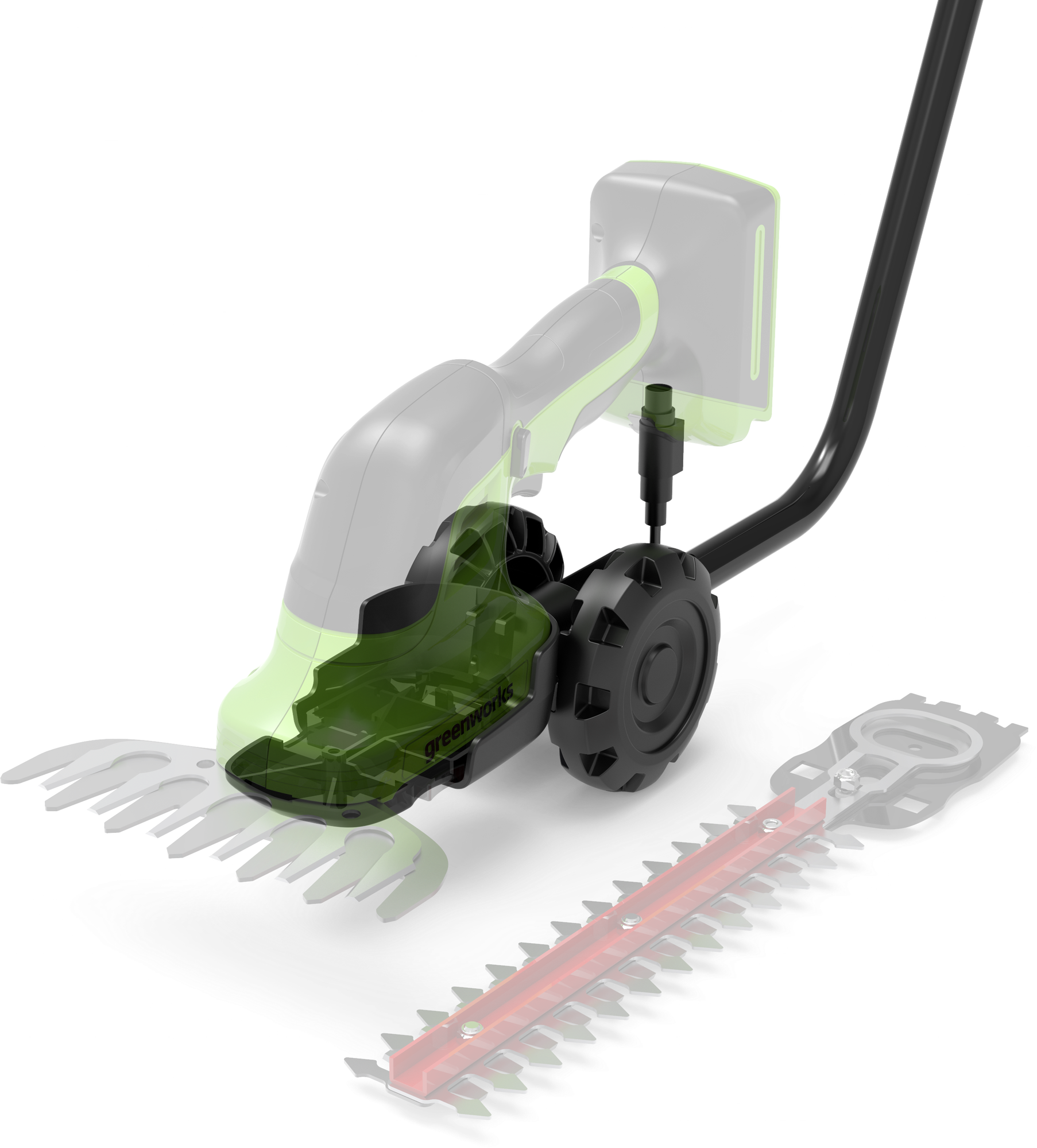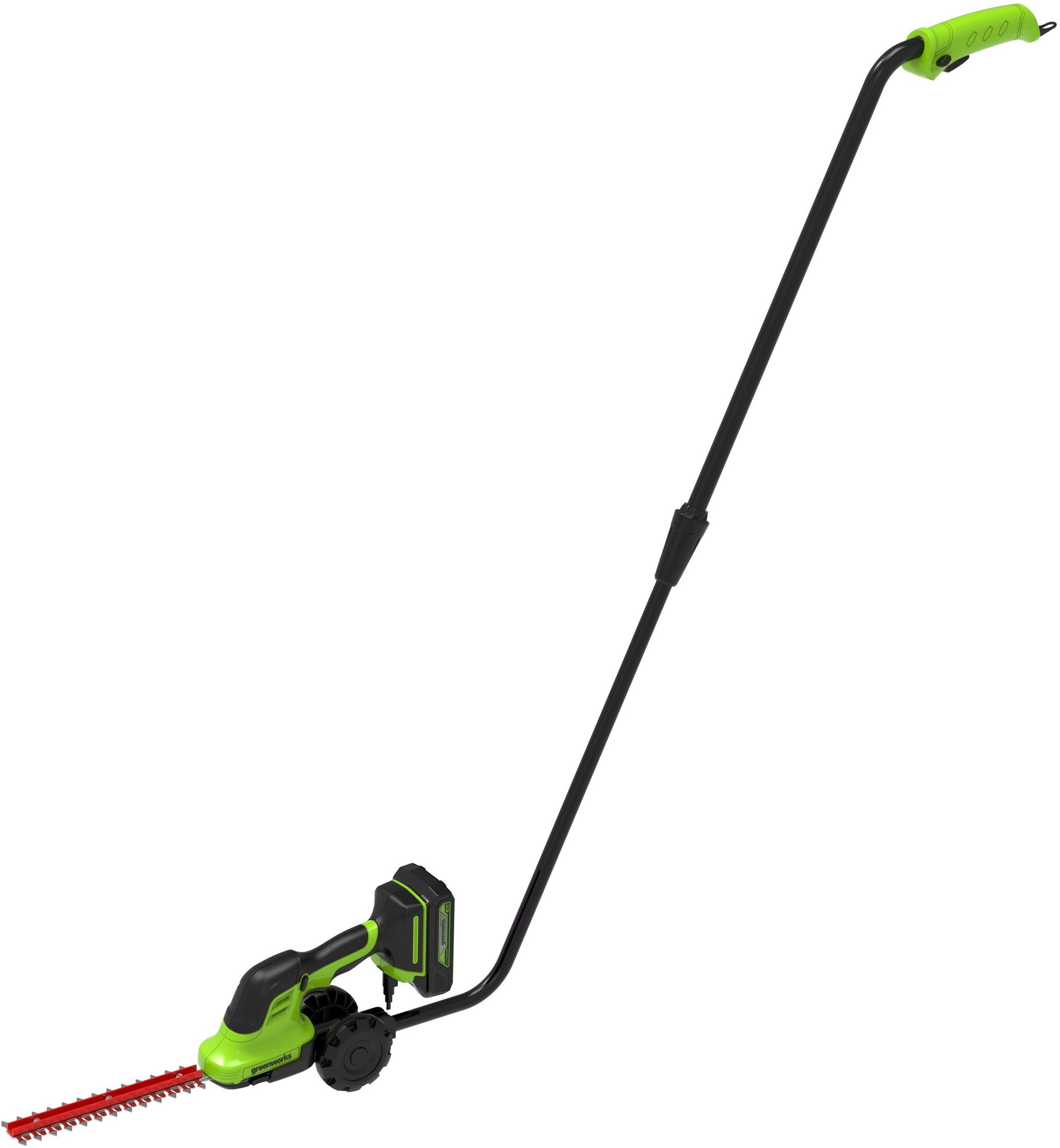 GreenWorks G24SHT 1600607 работает от аккумуляторной батареи 24V, которую можно использовать с другими устройствами линейки 24V