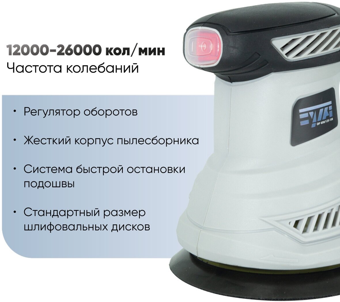 Орбитальная шлифовальная машина булат подходит для грубой и финишной обработки поверхностей. Электронная регулировка частоты вращения позволяет подобрать оптимальный рабочий режим для каждого материала. Система крепления шлифовальных кругов с помощью липучки обеспечивает их быструю и легкую замену. Особенности: Система быстрой остановки подошвы Стандартный размер шлифовальных дисков Жесткий корпус пылесборника Нескользящая рукоять Две сменные подошвы 125 и 150 мм Комплектация 2 шлифовальных листа; Пылесборник. Характеристики Тип Шлифмашина эксцентриковая Макс. диаметр диска, мм 125 Вид питания От сети 220В Длина шнура питания, м 2 Конструктивные особенности Пылесборник Макс. обороты, об./мин 6000 Ход шлифплатформы, мм 2 Страна-изготовитель Китай Макс. частота колебаний, кол./мин 26000
