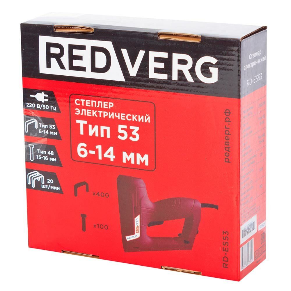 Степлер электрический RedVerg RD-ES53 используется для скрепления различных материалов: тканей, пленок, кожи, панелей, дерева, пластика и т. д. Конструкция модели позволяет работать как с П-образными скобами, так и с Т-образными гвоздями без шляпки (каркасный, паркетный). Особенности — Количество гвоздей в магазине до 80 шт. — Количество скоб в магазине до 100 шт. — Тип гвоздей 53, 47. Комплектация: СтеплерСкобы Тип 53, 14 мм — 400 шт. Гвозди Тип 48, 15 мм — 100 шт. Инструкция по эксплуатацииУпаковкаВнешний вид и/или характеристики товара могут быть изменены производителем в соответствии с производственным процессом.