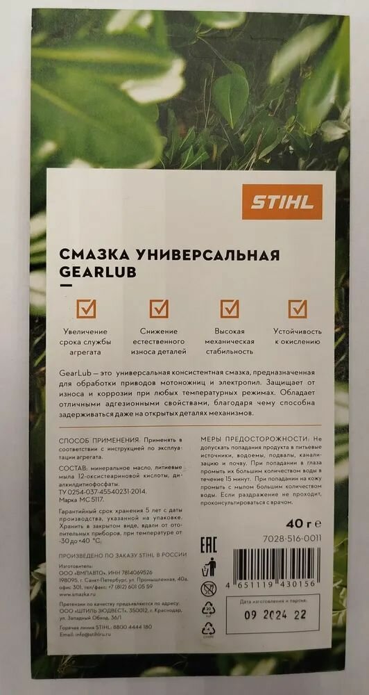 Универсальная смазка STIHL GearLub в упаковке 40 грамм — это надежное решение для поддержания вашего инструмента в идеальном состоянии. Этот продукт предназначен для всех, кто ценит долговечность и эффективность своих инструментов. Смазка оптимально подходит для различных применений в строительстве и ремонте, обеспечивая защиту от износа и коррозии.
