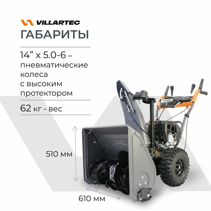 Снегоуборщики бензиновые VILLARTEC WB5561E являются самоходными, отличаются маневренностью и проходимостью. Шины снегоуборщика благодаря наличию крупного рисунка протектора обеспечивают надежное сцепление с обледеневшей поверхностью. Размер колеса составляет 13 дюймов.