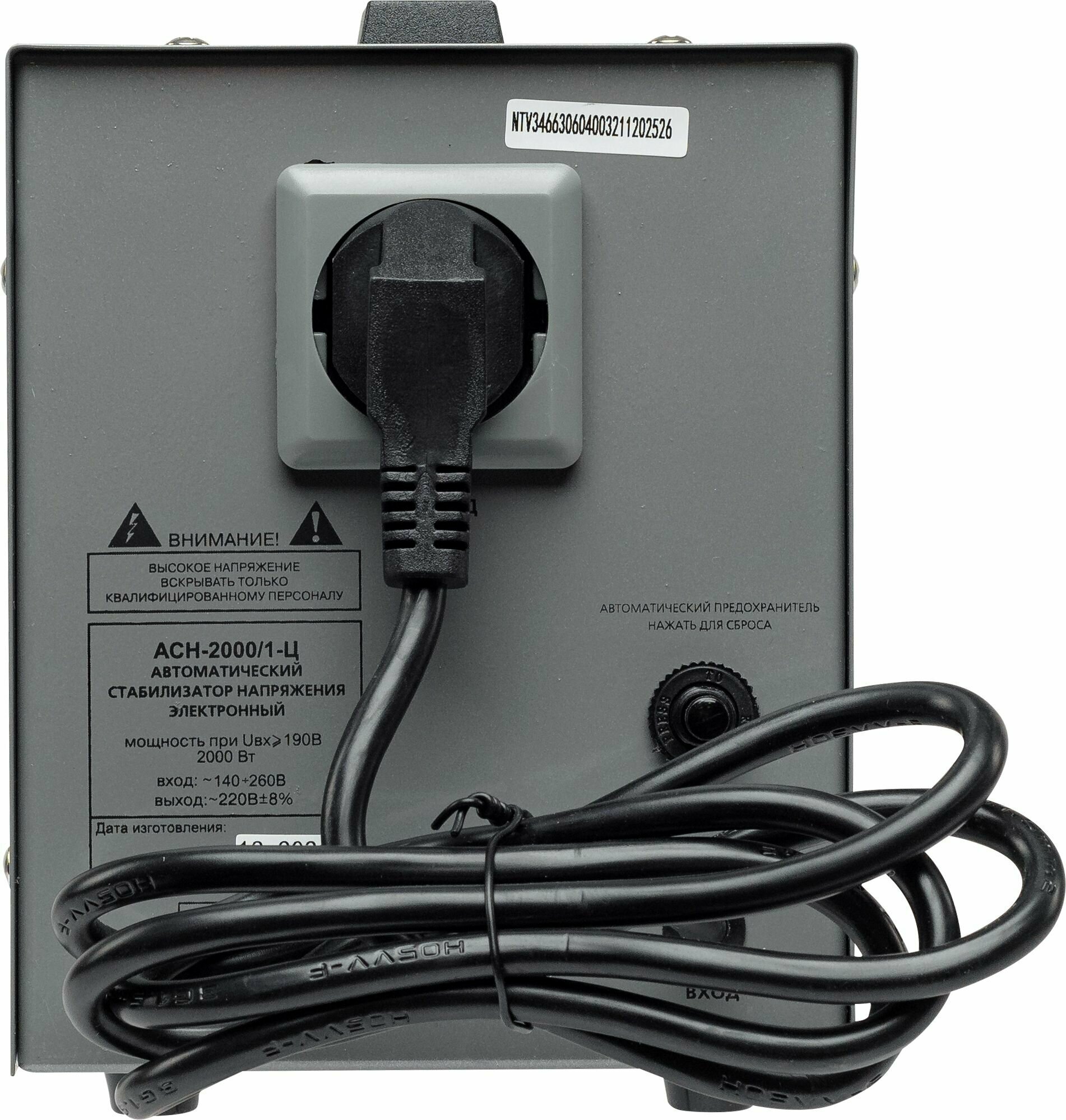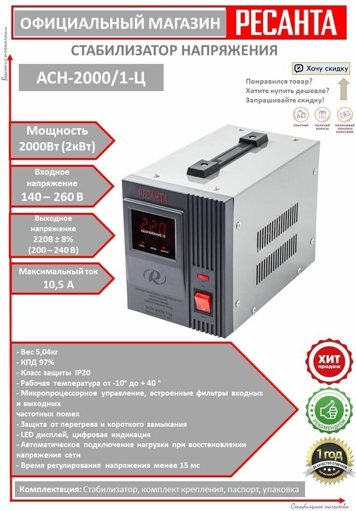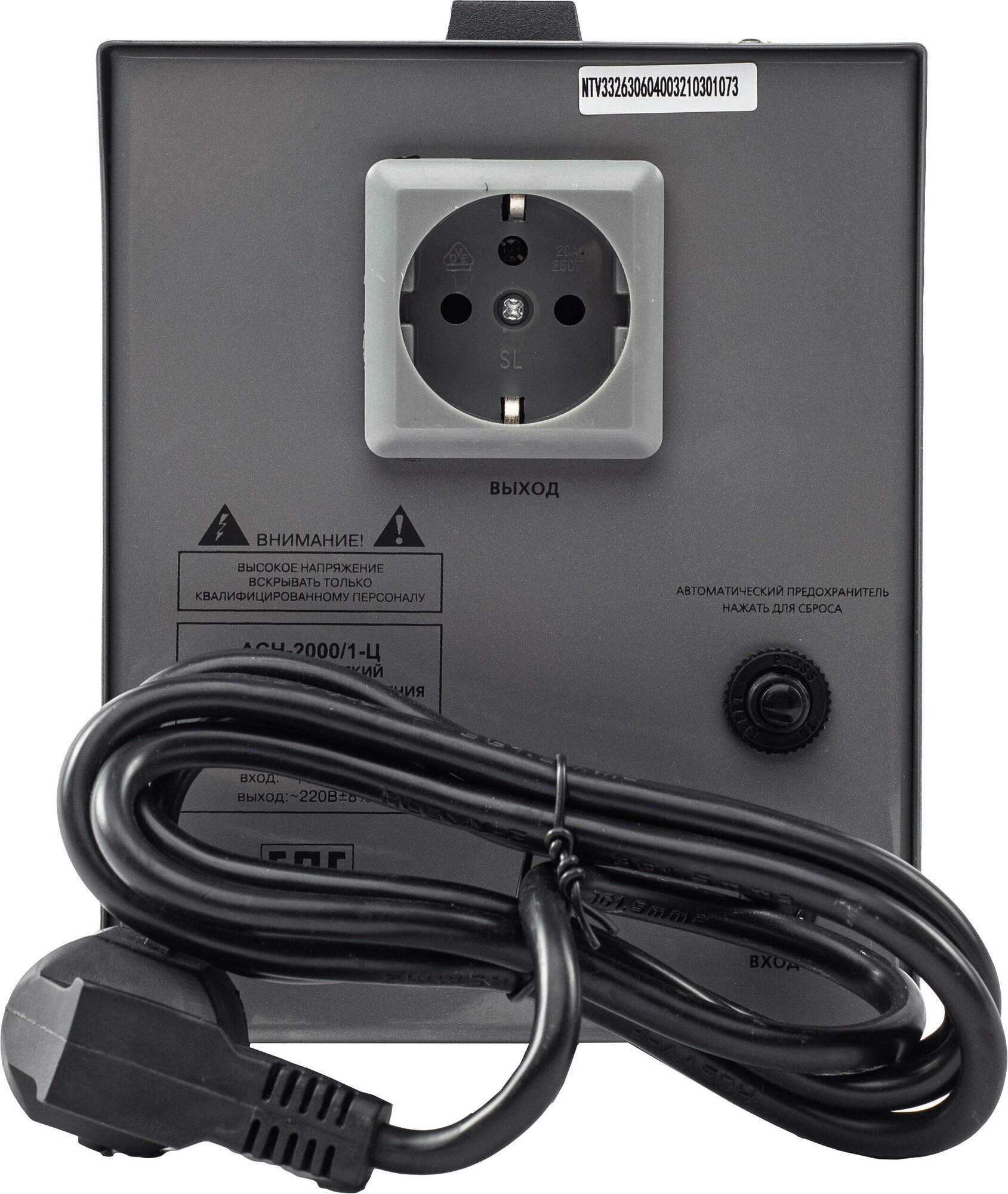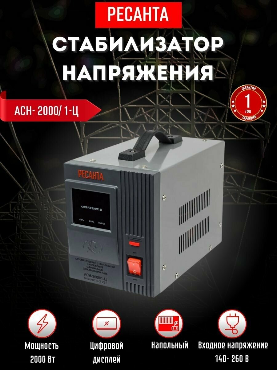 Стабилизатор напряжения Ресанта АСН 2000/1-Ц релейного типа предназначен для выравнивания входного напряжения и защиты приборов от перепадов напряжения с суммарной мощностью до 2 кВт. Работает с напряжением 220В с точностью до +/-8%. Устройство оснащено фильтрами сетевых помех, предотвращающими искажение частотной синусоиды, микропроцессорным управлением и цифровым индикатором напряжения, на котором отображаются параметры напряжения. Превышение пределов поддерживаемого входного напряжения автоматически отключает подачу питания. Прочный корпус защищает внутренние узлы аппарата от повреждений. Данный стабилизатор может обеспечивать стабильным питанием - телевизор, ресивер, DVD проигрыватель, кассовый аппарат, газовый котел. Принцип действия Регулировка напряжения происходит за счет переключения обмоток на трансформаторе при помощи реле. Поэтому данный вид стабилизаторов называется "релейный". Катушка в данном стабилизаторе разделена отводами на 4 части, каждый отвод подсоединён к своему реле (разница между реле до 30В). Регулировка происходит как бы перепрыгиванием с отвода на отвод, пропуская часть витков (осуществляется ступенчатая регулировка), за счёт этого погрешность выходного напряжения в данном стабилизаторе возрастает до 8%, т. е. 17,6В. Т. к. регулировка в данном стабилизаторе осуществляется путём переключения реле (реле имеет принцип выключателя), за счёт этого время регулировки в данном стабилизаторе минимально и составляет 20-35 мсек, т. е. менее 1 секунды. Стабилизатор релейного типа за счет своего принципа работы позволяет моментально реагировать даже на самые значительные и частые изменения напряжения в сети и предотвратить выход оборудования из строя. Номинальная мощность при входящем напряжении 190В составляет 2000Вт. Количество фаз = 1. Защита стабилизатора - Защита от выхода напряжения за пределы рабочего диапазона стабилизатора (рабочий диапазон стабилизатора от 140 до 260 В). - Термозащита (тепловая защита) позволяет выключиться стабилизатору при превышении его мощности нагрузки над мощностью самого устройства. Преимущества стабилизатора - Встроенные фильтры входных и выходных частотных помех; - Автоматическое отключение питания при превышении предельного значения напряжения; - Широкий диапазон поддерживаемого входного напряжения; - При кратковременных перегрузках прибор не выключается; - Автоматическое включение при выравнивании напряжения в пределах рабочего диапазона; - Микропроцессорное управление; - Цифровой дисплей; - Эргономичный и компактный; - Высокая скорость срабатывания защиты; - Наличие кнопки смены отображения исходящего напряжения на входящее; - Время регулирования напряжения минимально и составляет менее 15 мсек. т. е. менее 1 секунды; - №1 на рынке России. В наличии