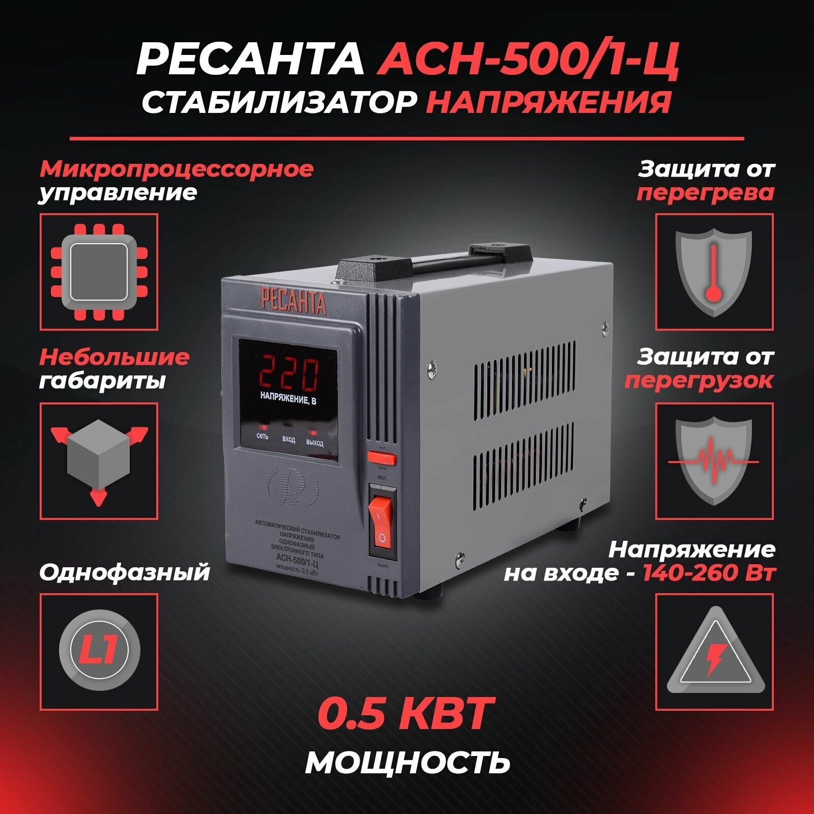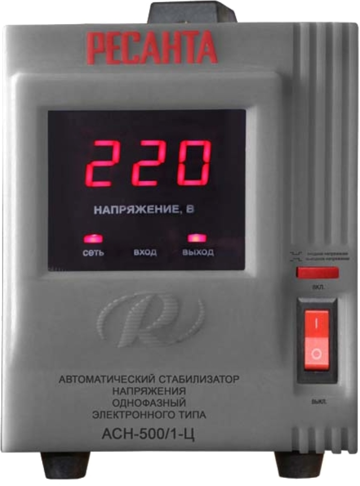 Стабилизатор напряжения Ресанта АСН-500/1-Ц позволяет защитить бытовую технику и электронику от выхода из строя из-за скачков напряжения. Обеспечивает стабильное выходное напряжение вне зависимости от параметров сети. Может использовать для телевизора, компьютера, газового котла и других устройств. Суммарная мощность подключенных приборов не должна превышать 500 Вт. Поддерживает широкий диапазон входного напряжения – от 140 до 260 В. В случае превышения максимально допустимого значения устройство автоматически отключает подачу напряжения.