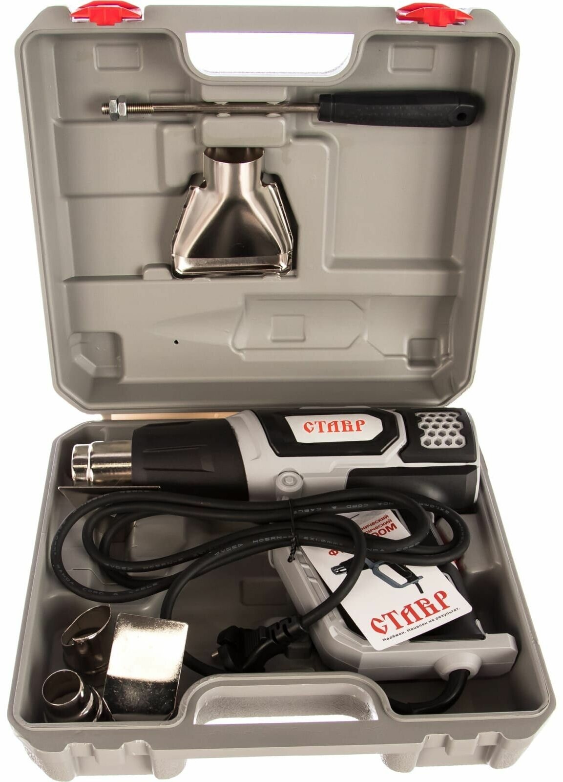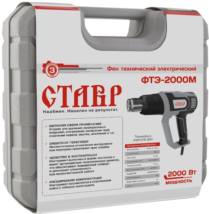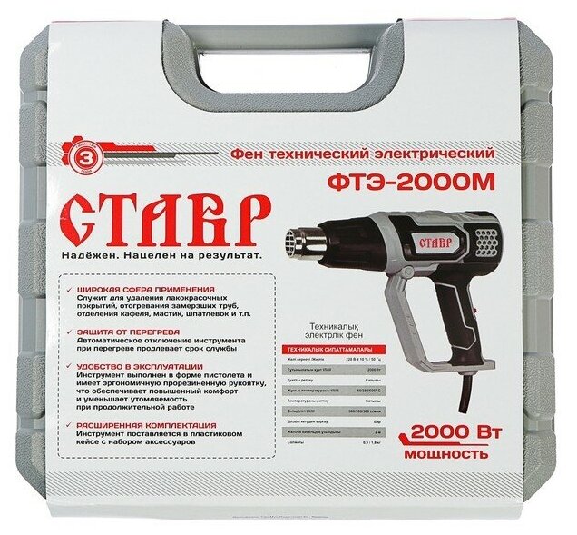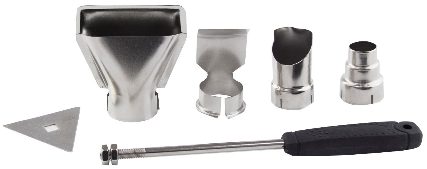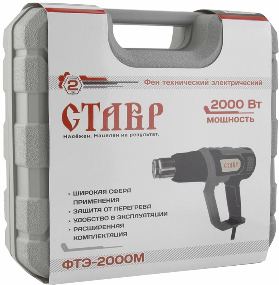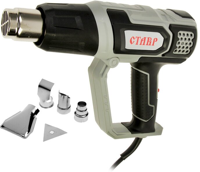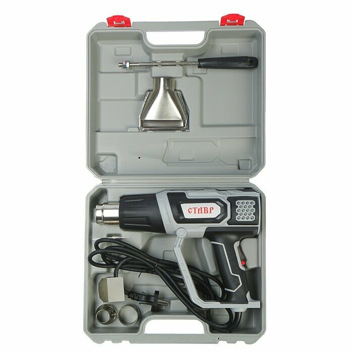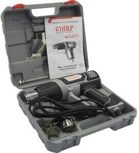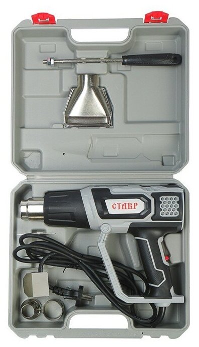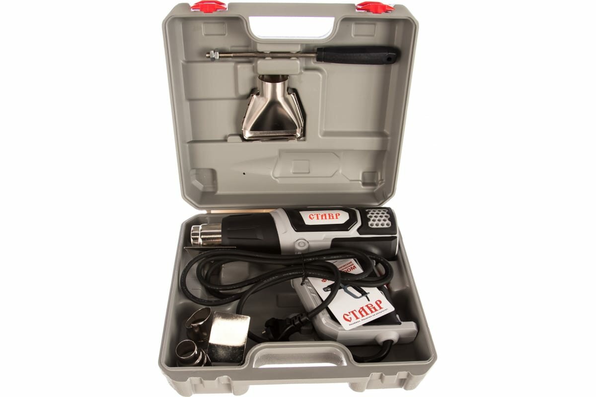 Широкая сфера применения: Служит для удаления лакокрасочных покрытий, отогревания замерзших металлических труб, отделения кафеля, мастик и шпатлевок и т. п. защита от перегрева: Автоматическое отключение инструмента при перегревании продлевает срок службы. Удобство В эксплуатации: Инструмент выполнен в форме пистолета и имеет эргономичную прорезиненную рукоятку, что обеспечивает повышенный комфорт и уменьшает утомляемость при продолжительной работе. Комплектация: Насадка (4 шт.), скребок треугольный (1 шт.), держатель скребка (1 шт), пластиковый кейс.