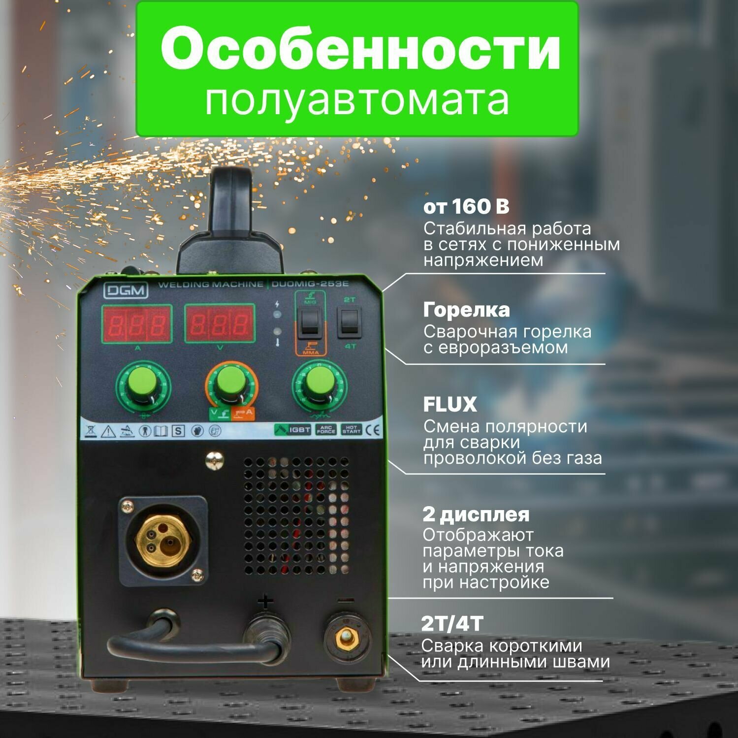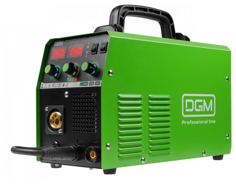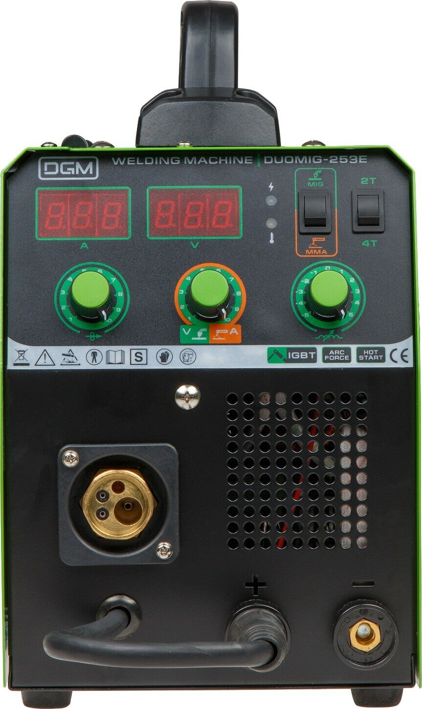 Преимущества: - 2-в-1 - полуавтоматическая сварка и ручная сварка электродами; - cварочная горелка с евроразъемом в комплекте; - кабель смены полярности для сварки в среде защитных газов или порошковой проволокой FLUX; - 2 дисплея - отображают параметры тока и напряжения при настройке, а также выводят измеренные значения при сварке. - для полуавтоматической сварки: режимы 2T/4T; - регулировка динамики дуги для режима MIG; - максимальный размер катушки с проволокой - 5 кг/200 мм; - Сетевой кабель 2 м (без сетевой вилки); - Помехоподавляющий фильтр для защиты других устройств от помех; - Работает при нестабильной сети от 160 В. Внимание! Аппарат поставляется без вилки. В случае работы на максимальных токах, аппарат необходимо оснащать силовой однофазной вилкой 32А 230В (не входит в комплект). --- Технические характеристики: Напряжение питающей сети: 160-240 В; Частота питающей сети: 50/60 Гц; Тип сети: 1 фаза; Напряжение холостого хода: 65 В; Сварочный ток (МIG)250 A/25,5 В; Сварочный ток (MMA)200 A/28 В; Диапазон сварочного тока: 30-250 A; Рабочий цикл (ПВ) на макс. токе: ; 40°С (IEC 60974-1): 20 %; 20°С: 60%; Номинальный ток на входе:15,1 A; Максимальный допустимый ток на входе: 33.8 А; Номин. потребл. мощность при макс. токе: 4,3 кВт; Диаметр проволоки: 0,6 - 1,0 мм; Диаметр электродов: 1.6 - 4.0 мм; Эффективность: 0,91; Фактор мощности: COS 0,87; Класс изоляции: H; Класс защиты: IP21S; Газовый штуцер: 8 мм; Вилка сетевая в комплекте: нет; Масса (без принадлежностей): 9,3 кг; Масса (с принадлежностями): 13 кг; Гарантийный срок: 12 месяцев; --- Комплектация: Полуавтомат сварочный; Горелка сварочная MIG - 3 метра; Клемма заземления - 1,2 метра; Электрододержатель MMA - 1,2 метра; Щиток сварщика; Щетка для удаления шлака; Руководство по эксплуатации. --- Совместимые товары: WM-6110 Антипригарный спрей SOLARIS; WA-2430 Ролик подающий 0,6-0,8 мм (для омедн, нерж. пров-ки) ; WA-2431 Ролик подающий 0,8-1,0 мм (для омедн, нерж. пров-ки) ; WA-2432 Ролик подающий 0,8-1,0 мм (для флюсов. пров-ки) ; WA-2433 Ролик подающий 0,8-1,0 мм (для алюминия) ; SL1537-9 Горелка MIG/MAG Solaris WG-15 (3 метра) ; WG-15AK3 Горелка MIG/MAG Solaris WG-15AK (3 метра) ; WG-15AK5 Горелка MIG/MAG Solaris WG-15AK (5 метров) ; WA-3477 Пружина горелки ; WA-3473 Сопло горелки ; WA-3474 Наконечник контактный Ф 0.6 мм M6х25 мм E-Cu (набор 5 шт) SOLARIS; WA-3475 Наконечник контактный Ф 0.8 мм M6х25 мм E-Cu (набор 5 шт) SOLARIS; WA-3476 Наконечник контактный Ф 1.0 мм M6х25 мм E-Cu (набор 5 шт) SOLARIS; WA-3479 Шейка (гусак) горелки ; WA-3480 Спиральный канал для проволоки 0,8-1,0 мм для горелки 3 м ; WA-2475 Разъем сварочный (на передней панели аппарата) ; WA-2473 Разъем сварочный (для сварочного кабеля) ; 33963 Вилка силовая 32 А промышл; ВП32-922 Вилка силовая 32 А промышл; JP7602-01 Вилка 16 А (не подходит для работы на макс токах); SQ0612-0001 Вилка 16 А (не подходит для работы на макс токах); ---