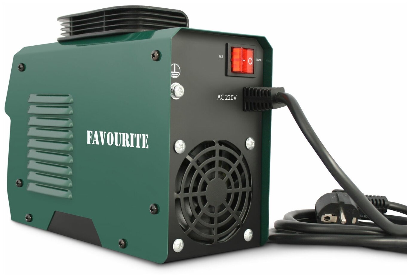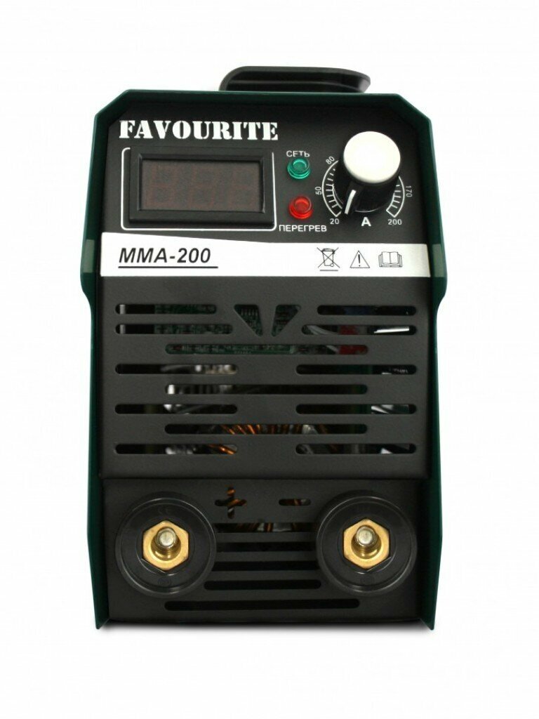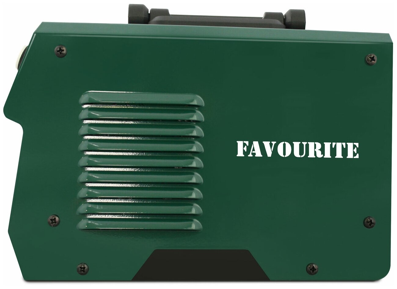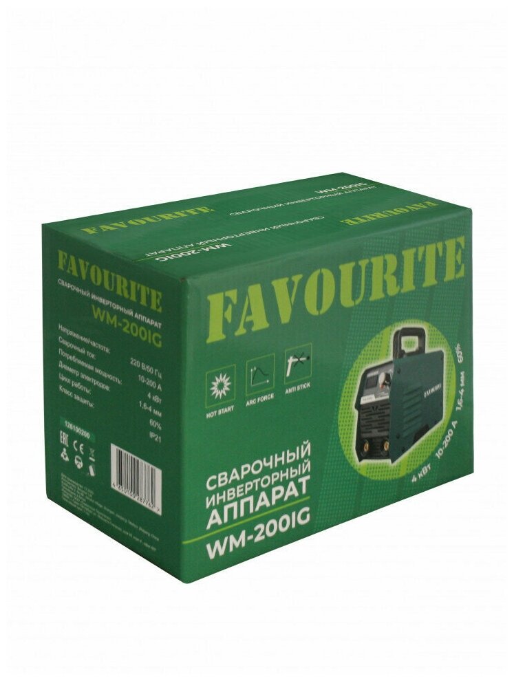 Сварочный инверторный аппарат Favourite WM-200IG применяется в ручной дуговой сварке штучными электродами с покрытием. Комплектация: Аппарат; Упаковка; Кабель с электрододержателем; Щетка; Ремень; Кабель с зажимом для массы; Щиток. Характеристики: Потребляемая мощность: 4 кВт; Диапазон сварочного тока ММА: 10-200 А; Диаметр электродов: 1.6-4 мм; Система антизалипания электрода, термозащита: да; ЖК дисплей с индикацией параметров сварочного процесса: да; Уверенная работа при колебаниях напряжения в сети: да; Легкий поджиг и высокая стабильность дуги: да; Работы от бензогенератора: да; Кабель с электродержателем: да; Кабель с зажимом для массы: да; Ремень: да; Щиток: да; Щетка: да. Преимущества: Построен на IGBT транзисторах; Принудительное туннельное охлаждение; Защита от перегрева; Класс защиты IP21. Высокопроизводительный аппарат не требует технического ухода. Наличие практичного ремня для легкой транспортировки делают работу с аппаратом комфортной и легкой. Сварочный инверторный аппарат Favourite WM-200IG имеет малый вес и небольшие габаритные размеры.