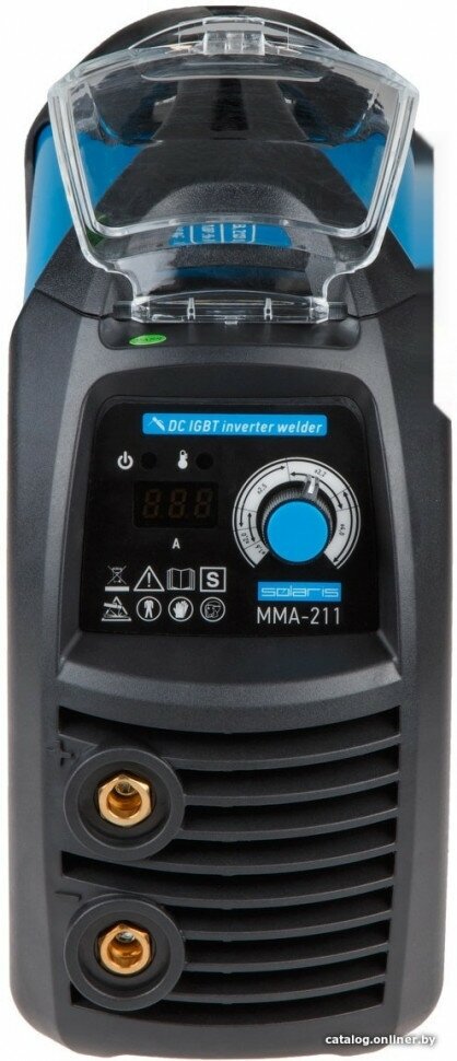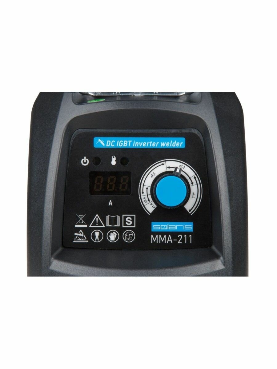 Сварочный инвертор SOLARIS MMA-211 работает на базе 4 современных IGBT-транзисторов. Цифровой дисплей для индикации настроенного тока. Конструкция дополнена удобной рукояткой.