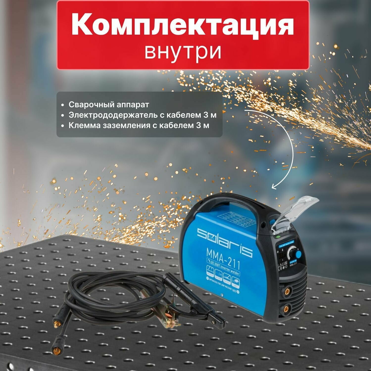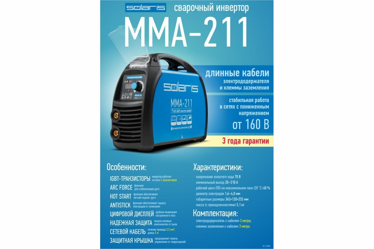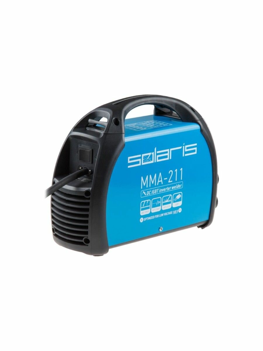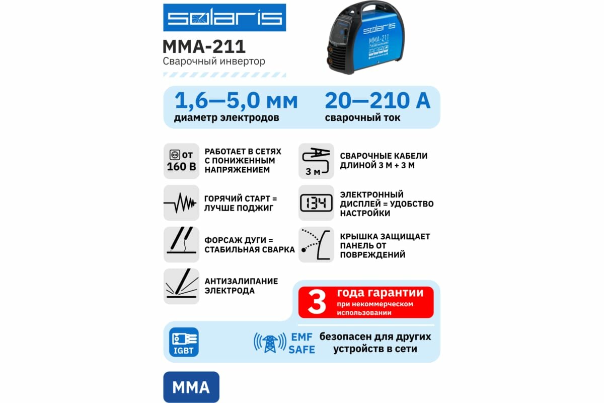 Преимущества:_x000D_ - инвертор работает на базе 4 шт. современных IGBT-транзисторов;_x000D_ - цифровой дисплей для индикации настроенного тока;_x000D_ - стабильная работа при входном напряжении от 160В;_x000D_ - функции ArcForce, HotStart, AntiStick;_x000D_ - эффективное охлаждение компонентов;_x000D_ - длинные сварочные кабели в комплекте (3+3 метра);_x000D_ - ручка для переноски аппарата;_x000D_ - защитная крышка передней панели;_x000D_ - полностью электронная защита от перегрева более надежна в сравнении с электронно-механическим решением;_x000D_ - сетевой кабель с сечением 2.5мм2 длиной 2 м;_x000D_ - наличие ЕМС фильтра согласно стандарту IEC 60974-10; - Гарантия 36 месяцев при некоммерческом использовании._x000D_ _x000D_ Внимание! Аппарат поставляется без вилки. В случае работы на максимальных токах, аппарат необходимо оснащать силовой однофазной вилкой 32А 230В (не входит в комплект)_x000D_ _x000D_ ---_x000D_ Технические характеристики:_x000D_ Выходные параметры: ;_x000D_ Диапазон выходного тока MMA: 20-210 А;_x000D_ Напряжение холостого хода: 70 В;_x000D_ Диаметр электродов MMA: 1,6-4,0 мм;_x000D_ Рабочий цикл (ПВ) на макс, токе: ;_x000D_ == при 40°С (EN 60974-1): 30 %;_x000D_ == при 20°С: 60 %;_x000D_ : ;_x000D_ Входные параметры: ;_x000D_ Напряжение питающей сети: 160 - 240 В;_x000D_ Частота питающей сети: 50/60 Гц;_x000D_ Тип сети: 1 фазн;_x000D_ Номинальный ток на входе: 13,3 А;_x000D_ Максимальный допустимый ток на входе: 24,4 А;_x000D_ Номин. потребл. мощность при макс. токе: 3,8 кВт;_x000D_ Рекомендуемая мощность генератора: 5,5 кВА;_x000D_ Эффективность: 92 %;_x000D_ Фактор мощности: COS 0,82;_x000D_ Класс изоляции: H;_x000D_ Степень защиты: IP21S;_x000D_ Масса (без принадлежностей): 3,9 кг;_x000D_ Масса (с принадлежностями): 5,2 кг;_x000D_ Габаритные размеры (ДхШхВ): мм;_x000D_ Гарантийный срок: 36 месяцев;_x000D_ ---_x000D_ Комплектация:_x000D_ Сварочный аппарат_x000D_ Электрододержатель с кабелем 3 метра_x000D_ Клемма заземления с кабелем 3 метра_x000D_ Инструкция _x000D_ Коробка_x000D_ ---_x000D_ Совместимые товары:_x000D_ H-300C Электрододержатель Solaris H-300С;_x000D_ H-500C Электрододержатель Solaris H-500С;_x000D_ E-200C Клемма заземления 200А E-200C Solaris;_x000D_ E-300C Клемма заземления 300А E-300C Solaris;_x000D_ E-500C Клемма заземления 500А E-500C Solaris;_x000D_ WA-2473 Разъем 10-25 мм2 Solaris (папа);_x000D_ WA-2475 Разъем панельный 10-25 мм2 Solaris (мама);_x000D_ WA-2477 Разъем удлинительный 10-25 мм2 Solaris;_x000D_ WA-4210 Комплект сварочных проводов 2 + 2 м Solaris;_x000D_ WA-4211 Комплект сварочных проводов 3 + 3 м Solaris;_x000D_ WM-E6013-20010R Электроды E6013 ф 2,0мм (уп. 1,0кг) SOLARIS;_x000D_ WM-E6013-20025R Электроды E6013 ф 2,0мм (уп. 2,5кг) SOLARIS;_x000D_ WM-E6013-30010R Электроды E6013 ф 3,0мм (уп. 1,0кг) SOLARIS;_x000D_ WM-E6013-30025R Электроды E6013 ф 3,0мм (уп. 2,5кг) SOLARIS;_x000D_ 33963 Вилка силовая 32А промышл;_x000D_ ВП32-922 Вилка силовая 32А промышл;_x000D_ JP7602-01 Вилка 16 А (не подходит для работы на макс токах);_x000D_ SQ0612-0001 Вилка 16 А (не подходит для работы на макс токах);_x000D_ ---