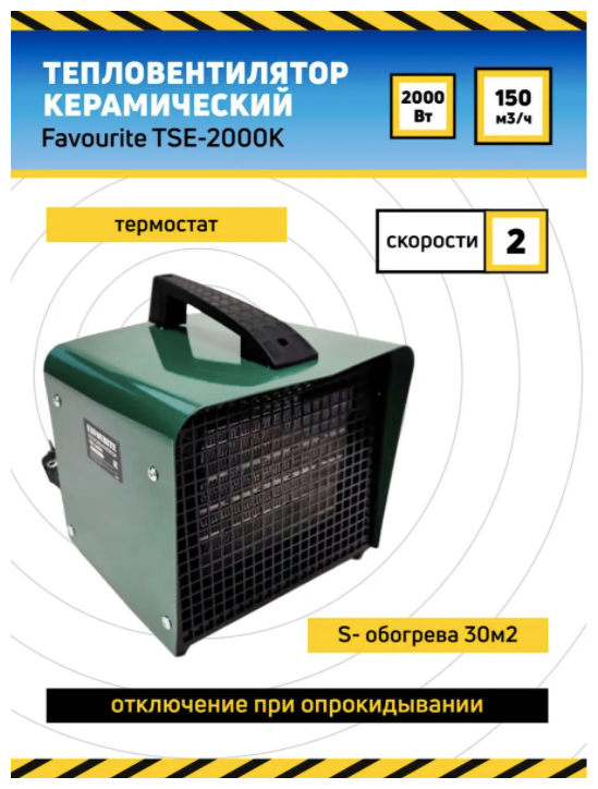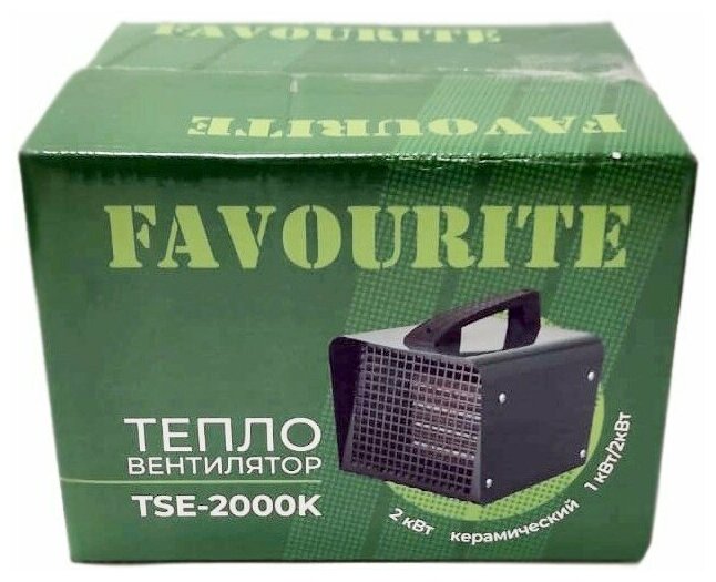 Тепловентилятор Модель TSE-2000K - тепловая пушка 2 квт, рассчитанная на средние площади до 30 м2. Тепловентилятор 2 квт имеет в конструкции РТС термисторы из керамики, которые используются в качестве генератора тепловой энергии, преобразуя электричество в тепло. Данная тепловая пушка может работать в любых климатических зонах, оснащена вольфрамовыми нитями в тэнах и тихим вентилятором. Электрическая схема тепловентилятора включает керамические элементы, саморегулируемые РТС термисторы, термостат и датчик режимов обогрева. Электрическая пушка оснащена ручкой для транспортировки и прочным металлическим корпусом, устойчивым к ударам и случайным падениям. Такой обогреватель для офиса, дома и выездных работ может подключаться к сети 220В или автономному генератору. Тепловые пушки неприхотливы в обслуживании, могут устанавливаться в жилых зданиях и не выделяют вредных веществ, за исключением сушки воздуха, что легко исправить дополнительным увлажнением. Технические характеристики FAVOURITE корпус квадратный, IP20 Потребляемая мощность вентилятора,25 Вт Расход воздуха, 120 м³/ч Термостат есть Наличие сетевой вилки есть Вес нетто, 2 кг Напряжение, 220 В Мощность при обогреве,2кВт Нагревательный элемент керамический Степень защиты IP20 Установка температур терморегулятором нет Max ток, 9 А Частота, 50 Гц