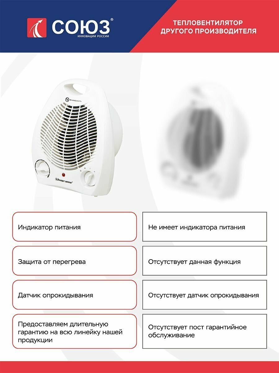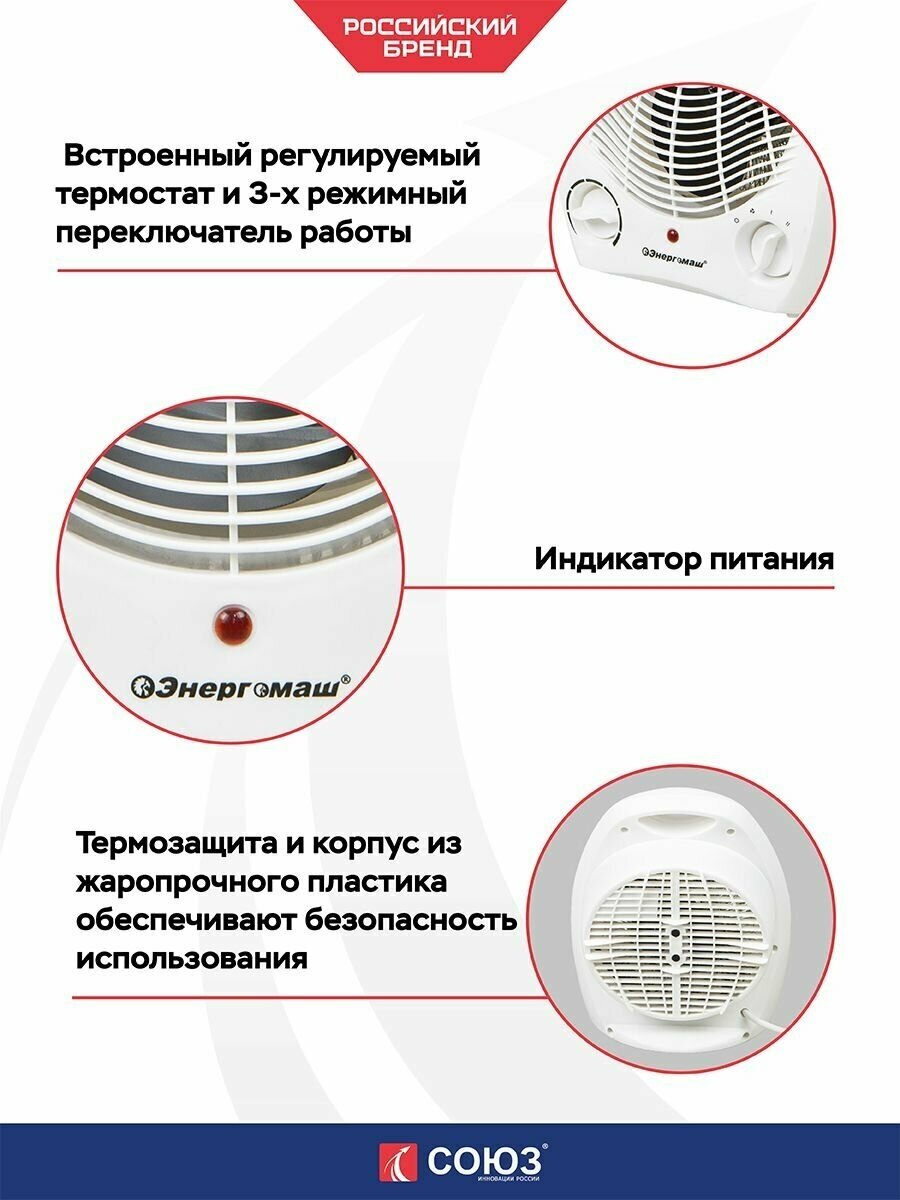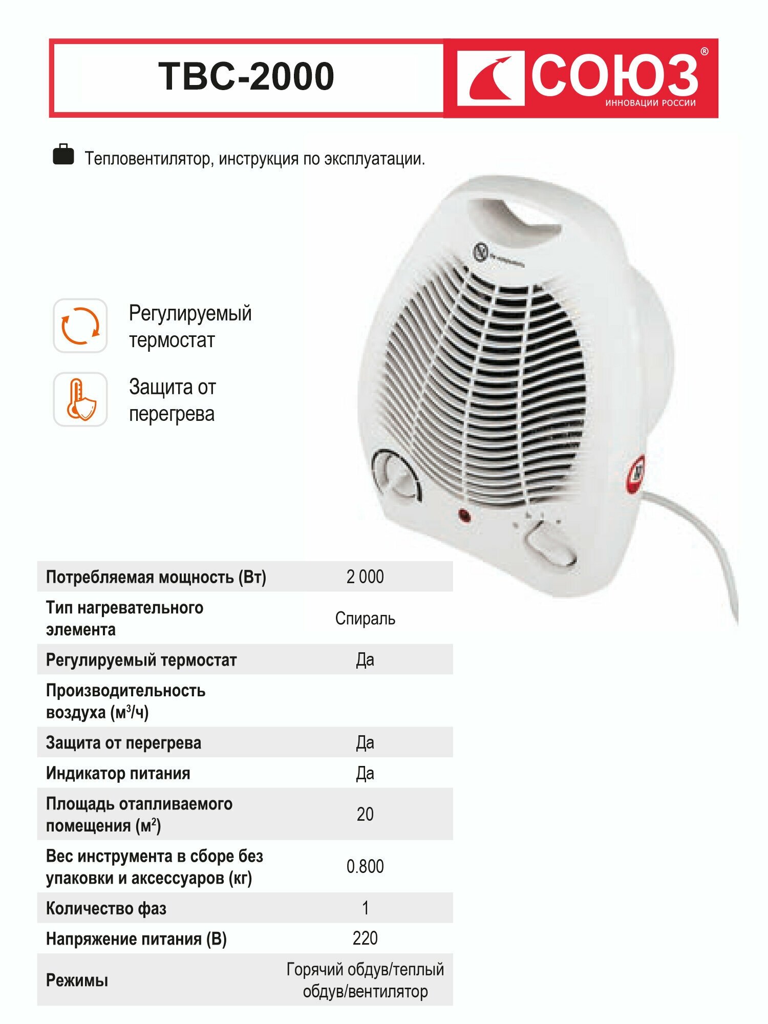 ТВС-2000 Тепловентилятор 2000W,3 реж., рег. термостат,защит.от перегрева,ручка д/переноски СОЮЗ