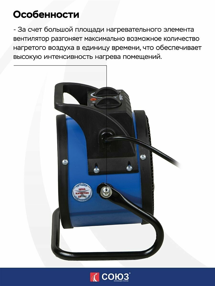 Керамический нагревательный элемент PTC, благодаря большой площади которого, вентилятор эффективно распространяет теплый воздух, обеспечивая высокую скорость нагрева помещений. Встроенный регулируемый термостат и 3-х режимный переключатель работы: вентиляция без нагрева / теплый обдув / горячий обдув, позволяют использовать вентилятор в любое время года. Индикатор питания сигнализирует о включенном состоянии прибора, напоминая пользователю о необходимости контроля за его работой. Преимущества: Керамический нагревательный элемент обеспечивает высокую эффективность тепловентилятора. За счет большой площади нагревательного элемента вентилятор разгоняет максимально возможное количество нагретого воздуха в единицу времени, что обеспечивает высокую интенсивность нагрева помещений. Компактные размеры тепловентиляторов серии МК при сохранении показателей эффективности нагрева. Три режима работы: вентилятор / теплый / горячий позволяют использовать тепловентилятор как для обогрева разной интенсивности в холодное время года, так и для вентиляции летом. Регулируемый термостат позволяет устанавливать уровень нагрева внутри режимов. Встроенная термозащита автоматически остановит тепловентилятор при достижении критической температуры. При этом вентилятор прибора продолжит работу предохраняя внутренние части от перегрева. Автоматическое включение произойдет при остывании до рабочей температуры. Характеристики: Напряжение питания (В): 220 Режимы: Горячий обдув/теплый обдув/вентилятор Регулируемый термостат: Да Потребляемая мощность (Вт): 2 000 Производительность воздуха (м3/ч): 138 Защита от перегрева: Да Индикатор питания: Да Площадь отапливаемого помещения (м2): 30 Тип нагревательного элемента: керамический Количество фаз: 1 Комплектация: Тепловентилятор инструкция по эксплуатации