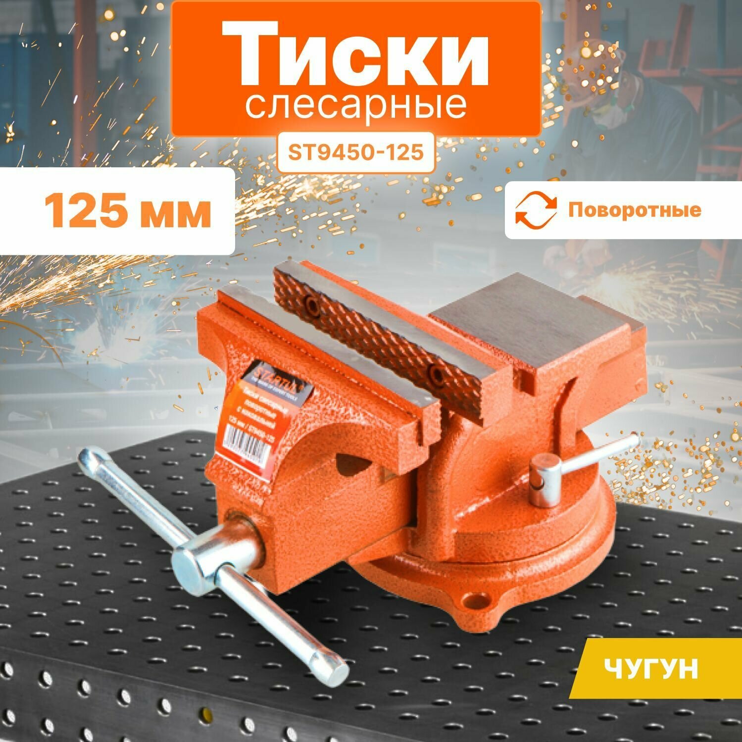--- Технические характеристики: Материал изготовления: чугун Раскрытие губок максимальное, мм: 105 Вес, кг: 6,8 Зажимное усилие, кг: 1000 Диаметр отверстий для крепления к столу, мм: 9 (болтов в комплекте нет) Ширина губок, мм: 126 Глубина зева, мм: 53 Диаметр винта: T14*3*225 Размер наковальни, мм: 75*82 Угол поворота: 360° Габаритные размеры, мм: 283*126*146