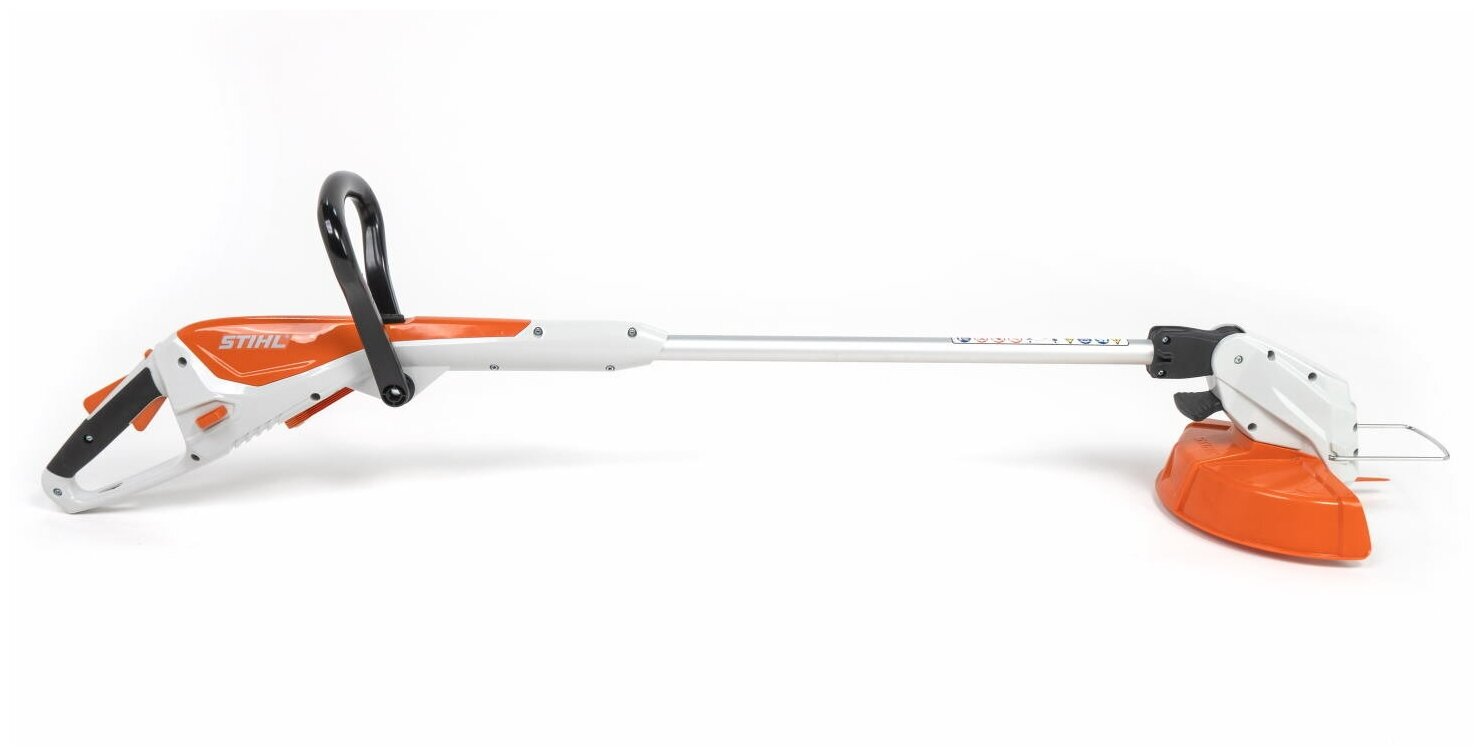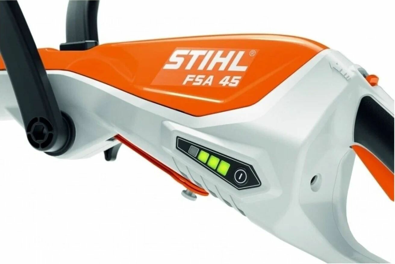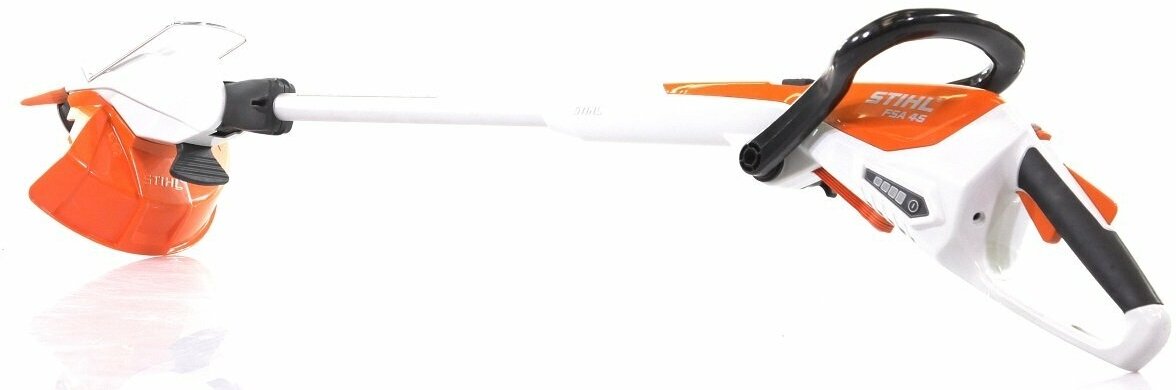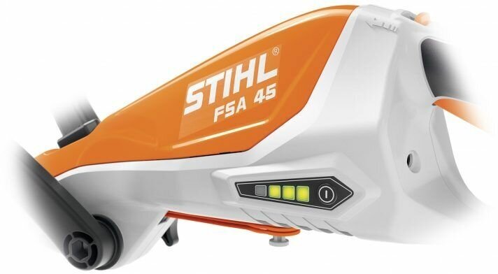 FSA 45 - компактная аккумуляторная мотокоса для простых работ по стрижке газона и расчистке территории рядом с домом. Оснащена встроенным аккумулятором с индикацией заряда, регулировкой штанги и рукоятки без специального инструмента, регулируемым рабочим углом косильного блока, например для вертикальной обрезки кромок, простой перестановкой ножей PolyCut или режущих струн без замены косильной головки, ограничительной скобой. Время зарядки аккумулятора 145 мин / 210 мин (80% / 100%). Серийное оснащение Регулируемая по высоте штанга Длину штанги можно в любой момент отрегулировать в зависимости от Ваших индивидуальных требований (до 170 см, 8 позиций). Оптимальный вариант на случай, если инструментом пользуются несколько человек или работы выполняются на разных участках. Настраиваемая круговая рукоятка Положение круговой рукоятки можно без инструментов менять в 6 позициях (до 120°). Регулируемый косильный блок Косильный блок регулируется в 4 позициях (до 68°). Вертикальная обрезка кромок Для вертикальной обрезки кромок угол можно изменять до 90°. Индикатор заряда Во время работы или зарядки инструмента легко можно узнать текущий уровень заряда, просто нажав на кнопку. Четыре светодиода красным или зелёным цветом показывают степень заряда. Хранение запасного ножа Нож PolyCut при необходимости можно легко поменять. На самом агрегате легко могут храниться одновременно до шести запасных ножей. Ограничительная дуга Защищает косильную головку от повреждений. Защищает растения от повреждений при кошении. Ключ активации Использование инструмента возможно только с ключом активации. Если ключ вынут, инструмент обесточен для защиты от непреднамеренного запуска. Агрегат можно спокойно и безопасно заряжать и транспортировать. Зарядный кабель Энергию для работы STIHL FSA 45 получают от встроенного литий-ионного аккумулятора на 18 В. Его можно удобно заряжать через специальный зарядный кабель. ]]>