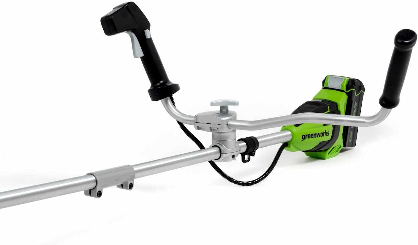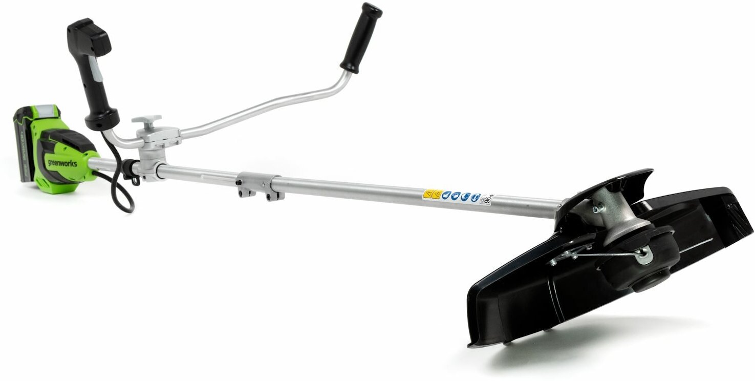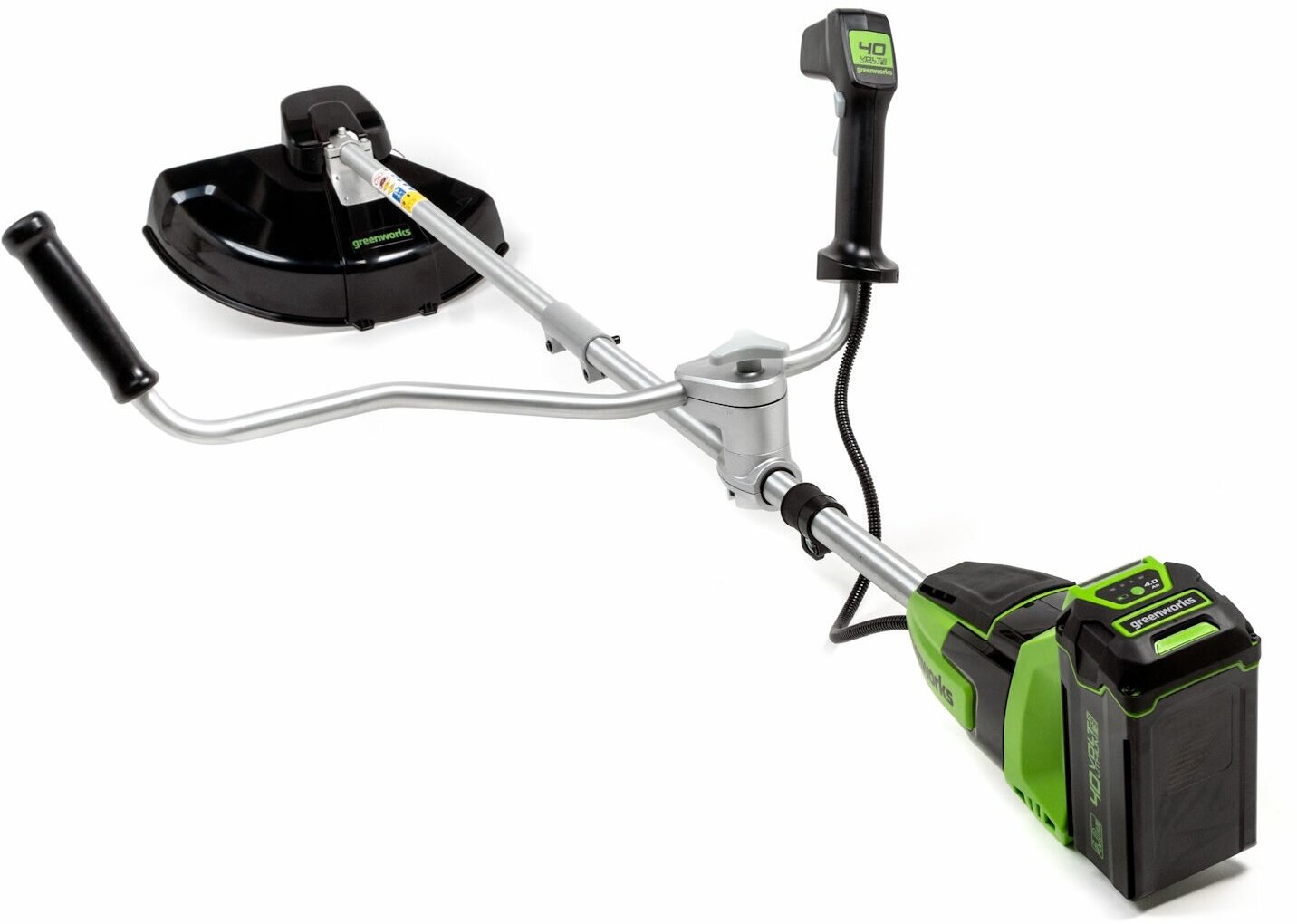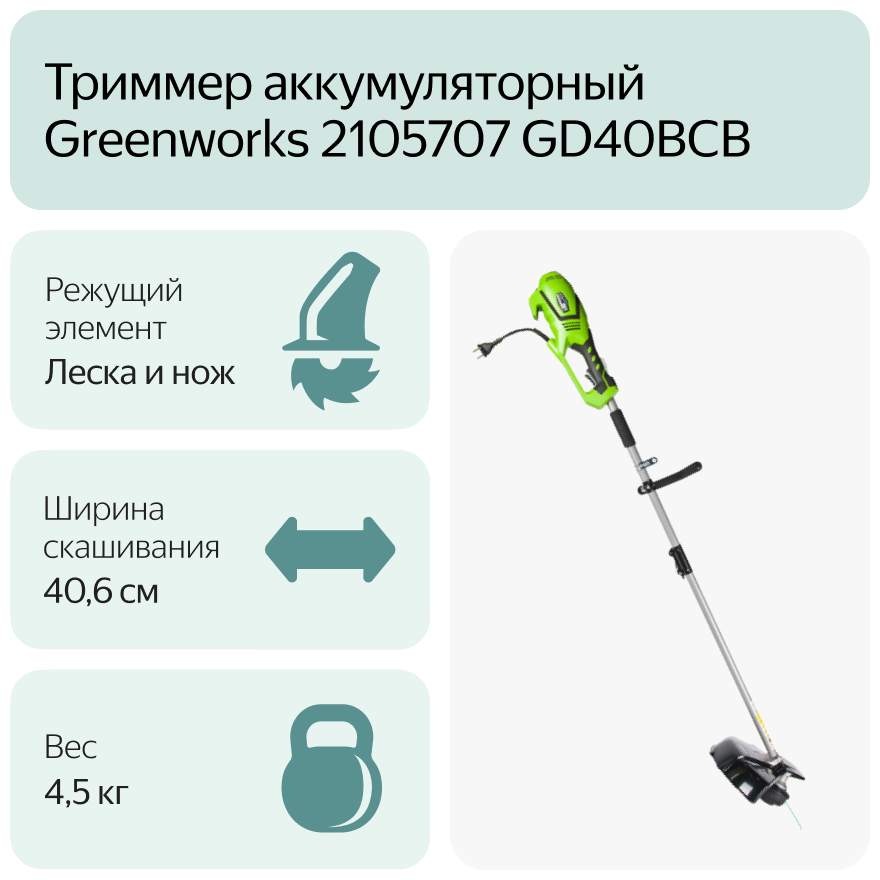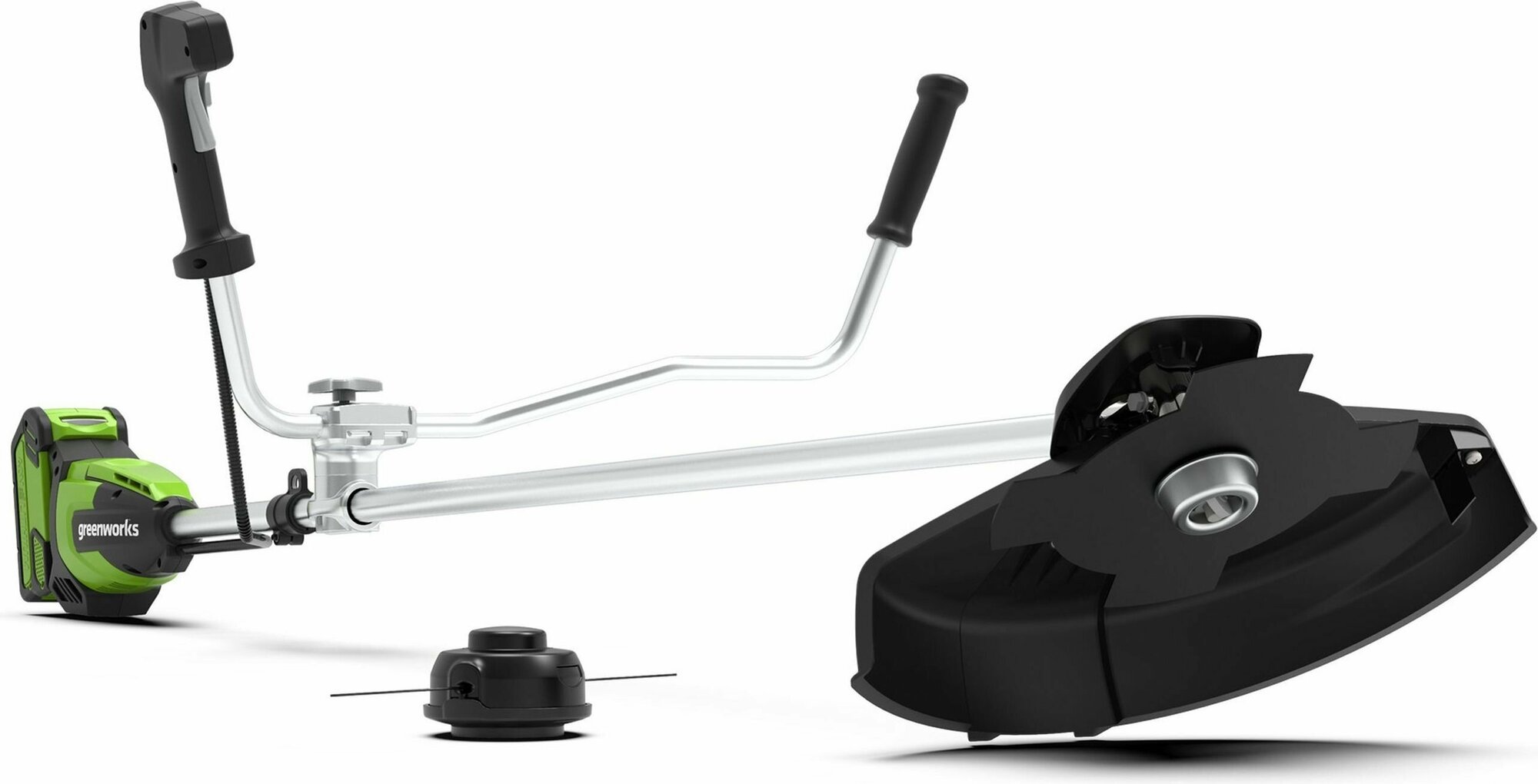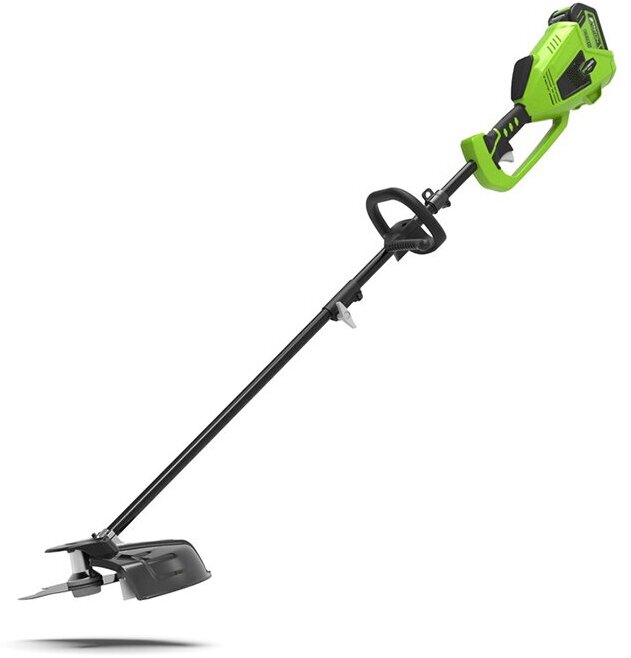 Триммер аккумуляторный Greenworks Арт. 2105707, 40V, 40 см, бесщеточный, без АКБ и ЗУ — отличная замена электро- или бензиновому триммеру, он с легкостью справится с высокой травой, а благодаря режущему диску (в комплекте) можно резать мелкий кустарник.