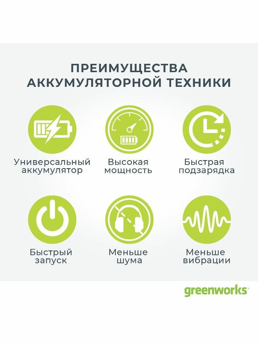 Модель работает от аккумуляторов 40V, подходящих для всех устройств Greenworks 40V. В линейке представлено множество инструментов, которые подойдут для самых разных садовых задач.