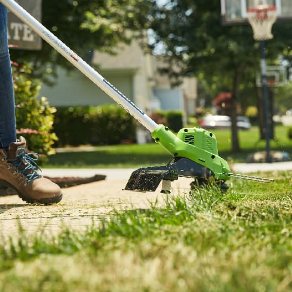 Обороты триммера регулируются силой нажатия на курок-выключатель, можно работать более интенсивно или более аккуратно, например, около деревьев и препятствий. Откидная скоба, установленная рядом с триммерной головкой, защитит окружающие предметы от контакта с леской.