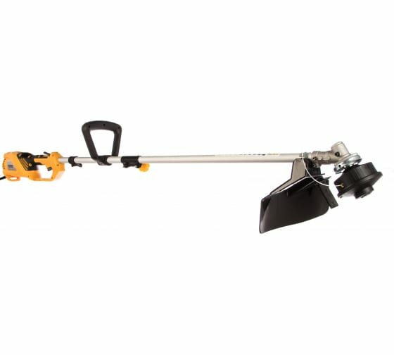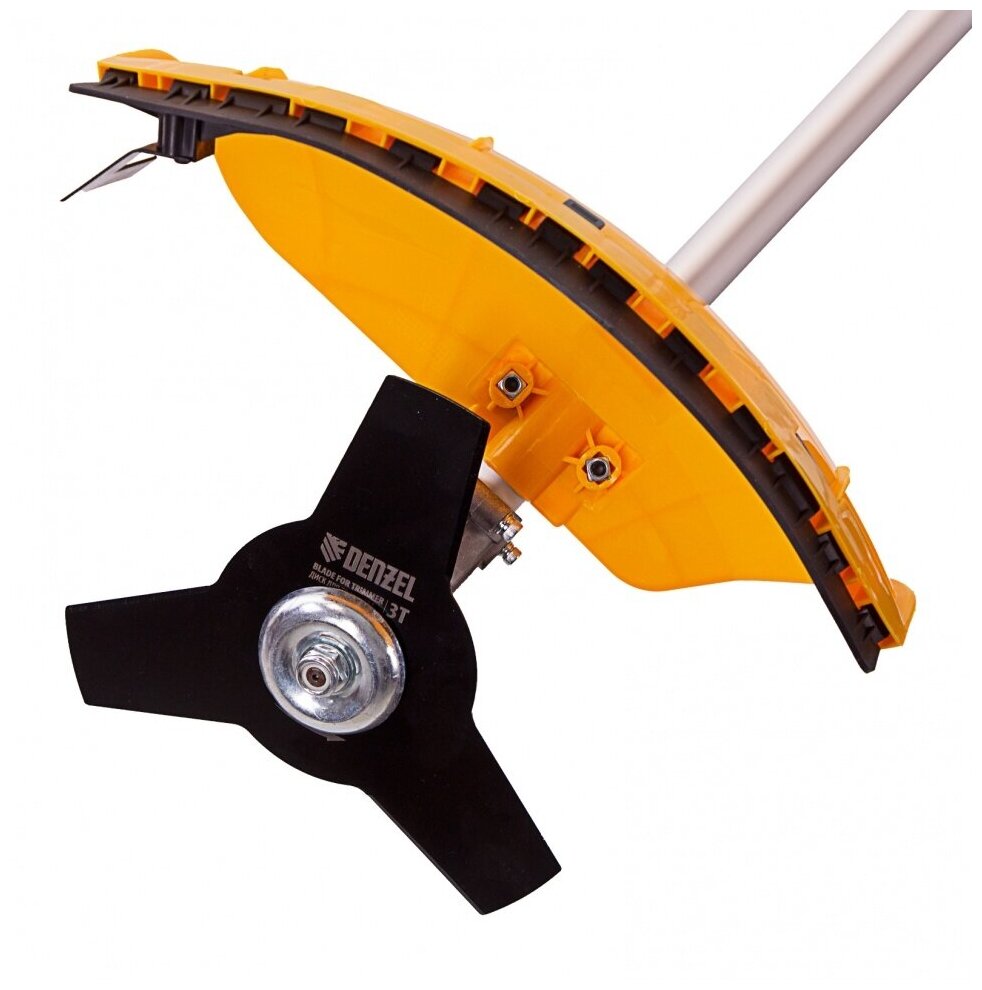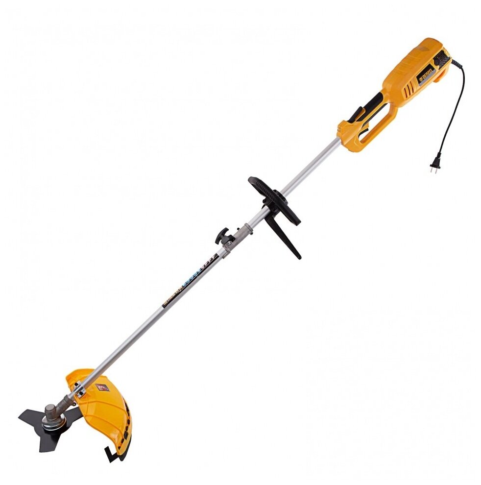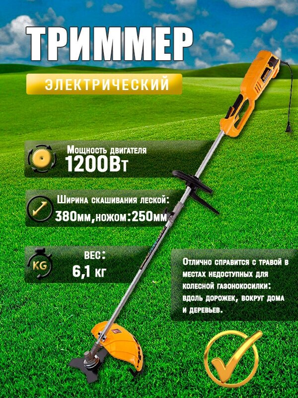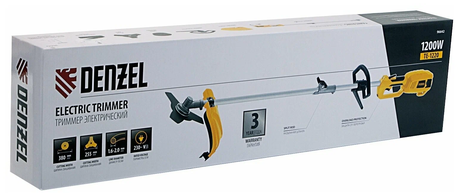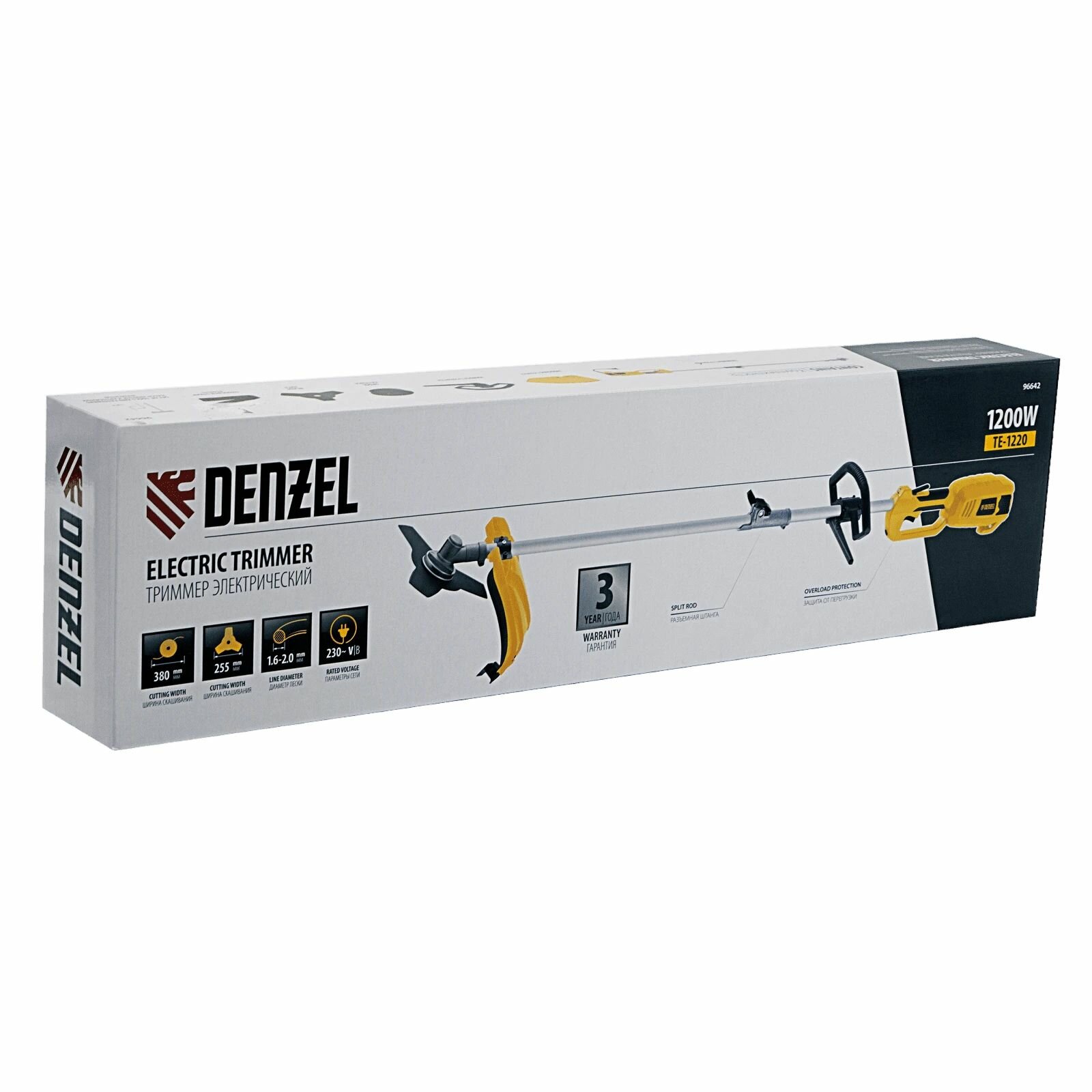 Электрический триммер Denzel TE-1220 96642 с разборной штангой предназначен для скашивания травы на дачном участке. Мощный двигатель на 1200 Вт обеспечивает вращение катушки на триммере и диска со скоростью 7500 об/мин. Ширина скашивания за один проход составляет 38 см при использовании лески и 25,5 при использовании диска, что удобно для работы на небольших участках. Электродвигатель не требует приготовления топливной смеси и сложного технического обслуживания. Благодаря отсутствию вредных выбросов и неприятного запаха работа триммера для газона не вредит здоровью и не вызывает дискомфорт. Преимущества: Расширенные возможности —, входящий в комплект поставки диск с посадочным диаметром 25,4 мм позволяет скашивать не только траву, но и молодой кустарник. Долговечность —, благодаря медной обмотке двигателя триммер для травы стабильно работает даже при высоких нагрузках. Безопасность —, блокировка выключателя препятствует случайному запуску, а защитный кожух предохраняет от летящей травы. Надежность —, термозащита предотвращает поломку триммера для дачи в результате перегрева. Быстрое обновление лески —, ее подача происходит при легком ударе катушкой о землю. Защита от вибраций —, рукоятка оснащена амортизаторами, что снижает дискомфорт во время скашивания травы. Снижение нагрузки на спину —, наплечный ремень равномерно распределяет вес садового электротриммера, что уменьшает усталость при длительной работе. Комфорт во время работы —, рукоятку можно установить в любом месте штанги для обеспечения наиболее удобного положения рук. Удобное хранение и транспортировка —, благодаря разборной штанге садовый триммер не занимает много места.