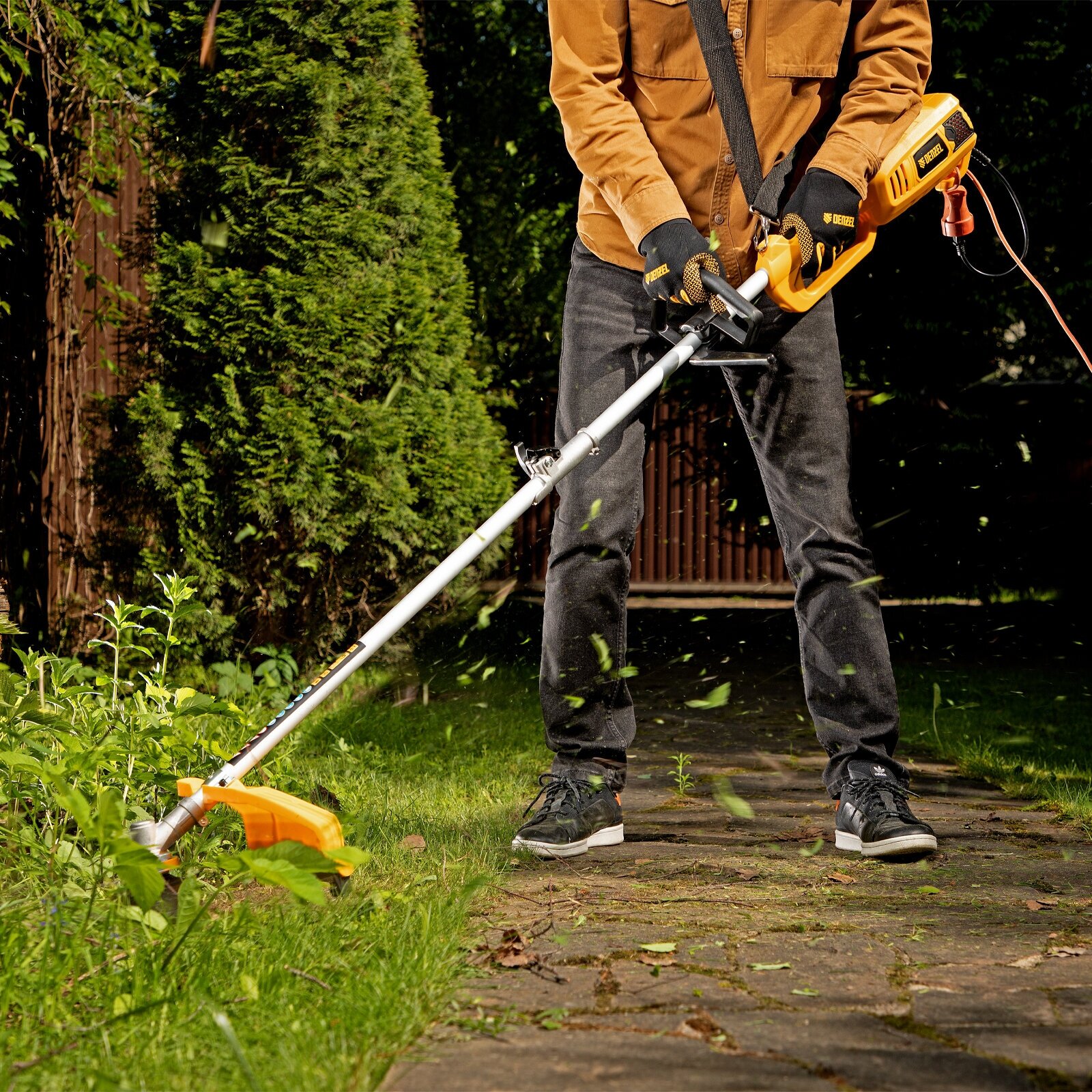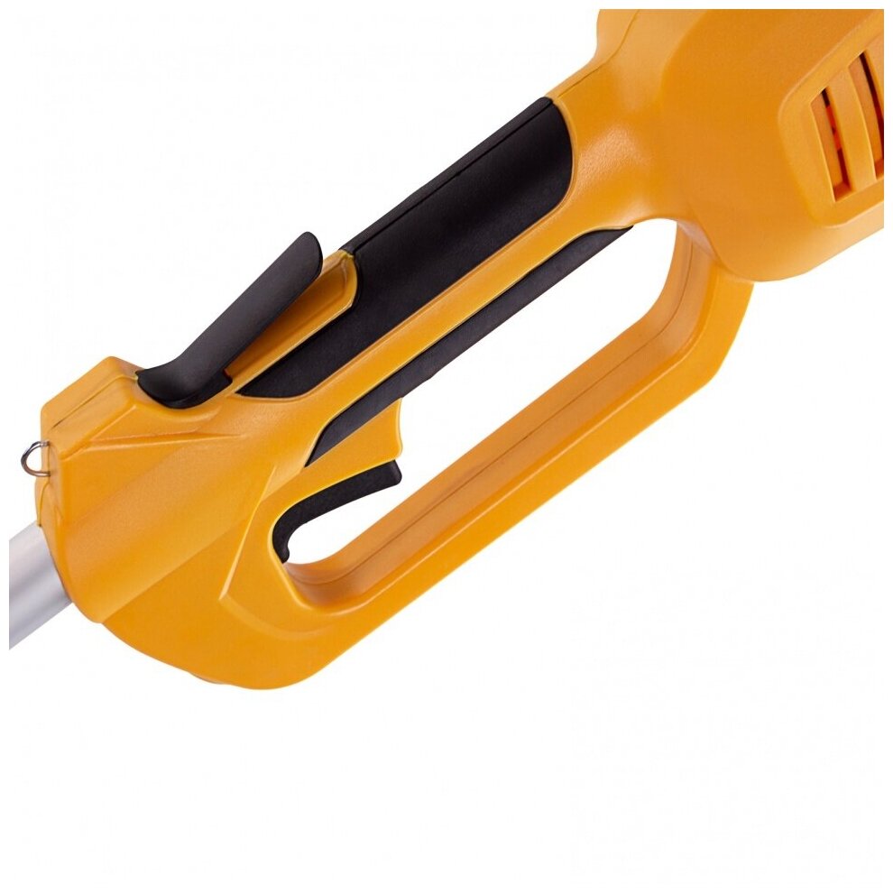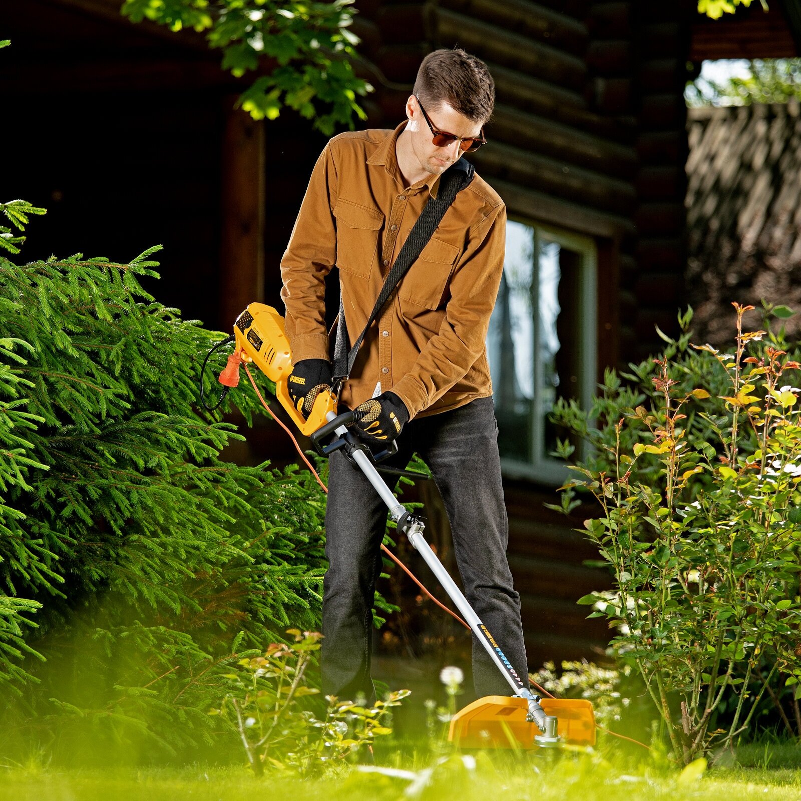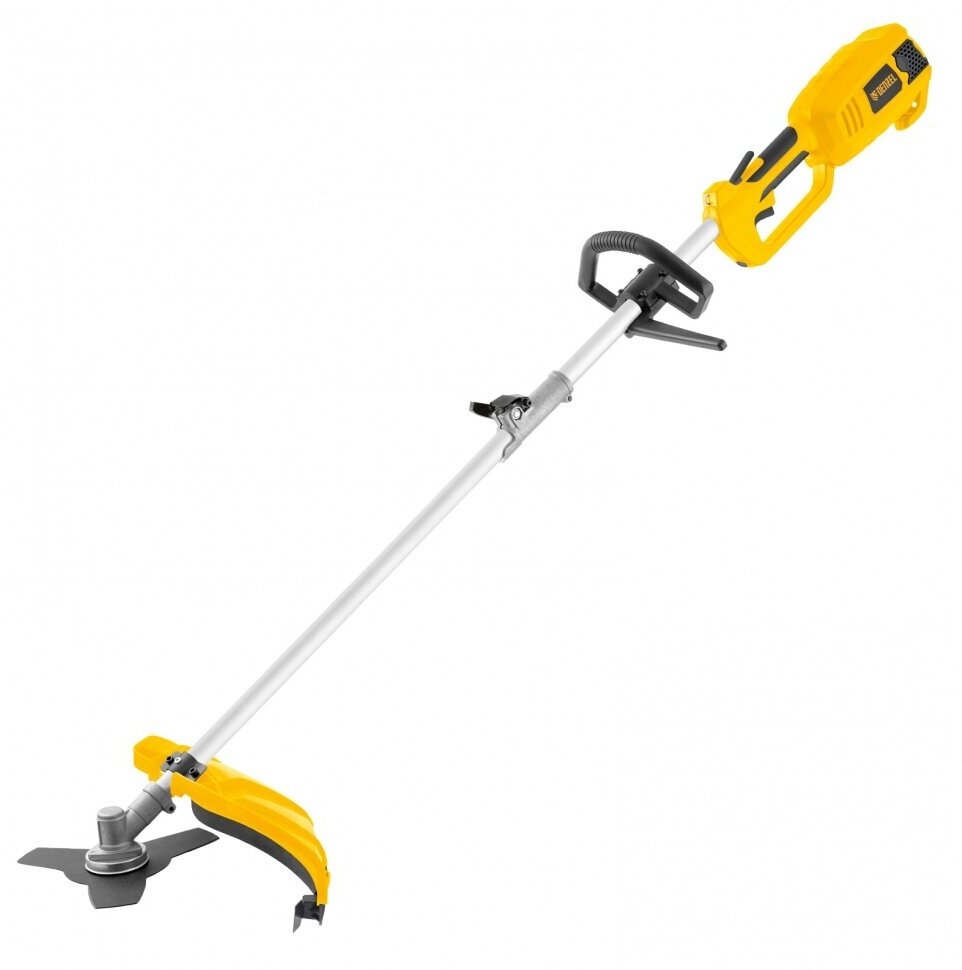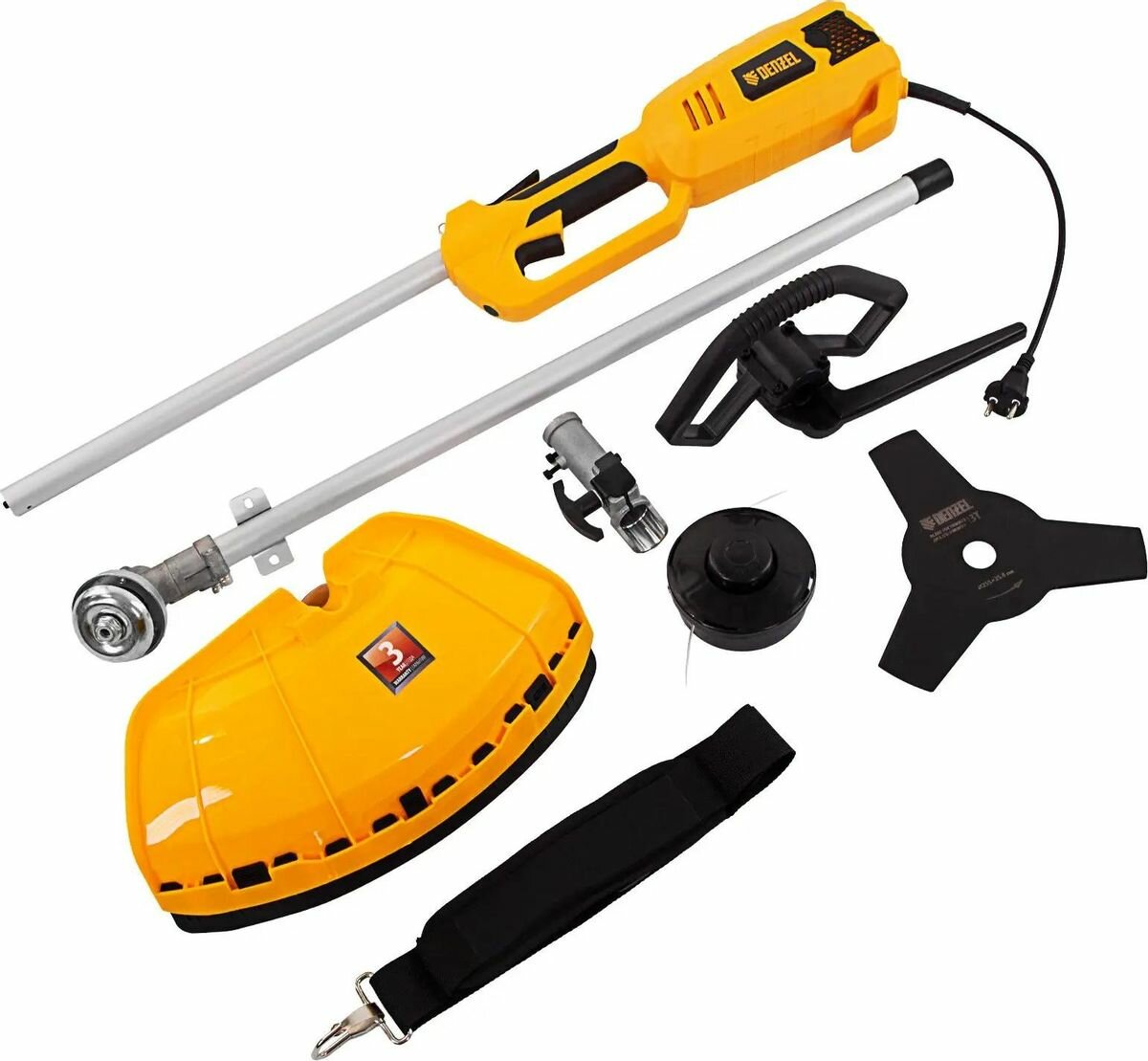 Электрический триммер Denzel TE-1220 96642 с разборной штангой предназначен для скашивания травы на дачном участке. Мощный двигатель на 1200 Вт обеспечивает вращение катушки на триммере и диска со скоростью 7500 об/мин. Ширина скашивания за один проход составляет 38 см при использовании лески и 25,5 при использовании диска, что удобно для работы на небольших участках. Электродвигатель не требует приготовления топливной смеси и сложного технического обслуживания. Благодаря отсутствию вредных выбросов и неприятного запаха работа триммера для газона не вредит здоровью и не вызывает дискомфорт. Преимущества: Расширенные возможности —, входящий в комплект поставки диск с посадочным диаметром 25,4 мм позволяет скашивать не только траву, но и молодой кустарник. Долговечность —, благодаря медной обмотке двигателя триммер для травы стабильно работает даже при высоких нагрузках. Безопасность —, блокировка выключателя препятствует случайному запуску, а защитный кожух предохраняет от летящей травы. Надежность —, термозащита предотвращает поломку триммера для дачи в результате перегрева. Быстрое обновление лески —, ее подача происходит при легком ударе катушкой о землю. Защита от вибраций —, рукоятка оснащена амортизаторами, что снижает дискомфорт во время скашивания травы. Снижение нагрузки на спину —, наплечный ремень равномерно распределяет вес садового электротриммера, что уменьшает усталость при длительной работе. Комфорт во время работы —, рукоятку можно установить в любом месте штанги для обеспечения наиболее удобного положения рук. Удобное хранение и транспортировка —, благодаря разборной штанге садовый триммер не занимает много места.