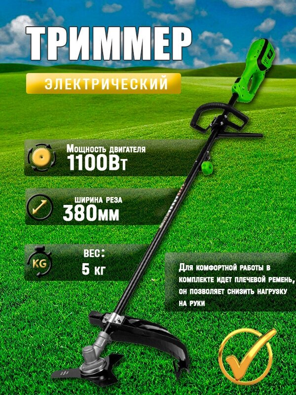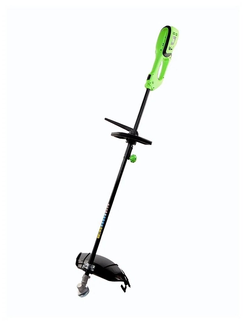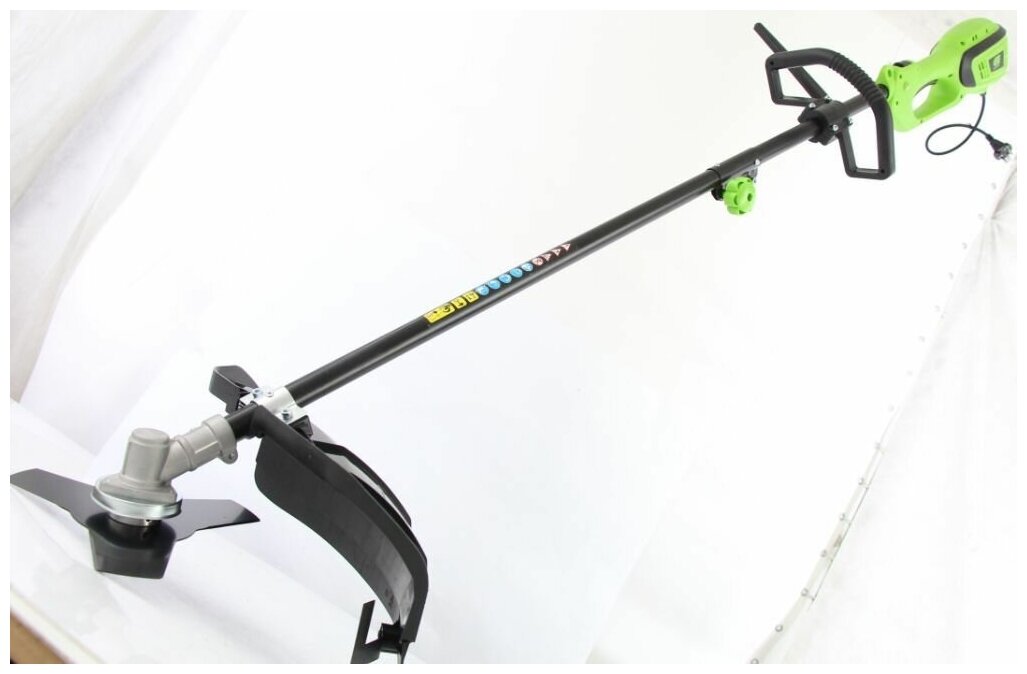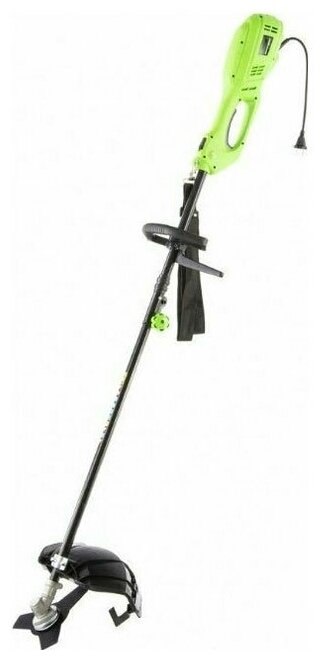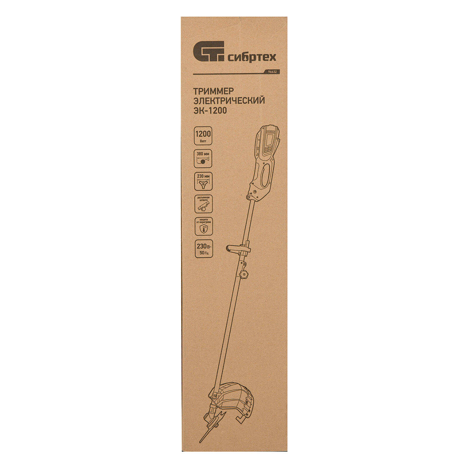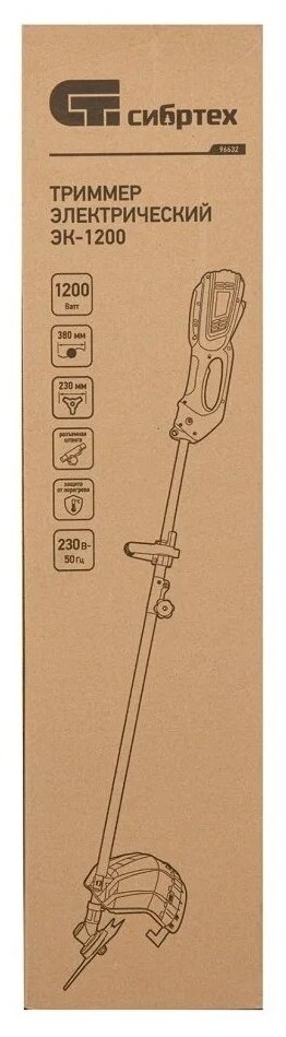 Электрический триммер Сибртех ЭК-1200 96632 мощностью 1200 Вт, с разборной штангой, предназначен для стрижки газона с помощью катушки с шириной скашивания 380 мм, а входящий в комплект режущий диск позволяет избавляться от сорняков, растительности с толстыми стеблями, а также срезать мелкий кустарник. Триммер пригодится в местах недоступных для колесной газонокосилки: между грядками, вдоль стен, заборов и тротуаров. С ним легко справится даже неопытный пользователь, т. к. он прост в применении и не нуждается в техническом обслуживании. ПреимуществаФункциональность — благодаря верхнему расположению двигателя триммером можно косить мокрую траву. Защита от перегрева — при превышении допустимой температуры двигатель отключается, что предотвращает его поломку. Надежность и долговечность — контакты обмотки залиты компаундом для улучшения изоляции и защиты от повреждений, а срок службы редукторного узла увеличивает высокотемпературная консистентная смазка. Прочность — пластиковые детали триммера выполнены из высококачественного пластика РР и РА6. Быстрая подача лески — нужно слегка ударить шпулей о землю прямо во время работы. Защита от вибраций — вспомогательная рукоятка устанавливается на антивибрационную резиновую втулку, что уменьшает дискомфорт во время работы. Эргономичность — плечевой ремень снижает нагрузку на руки, а D-образная ручка обеспечивает надежный хват и облегчает управление триммером. Экологичность — триммер работает тихо и не выделяет вредных веществ, поэтому не вызывает дискомфорт и не вредит здоровью. Удобная транспортировка и хранение — штанга легко разбирается, поэтому устройство не занимает много места.