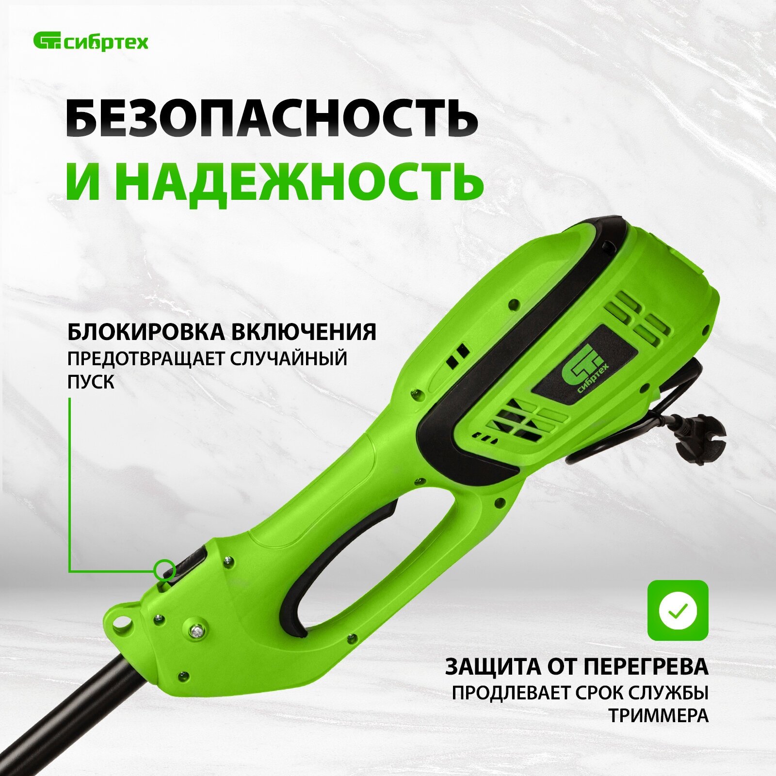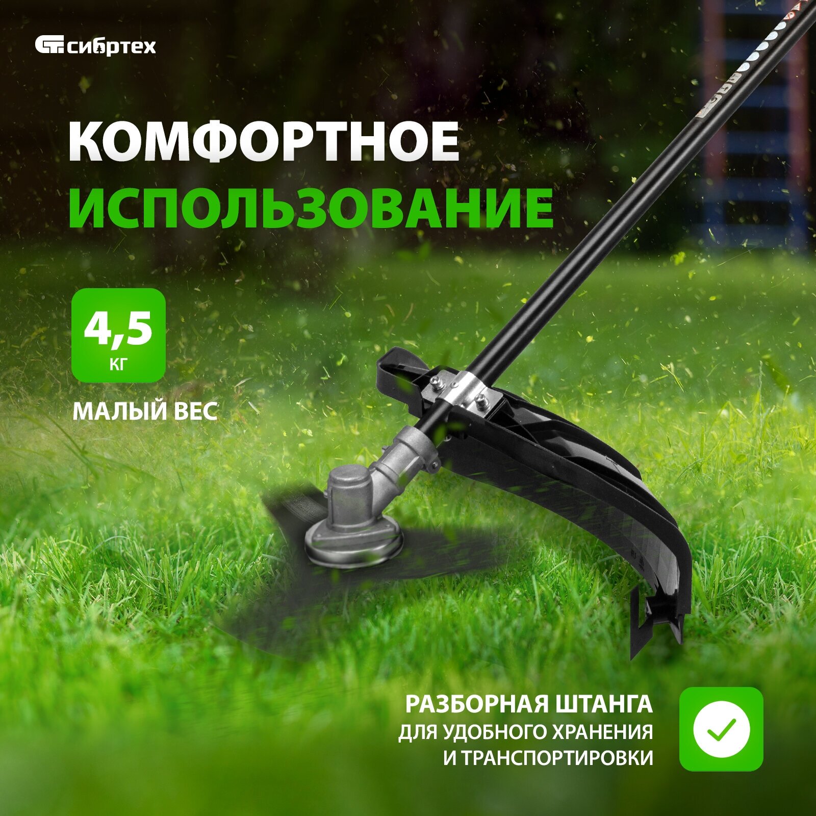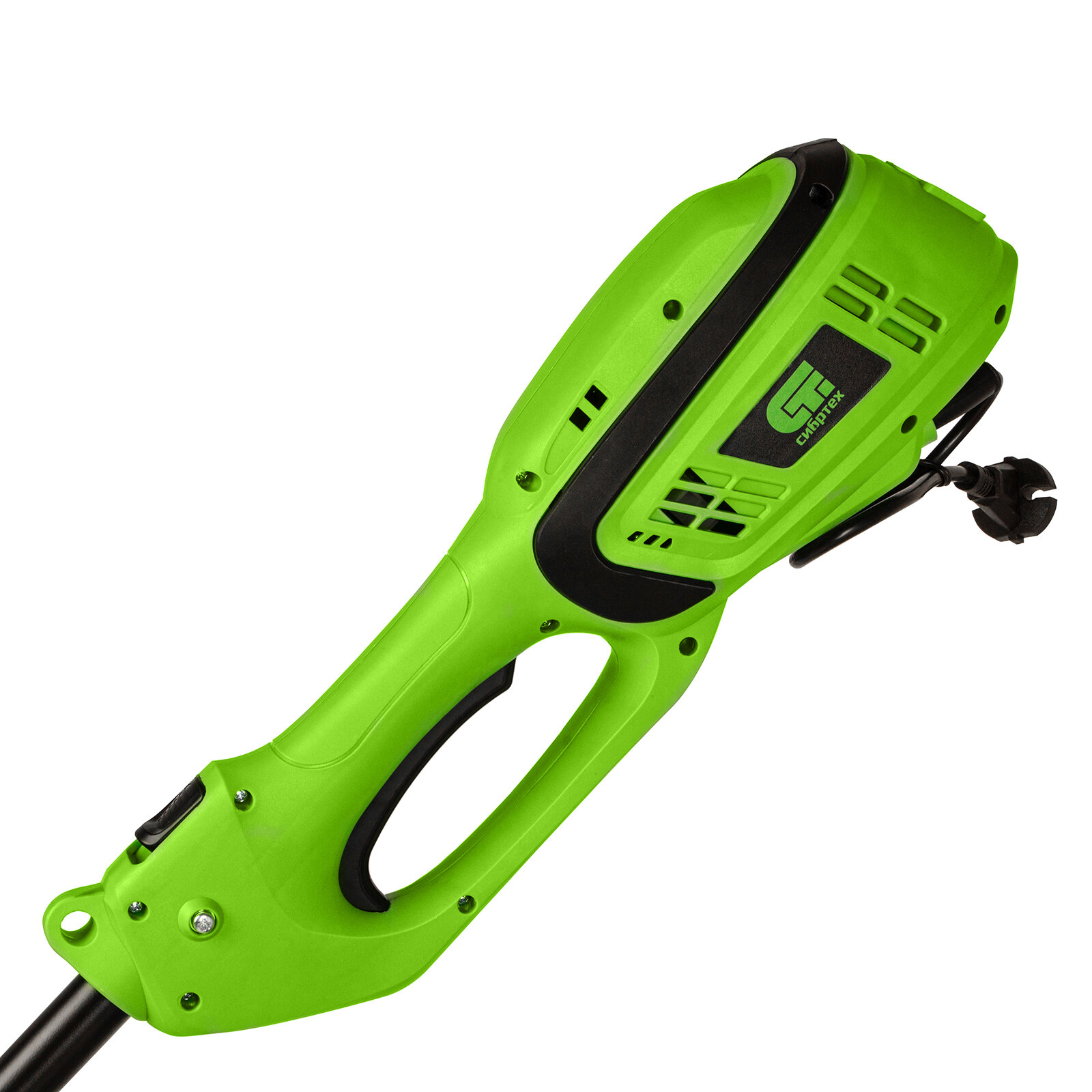 Электрический триммер Сибртех ЭК-1200 96632 мощностью 1200 Вт, с разборной штангой, предназначен для стрижки газона с помощью катушки с шириной скашивания 380 мм, а входящий в комплект режущий диск позволяет избавляться от сорняков, растительности с толстыми стеблями, а также срезать мелкий кустарник. Триммер пригодится в местах недоступных для колесной газонокосилки: между грядками, вдоль стен, заборов и тротуаров. С ним легко справится даже неопытный пользователь, т. к. он прост в применении и не нуждается в техническом обслуживании. ПреимуществаФункциональность — благодаря верхнему расположению двигателя триммером можно косить мокрую траву. Защита от перегрева — при превышении допустимой температуры двигатель отключается, что предотвращает его поломку. Надежность и долговечность — контакты обмотки залиты компаундом для улучшения изоляции и защиты от повреждений, а срок службы редукторного узла увеличивает высокотемпературная консистентная смазка. Прочность — пластиковые детали триммера выполнены из высококачественного пластика РР и РА6. Быстрая подача лески — нужно слегка ударить шпулей о землю прямо во время работы. Защита от вибраций — вспомогательная рукоятка устанавливается на антивибрационную резиновую втулку, что уменьшает дискомфорт во время работы. Эргономичность — плечевой ремень снижает нагрузку на руки, а D-образная ручка обеспечивает надежный хват и облегчает управление триммером. Экологичность — триммер работает тихо и не выделяет вредных веществ, поэтому не вызывает дискомфорт и не вредит здоровью. Удобная транспортировка и хранение — штанга легко разбирается, поэтому устройство не занимает много места.
