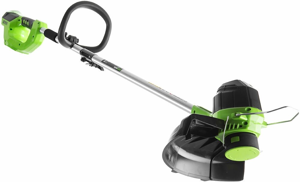 Триммер работает от аккумулятора Greenworks 24V — независимость от сети дает обрабатывать труднодоступные участки. В сравнении с бензиновыми устройствами аккумуляторный триммер является экологичным инструментом и имеет малый шум и вибрацию.