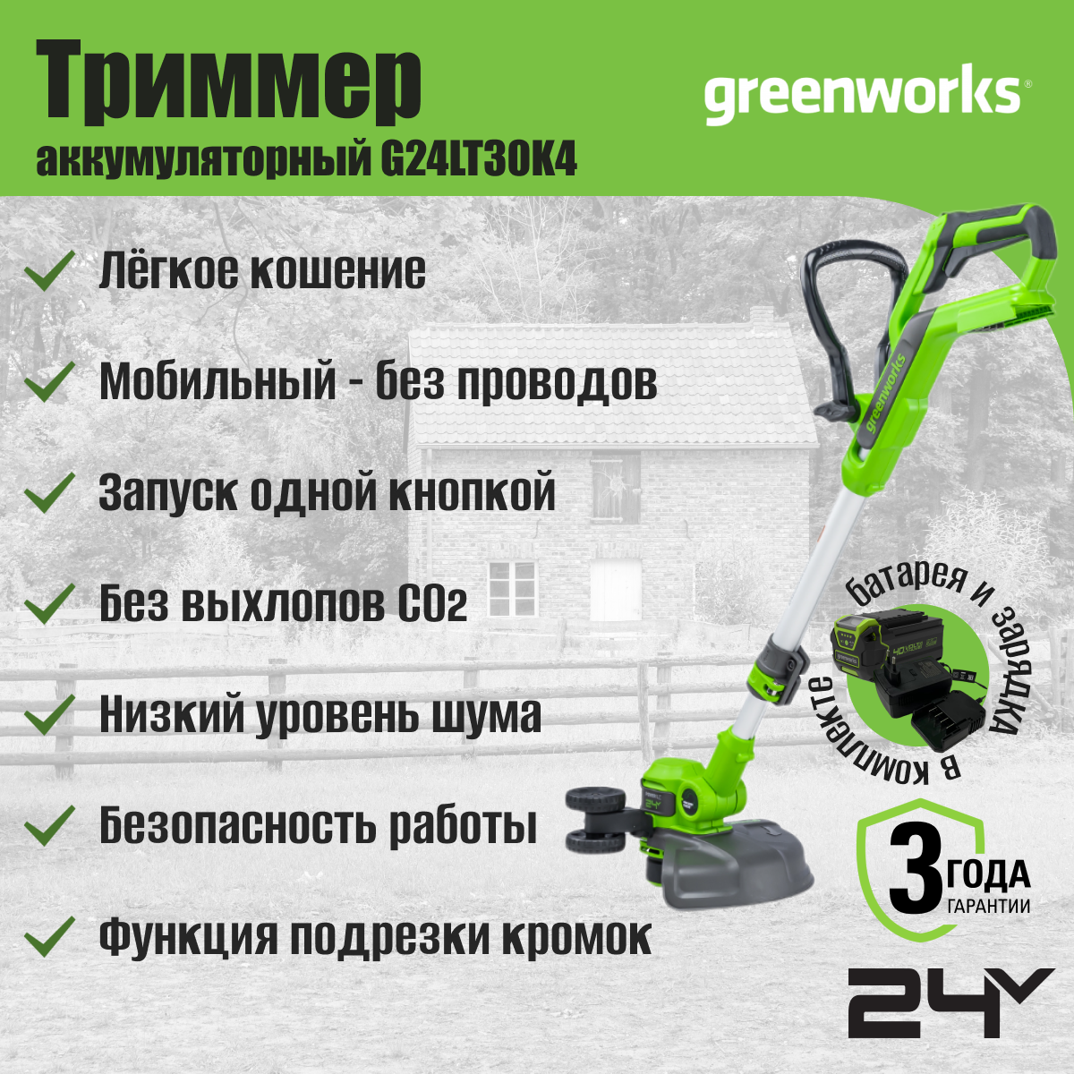 - Аккумуляторный триммер Greenworks G24LT30 24V (30 см), арт. 2110407; 1 аккумулятором 4 Ач и зарядным устройством
