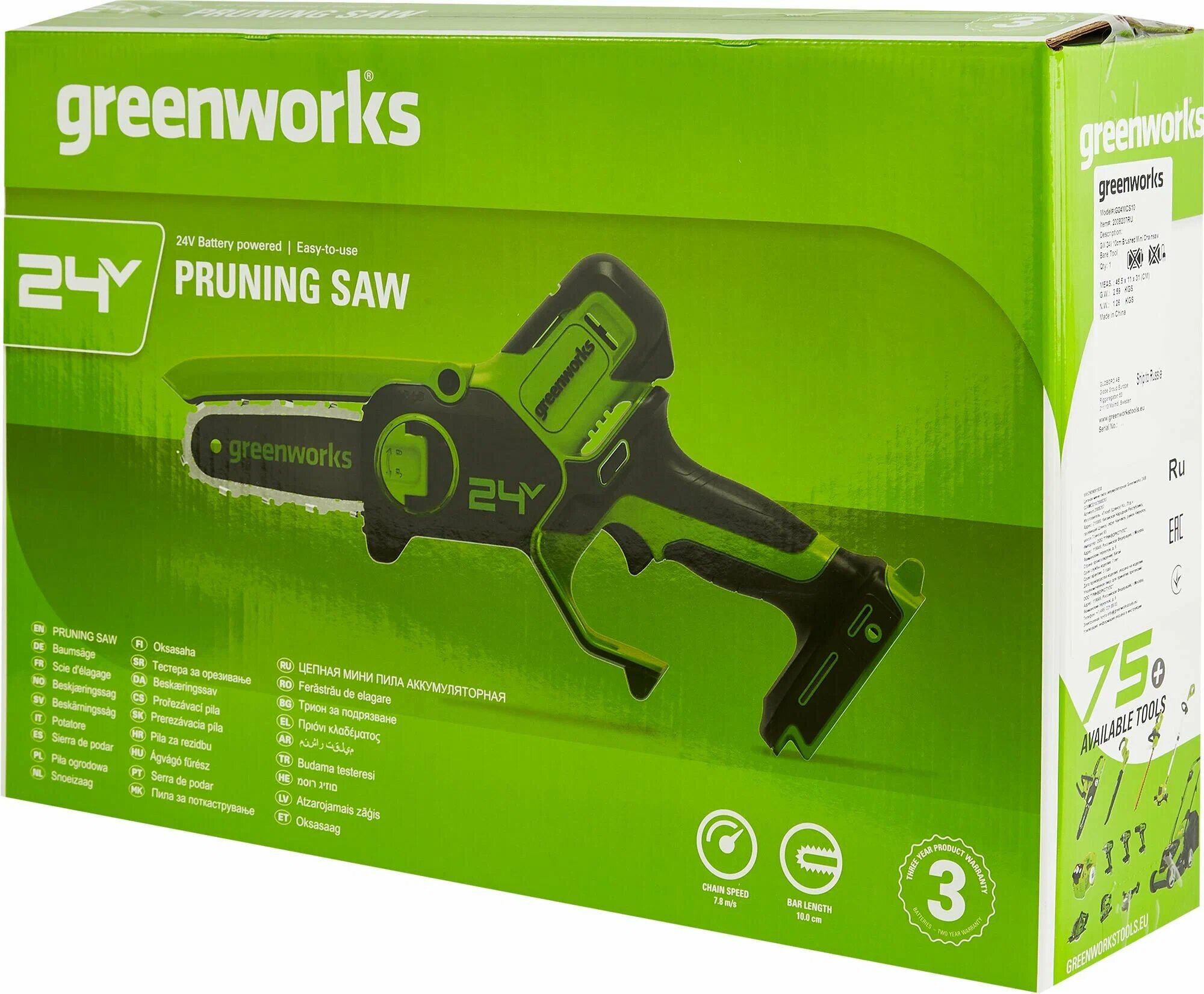 Цепная мини пила аккумуляторная Greenworks Арт. 2008207, 24V –садовая пила для обрезки сучков и веток. Предназначена для работы только с древесиной.