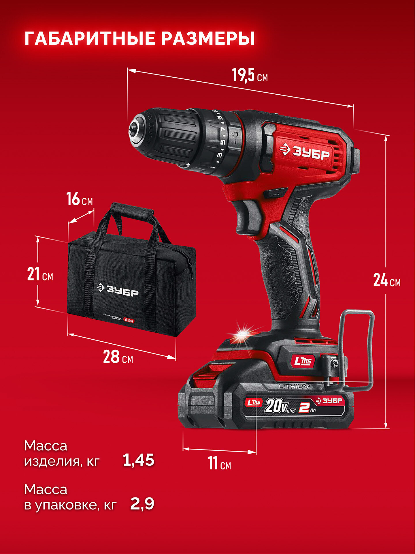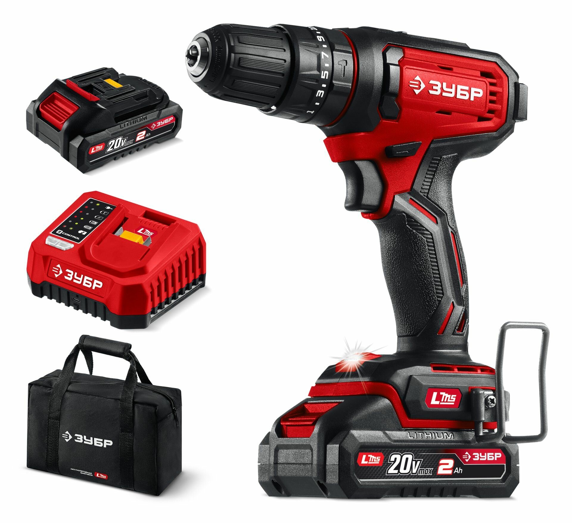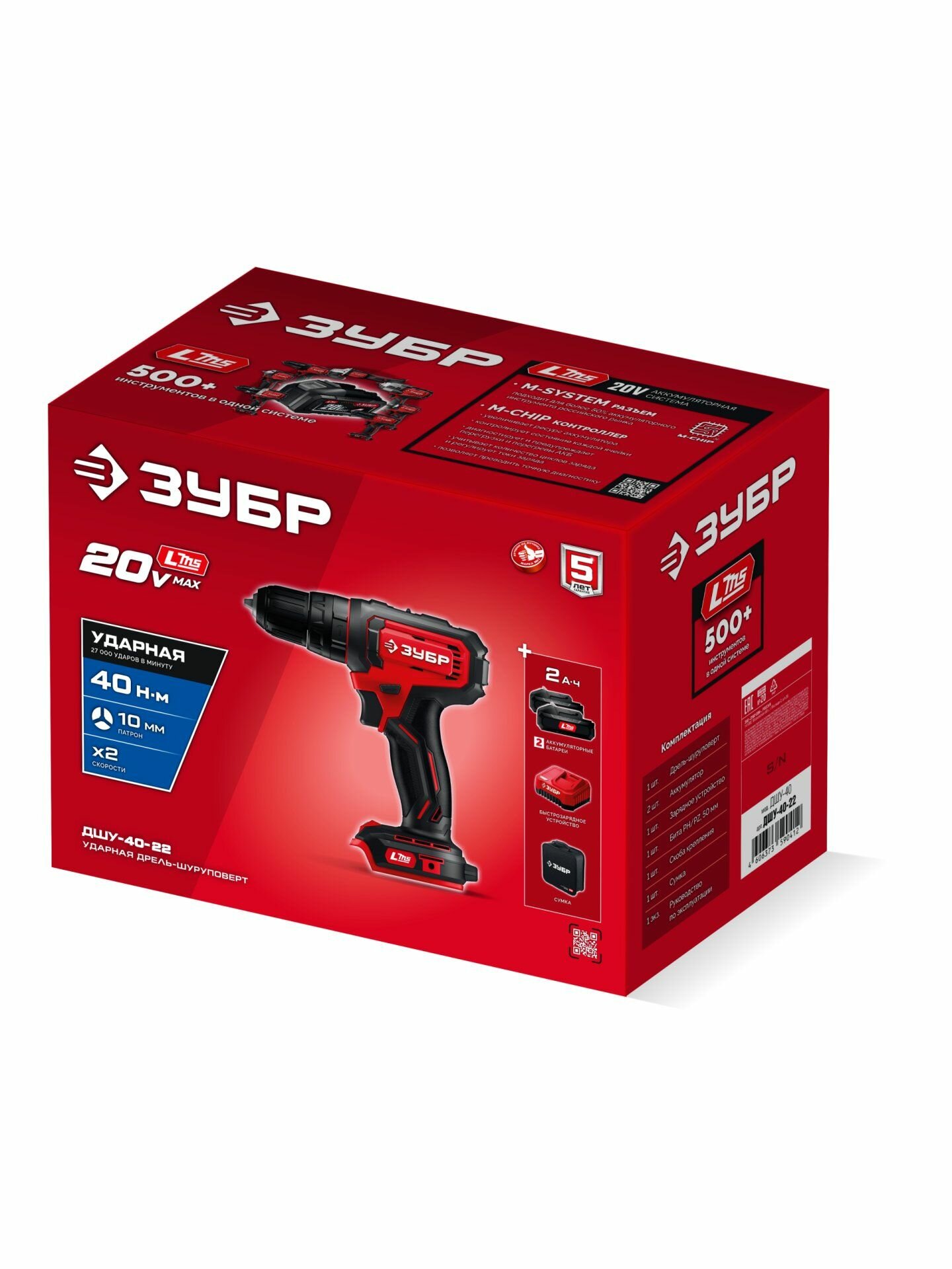 ЗУБР 20 В, 40 Н·м, 2 АКБ LMS (2 А·ч), ударная дрель-шуруповерт, сумка (ДШУ-40-22).