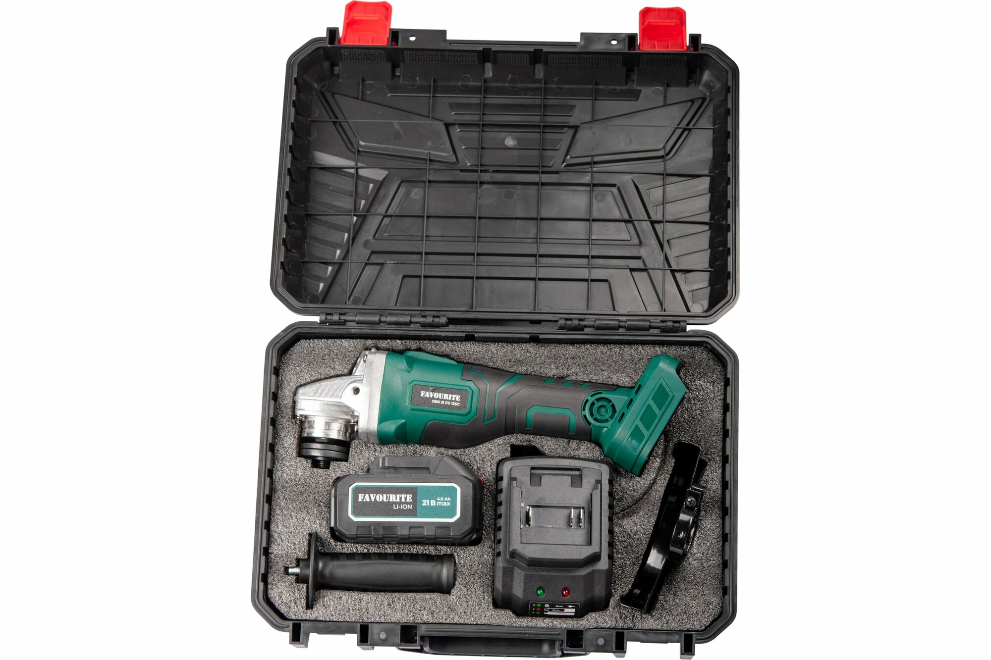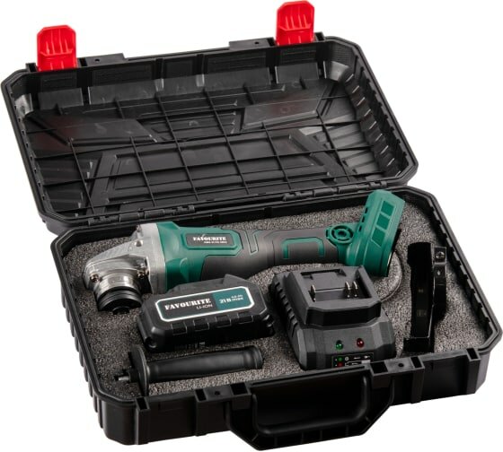 Комплектация: Угловая шлифовальная аккумуляторная машина, Зарядное устройство 1,3А, Аккумуляторная батарея 4А - 1шт, Дополнительная рукоять, Защитный кожух, Ключ, Инструкция, Кейс.