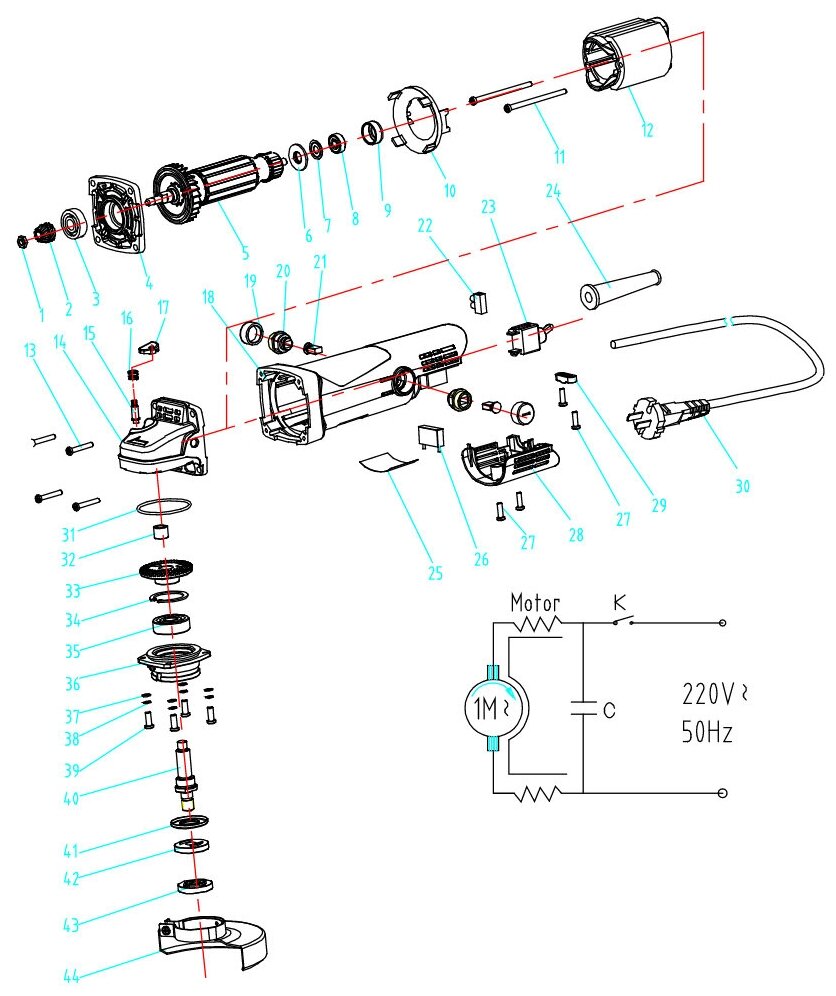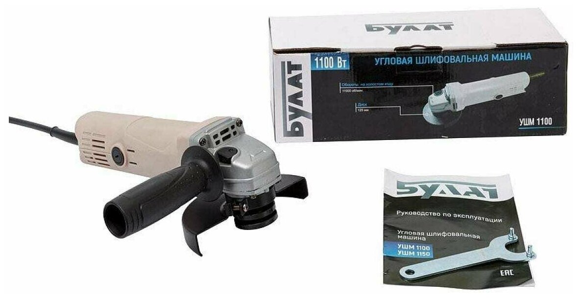 Углошлифовальная машинаКомплект угольных щетокБоковая рукоятьЗащитный кожухКлючИнструкцияКоробка