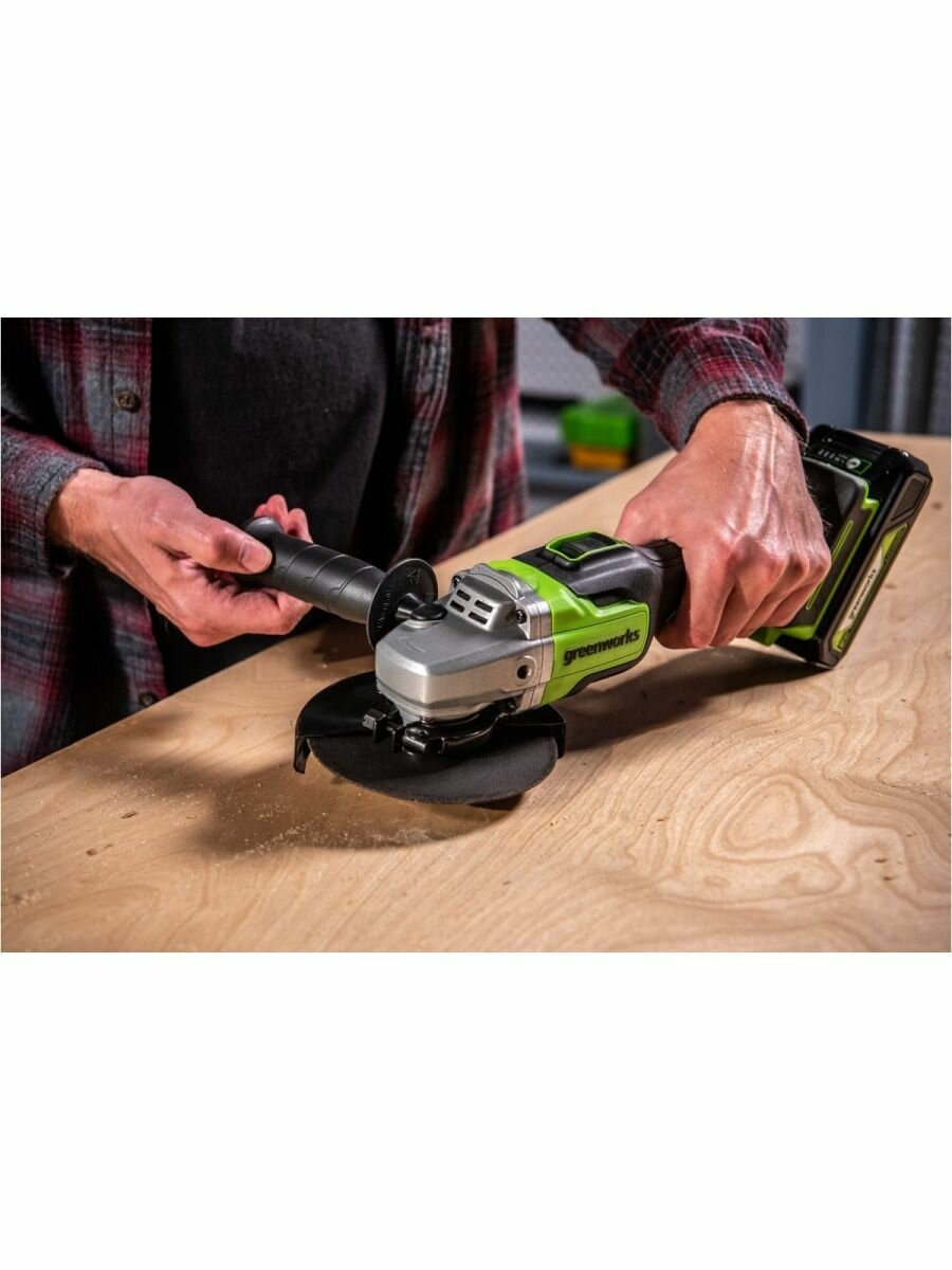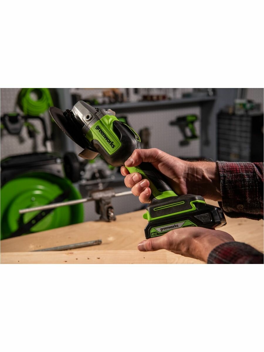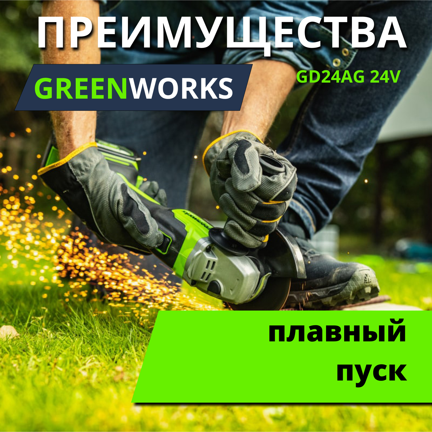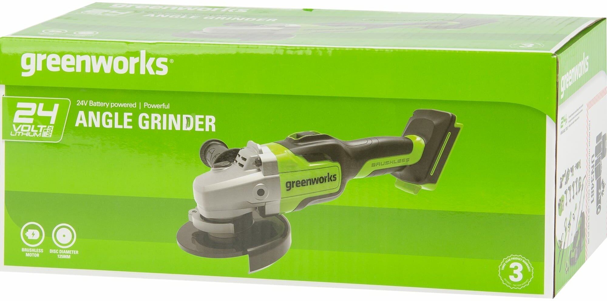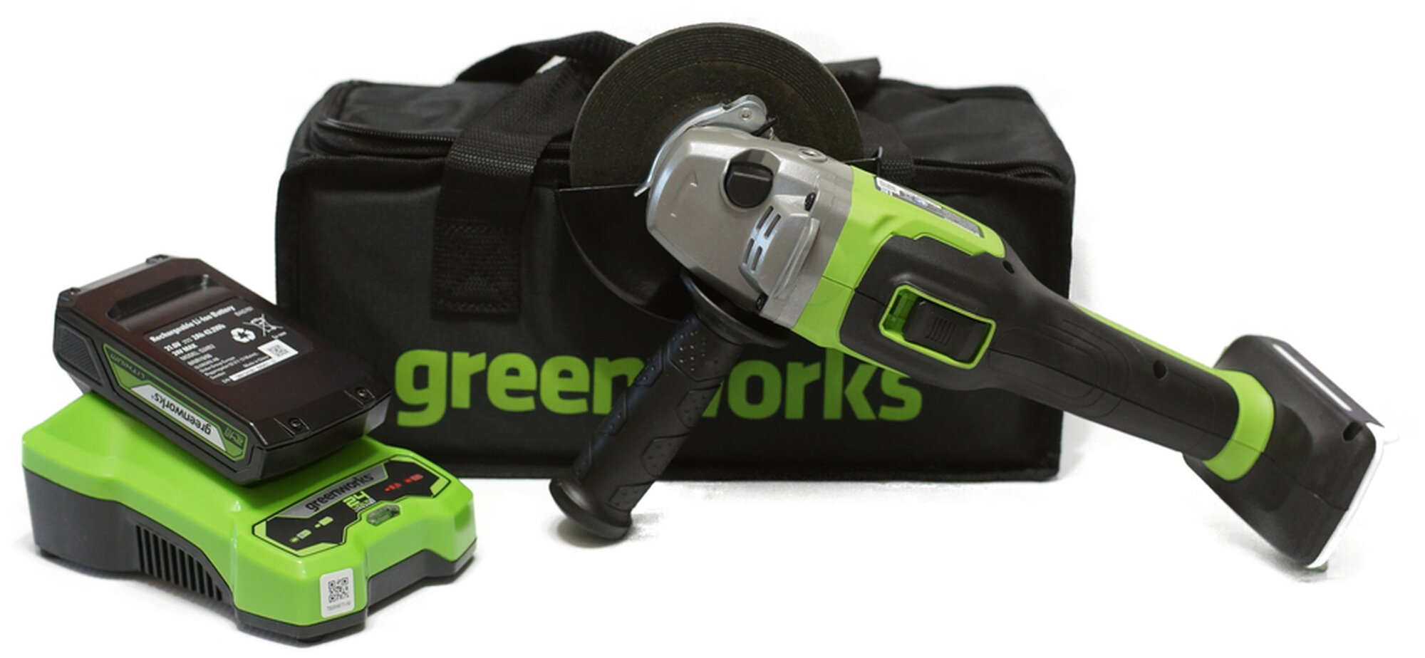 Комплект GD24AGK2 (Арт. 3200207UA): УШМ (болгарка), аккумулятор 24V 2 А*ч, зарядное устройство, удобная сумка-переноска. Угловая шлифовальная машина (болгарка) Greenworks 24V (модель GD24AG) - предназначена резки и шлифования металла. Мощный бесщеточный двигатель работает от аккумулятора 24В, что определяет высокую производительность и скорость реза. Максимальный размер режущего диска - 125 мм. Скорость вращения диска 10 500 оборотов в минуту. Рукоятка устройства прорезинена для улучшения контроля над машинкой и предотвращения выскальзывания инструмента из рук. Рукоятка очень удобно лежит в руке. В комплекте с устройством идет дополнительная боковая рукоять. УШМ оснащается ограничителем пускового тока для плавной регулировки пуска инструмента. Двигатель оснащен магнитным тормозом, который быстро останавливает режущий диск после выключения инструмента. Для быстрой замены оснастки УШМ оснащена блокировкой шпинделя. Важным преимуществом данной модели является малый вес - 1,5 кг. Для защиты двигателя от перегрева данная модель оснащена специальной вентиляцией и имеет систему охлаждение двигателя. В случае зажатия или блокировки режущего диска двигатель автоматически останавливается. Ударопрочный корпус устройства защищает его от повреждений, а металлический корпус редуктора еще больше увеличивает надежность инструмента. Посадочный диаметр - 22,2 мм. Блокировка двигателя при заклинивании диска. Серия Greenworks G-24V - включает в себя более 40 устройств. Приобретая данную модель в месте с аккумулятором, вы сможете использовать его аккумуляторную батарею с другими инструментами и садовой техникой 24В. Гарантия - 3 года. Состав комплекта: Угловая шлифовальная машина (Болгарка) Greenworks 24V, арт. 3200207, модель GD24AG; Боковая рукоятка; Ключ для монтажа диска; Аккумулятор 24В 2 А*ч; Зарядное устройство 2А; Руководство по эксплуатации; Гарантийный талон; Удобная сумка-переноска. Питание от аккумулятора 24V; Бесщеточный двигатель DigiPro; Максимальный размер режущего диска - 125 мм; Скорость вращения диска 10 500 оборотов в минуту; Рукоятка устройства прорезинена для улучшения контроля над машинкой и предотвращения выскальзывания инструмента из рук: Ограничитель пускового тока; Магнитный тормоз двигателя; Блокировка шпинделя; Малый вес - 1,5 кг. Ударопрочный корпус; Металлический корпус редуктора; Посадочный диаметр - 22,2 мм; Блокировка двигателя при заклинивании диска; Защиты двигателя от перегрева; Серия Greenworks G-24V - включает в себя более 30+ устройств. Приобретая данную модель в месте с аккумулятором, вы сможете использовать его аккумуляторную батарею с другими инструментами и садовой техникой 24В. Расширенная гарантия на инструмент 3 года. Гарантия на аккумулятор 2 года. Состав комплекта: Угловая шлифовальная машина (Болгарка) Greenworks 24V, арт. 3200207, модель GD24AG; Боковая рукоятка; Ключ для монтажа диска; Аккумулятор 24В 2 АЧ; Зарядное устройство 2А; Руководство по эксплуатации; Гарантийный талон; Удобная сумка-переноска.