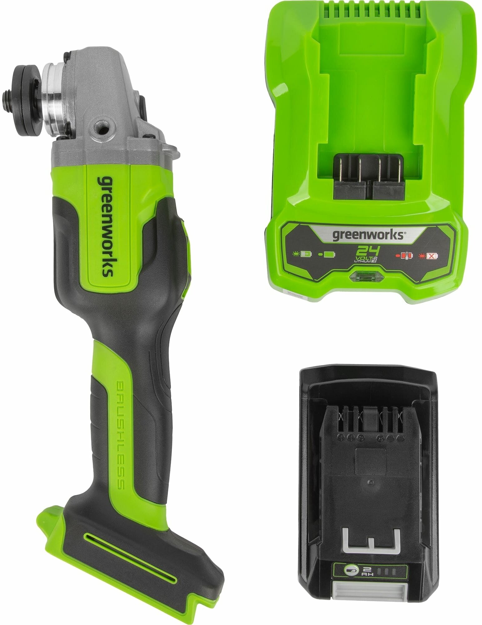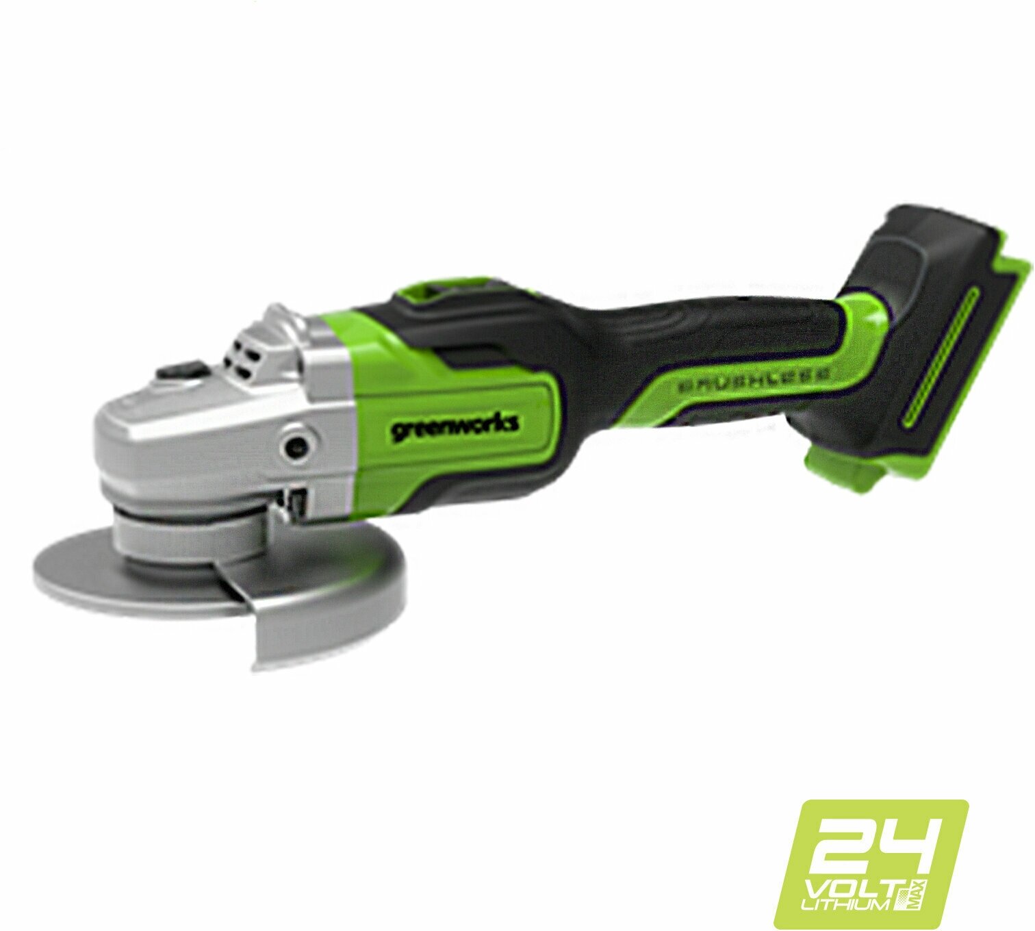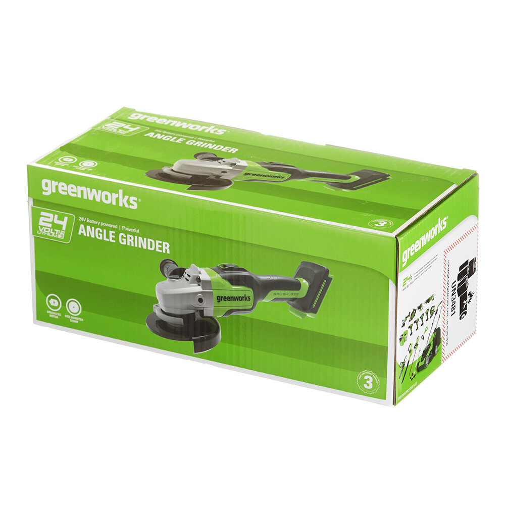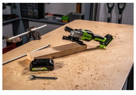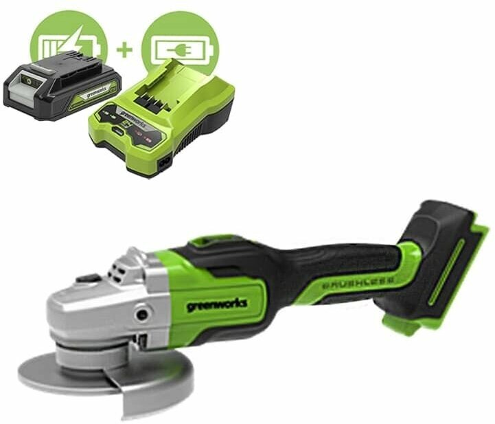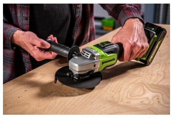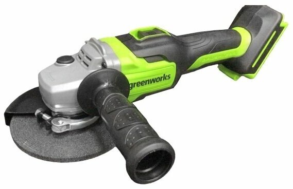 Комплект GD24AGK2 (Арт. 3200207UA): УШМ (болгарка), аккумулятор 24V 2 А*ч, зарядное устройство, удобная сумка-переноска. Угловая шлифовальная машина (болгарка) Greenworks 24V (модель GD24AG) - предназначена резки и шлифования металла. Мощный бесщеточный двигатель работает от аккумулятора 24В, что определяет высокую производительность и скорость реза. Максимальный размер режущего диска - 125 мм. Скорость вращения диска 10 500 оборотов в минуту. Рукоятка устройства прорезинена для улучшения контроля над машинкой и предотвращения выскальзывания инструмента из рук. Рукоятка очень удобно лежит в руке. В комплекте с устройством идет дополнительная боковая рукоять. УШМ оснащается ограничителем пускового тока для плавной регулировки пуска инструмента. Двигатель оснащен магнитным тормозом, который быстро останавливает режущий диск после выключения инструмента. Для быстрой замены оснастки УШМ оснащена блокировкой шпинделя. Важным преимуществом данной модели является малый вес - 1,5 кг. Для защиты двигателя от перегрева данная модель оснащена специальной вентиляцией и имеет систему охлаждение двигателя. В случае зажатия или блокировки режущего диска двигатель автоматически останавливается. Ударопрочный корпус устройства защищает его от повреждений, а металлический корпус редуктора еще больше увеличивает надежность инструмента. Посадочный диаметр - 22,2 мм. Блокировка двигателя при заклинивании диска. Серия Greenworks G-24V - включает в себя более 40 устройств. Приобретая данную модель в месте с аккумулятором, вы сможете использовать его аккумуляторную батарею с другими инструментами и садовой техникой 24В. Гарантия - 3 года. Состав комплекта: Угловая шлифовальная машина (Болгарка) Greenworks 24V, арт. 3200207, модель GD24AG; Боковая рукоятка; Ключ для монтажа диска; Аккумулятор 24В 2 А*ч; Зарядное устройство 2А; Руководство по эксплуатации; Гарантийный талон; Удобная сумка-переноска. Питание от аккумулятора 24V; Бесщеточный двигатель DigiPro; Максимальный размер режущего диска - 125 мм; Скорость вращения диска 10 500 оборотов в минуту; Рукоятка устройства прорезинена для улучшения контроля над машинкой и предотвращения выскальзывания инструмента из рук: Ограничитель пускового тока; Магнитный тормоз двигателя; Блокировка шпинделя; Малый вес - 1,5 кг. Ударопрочный корпус; Металлический корпус редуктора; Посадочный диаметр - 22,2 мм; Блокировка двигателя при заклинивании диска; Защиты двигателя от перегрева; Серия Greenworks G-24V - включает в себя более 30+ устройств. Приобретая данную модель в месте с аккумулятором, вы сможете использовать его аккумуляторную батарею с другими инструментами и садовой техникой 24В. Расширенная гарантия на инструмент 3 года. Гарантия на аккумулятор 2 года. Состав комплекта: Угловая шлифовальная машина (Болгарка) Greenworks 24V, арт. 3200207, модель GD24AG; Боковая рукоятка; Ключ для монтажа диска; Аккумулятор 24В 2 АЧ; Зарядное устройство 2А; Руководство по эксплуатации; Гарантийный талон; Удобная сумка-переноска.