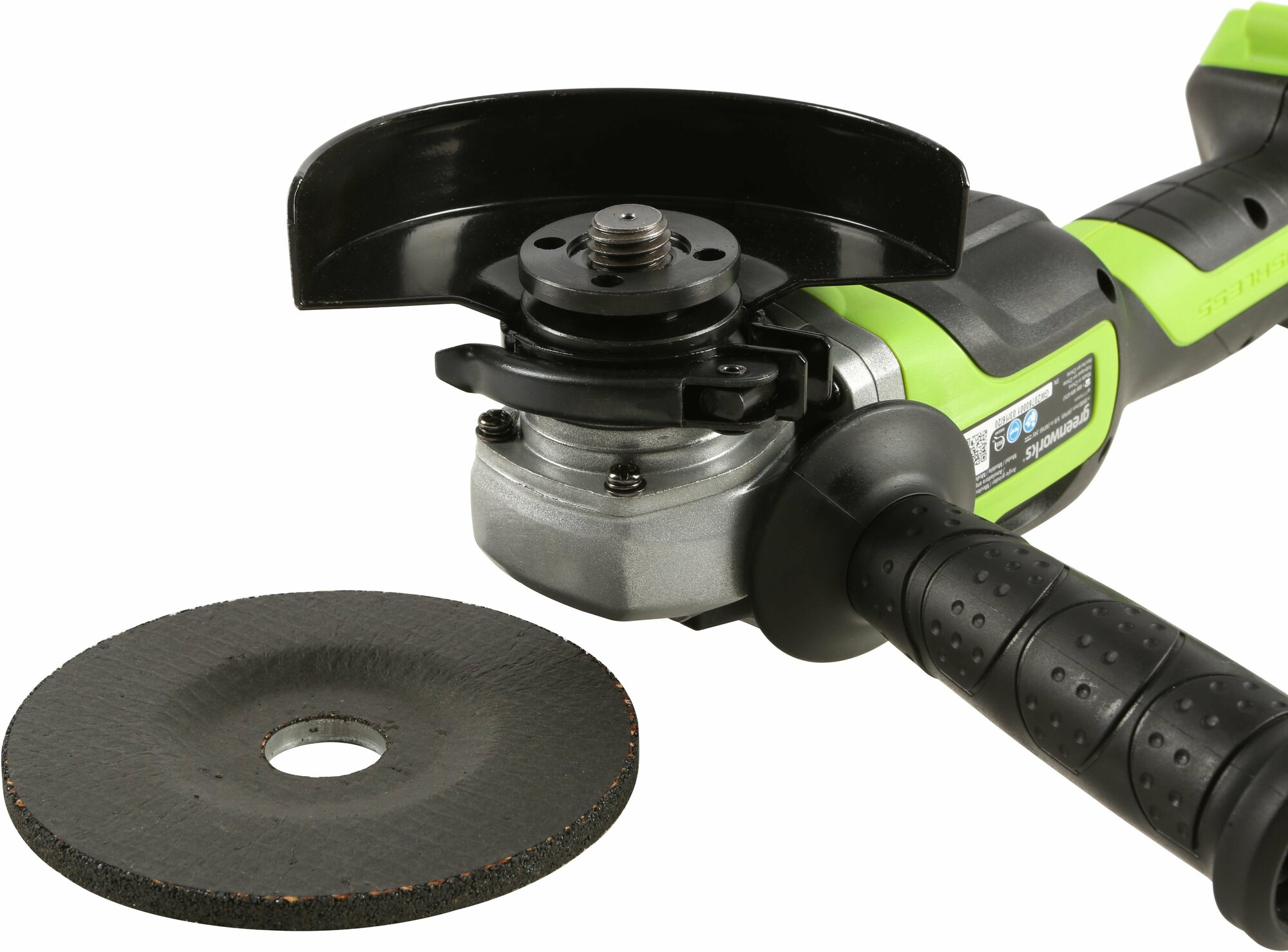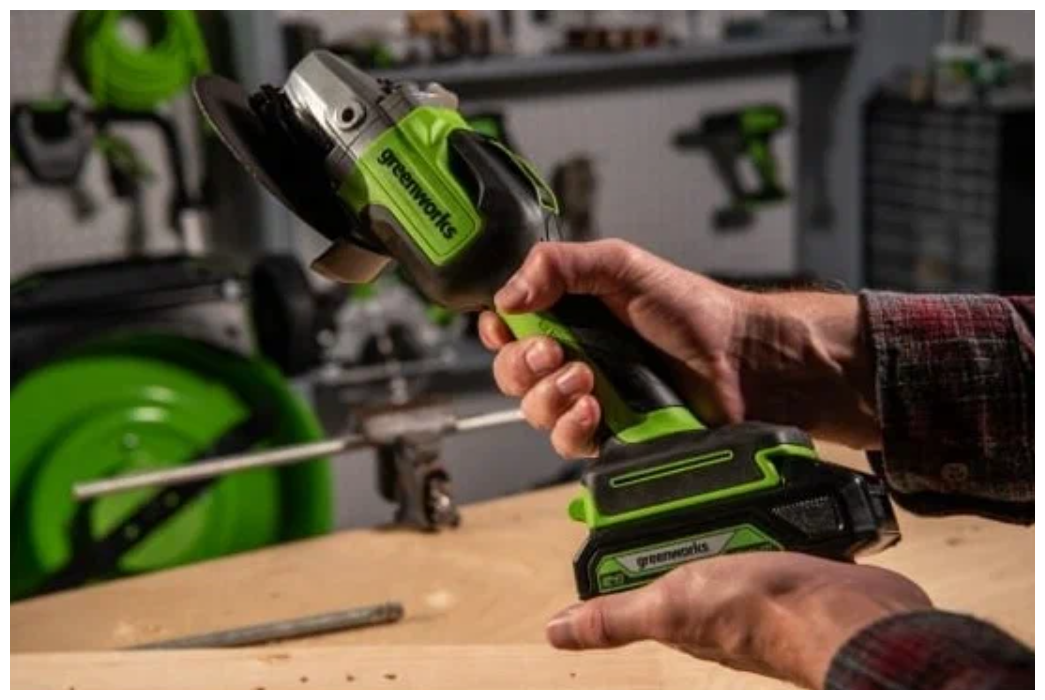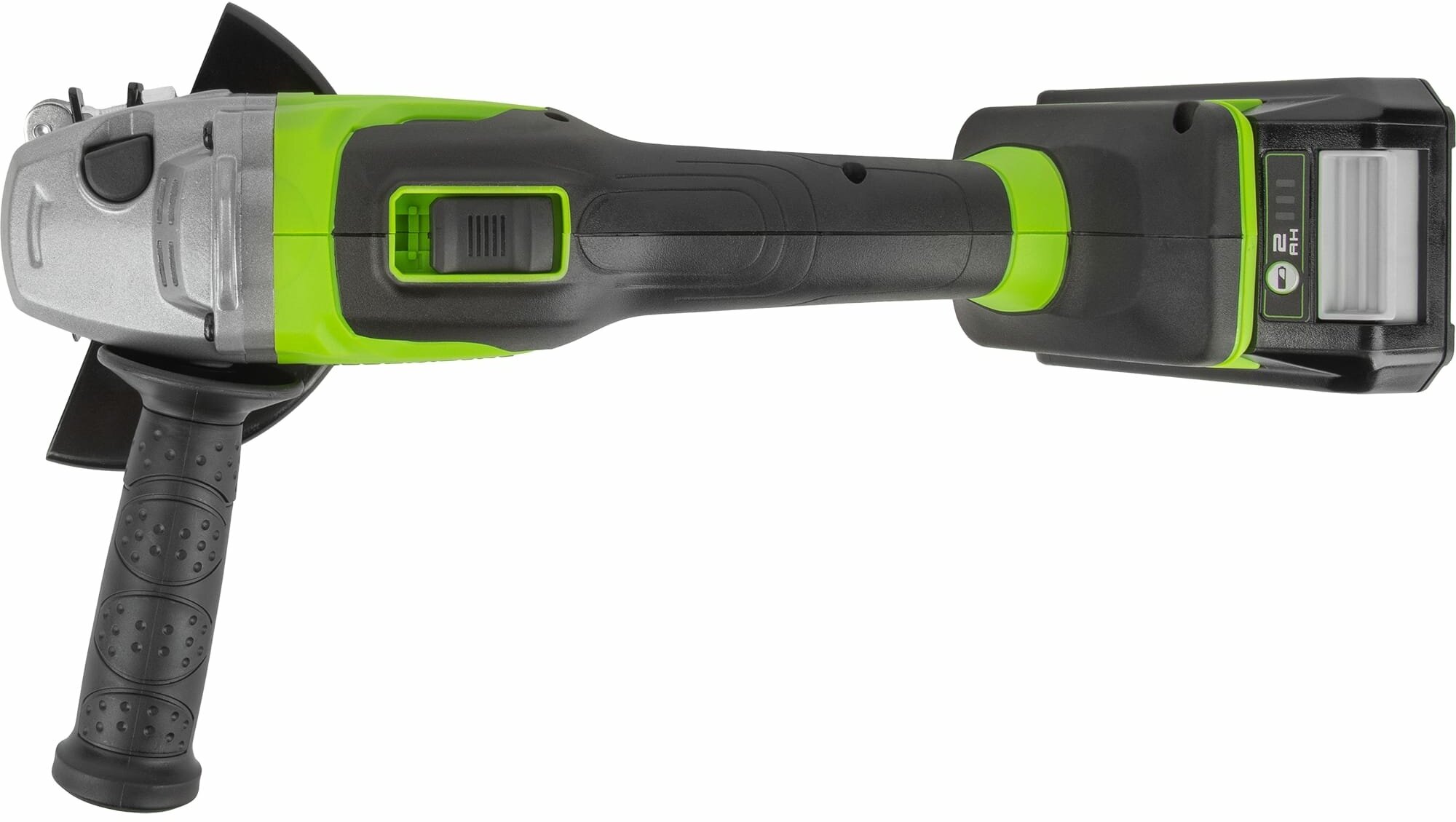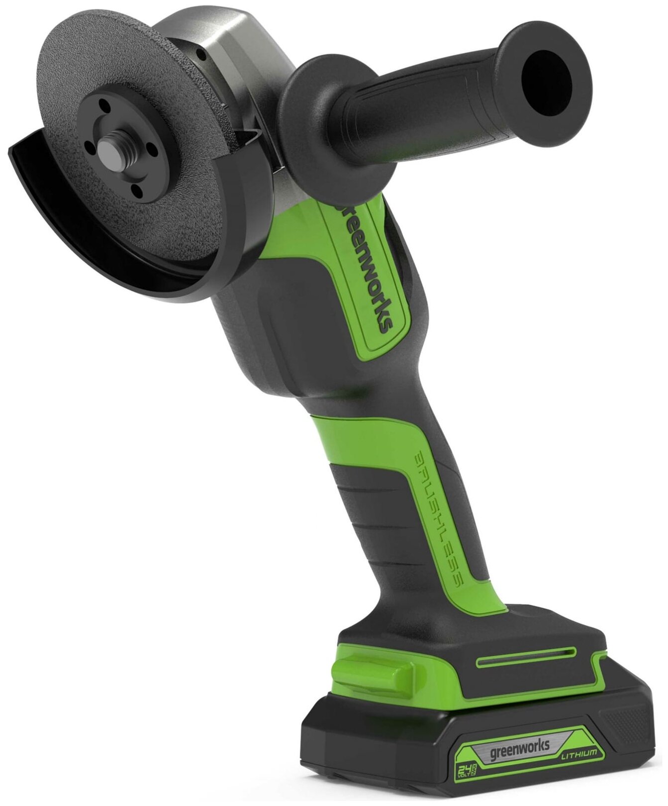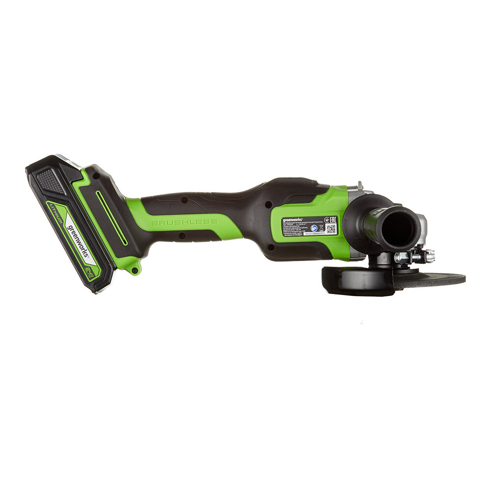 Комплект GD24AGK2 (Арт. 3200207UA): УШМ (болгарка), аккумулятор 24V 2 А*ч, зарядное устройство, удобная сумка-переноска. Угловая шлифовальная машина (болгарка) Greenworks 24V (модель GD24AG) - предназначена резки и шлифования металла. Мощный бесщеточный двигатель работает от аккумулятора 24В, что определяет высокую производительность и скорость реза. Максимальный размер режущего диска - 125 мм. Скорость вращения диска 10 500 оборотов в минуту. Рукоятка устройства прорезинена для улучшения контроля над машинкой и предотвращения выскальзывания инструмента из рук. Рукоятка очень удобно лежит в руке. В комплекте с устройством идет дополнительная боковая рукоять. УШМ оснащается ограничителем пускового тока для плавной регулировки пуска инструмента. Двигатель оснащен магнитным тормозом, который быстро останавливает режущий диск после выключения инструмента. Для быстрой замены оснастки УШМ оснащена блокировкой шпинделя. Важным преимуществом данной модели является малый вес - 1,5 кг. Для защиты двигателя от перегрева данная модель оснащена специальной вентиляцией и имеет систему охлаждение двигателя. В случае зажатия или блокировки режущего диска двигатель автоматически останавливается. Ударопрочный корпус устройства защищает его от повреждений, а металлический корпус редуктора еще больше увеличивает надежность инструмента. Посадочный диаметр - 22,2 мм. Блокировка двигателя при заклинивании диска. Серия Greenworks G-24V - включает в себя более 40 устройств. Приобретая данную модель в месте с аккумулятором, вы сможете использовать его аккумуляторную батарею с другими инструментами и садовой техникой 24В. Гарантия - 3 года. Состав комплекта: Угловая шлифовальная машина (Болгарка) Greenworks 24V, арт. 3200207, модель GD24AG; Боковая рукоятка; Ключ для монтажа диска; Аккумулятор 24В 2 А*ч; Зарядное устройство 2А; Руководство по эксплуатации; Гарантийный талон; Удобная сумка-переноска. Питание от аккумулятора 24V; Бесщеточный двигатель DigiPro; Максимальный размер режущего диска - 125 мм; Скорость вращения диска 10 500 оборотов в минуту; Рукоятка устройства прорезинена для улучшения контроля над машинкой и предотвращения выскальзывания инструмента из рук: Ограничитель пускового тока; Магнитный тормоз двигателя; Блокировка шпинделя; Малый вес - 1,5 кг. Ударопрочный корпус; Металлический корпус редуктора; Посадочный диаметр - 22,2 мм; Блокировка двигателя при заклинивании диска; Защиты двигателя от перегрева; Серия Greenworks G-24V - включает в себя более 30+ устройств. Приобретая данную модель в месте с аккумулятором, вы сможете использовать его аккумуляторную батарею с другими инструментами и садовой техникой 24В. Расширенная гарантия на инструмент 3 года. Гарантия на аккумулятор 2 года. Состав комплекта: Угловая шлифовальная машина (Болгарка) Greenworks 24V, арт. 3200207, модель GD24AG; Боковая рукоятка; Ключ для монтажа диска; Аккумулятор 24В 2 АЧ; Зарядное устройство 2А; Руководство по эксплуатации; Гарантийный талон; Удобная сумка-переноска.