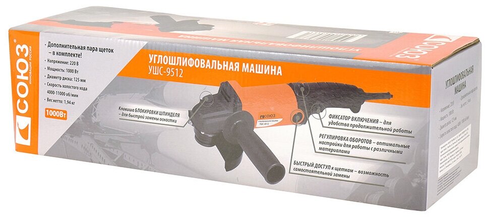 Угловая шлифмашина СОЮЗ УШС-9512 предназначена для домашних мастеров. Блокировка шпинделя облегчает замену диска и помогает тратить на эту вспомогательную операцию минимум времени. Дополнительная рукоятка упрощает управление инструментом, её можно устанавливать слева или справа. Наличие кожуха препятствует попаданию искр и пыли на пользователя.