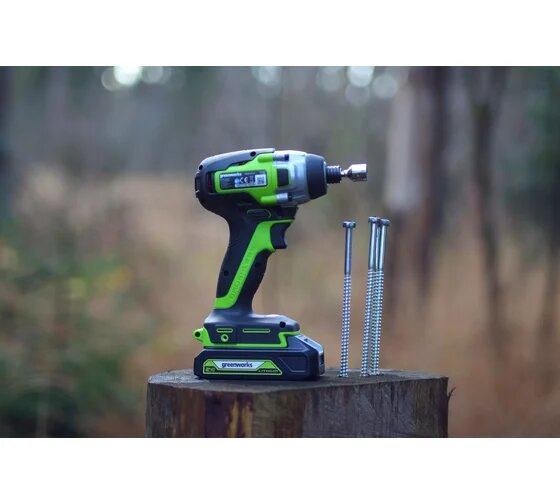 Ударный аккумуляторный винтоверт Greenworks GD24ID3 3802807 отлично подходит для бытового использования: завинчивание длинных шурупов с квадратным шлицем при сборке панелей, завинчивание каретных болтов в деревянные столбы, завинчивание винтов в блочные стены и бетон, завинчивание винтов в металлические стойки и т.д.