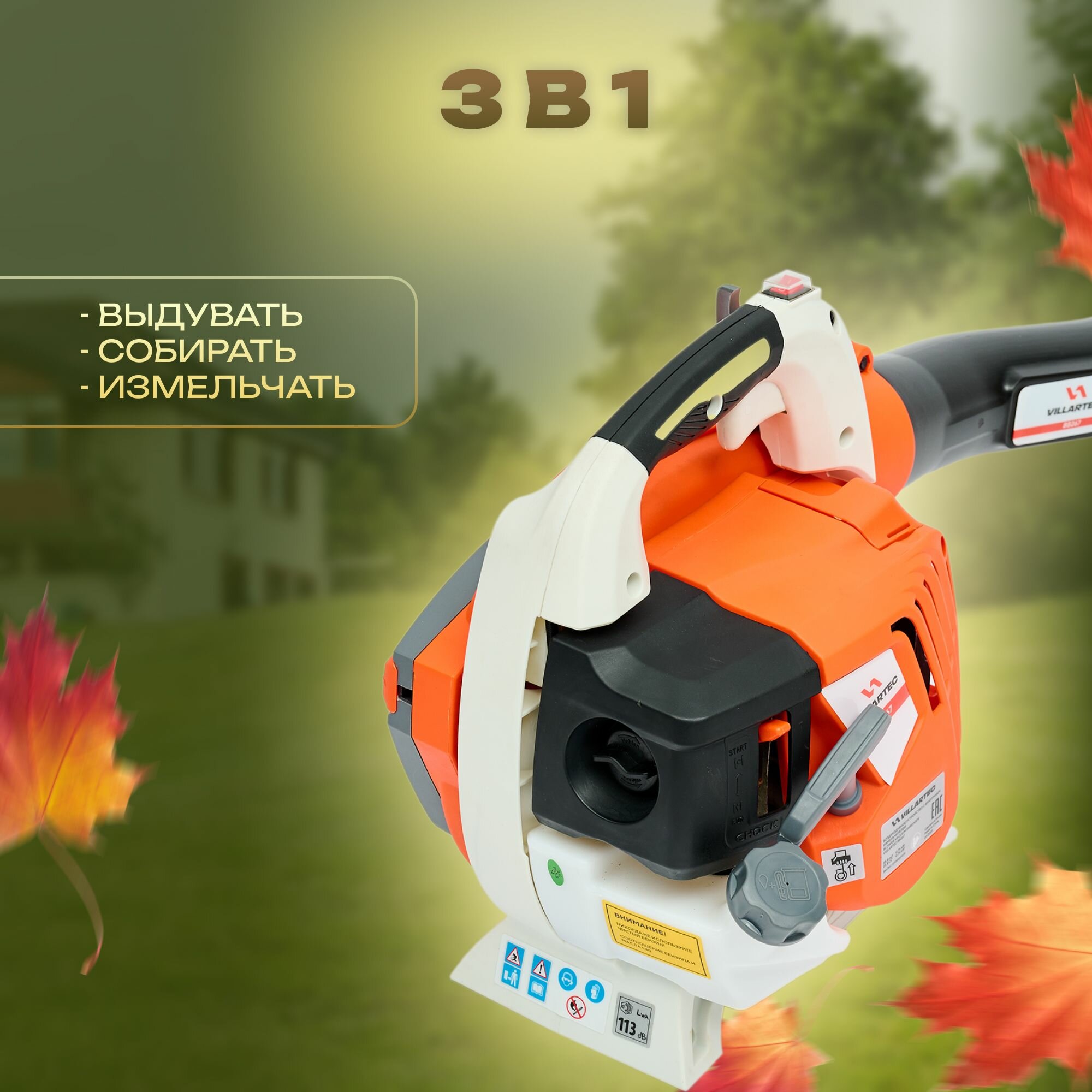 Воздуходувка бензиновая садовая VILLARTEC BB267 - универсальный инструмент садовый бензиновый 2 в 1 для разных работ на участке: сдувание упавших листьев и мелкого мусора, сборка мусора в мешок и его измельчение. Воздуходувное устройство совмещает в себе 3 функции для разных работ на садовом участке: воздуходувка, садовый пылесос, мульчирование. В комплекте идет вместительный, съемный травосборник. Смена режимов осуществляется одним движением переключателя. Низкий уровень вибраций и шума, а также небольшой вес инструмента – 4.7 кг позволяет пользоваться воздуходувкой с комфортом продолжительное время. Функция перемалывания собранного мусора уменьшает его объем и превращает в полезную мульчу, которую в дальнейшем можно использовать для разных целей.