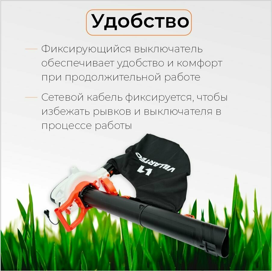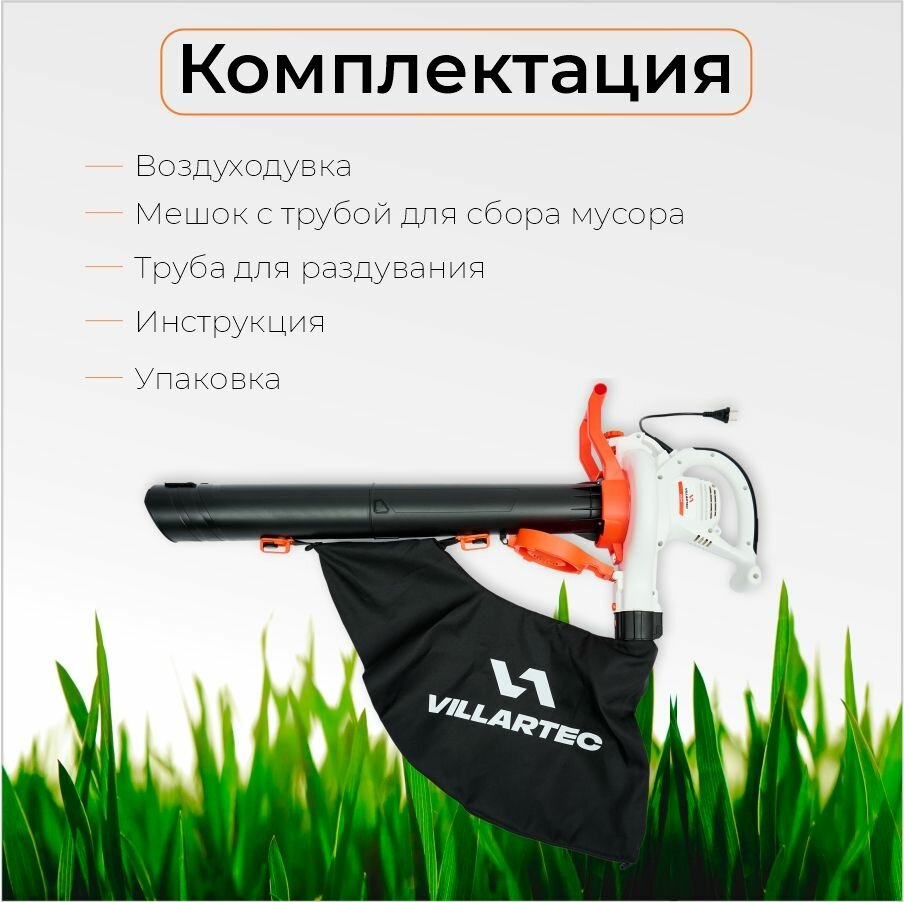 Воздуходувка электрическая садовая VILLARTEC BE264 - универсальный инструмент садовый электрический 3 в 1 для разных работ на участке: сдувание упавших листьев и мелкого мусора, сборка мусора в мешок и его измельчение.