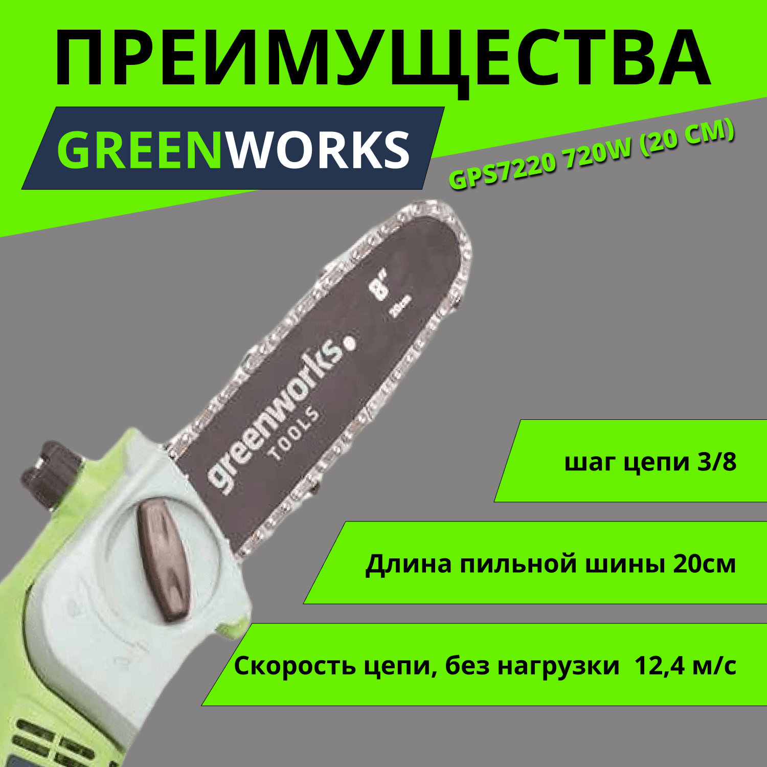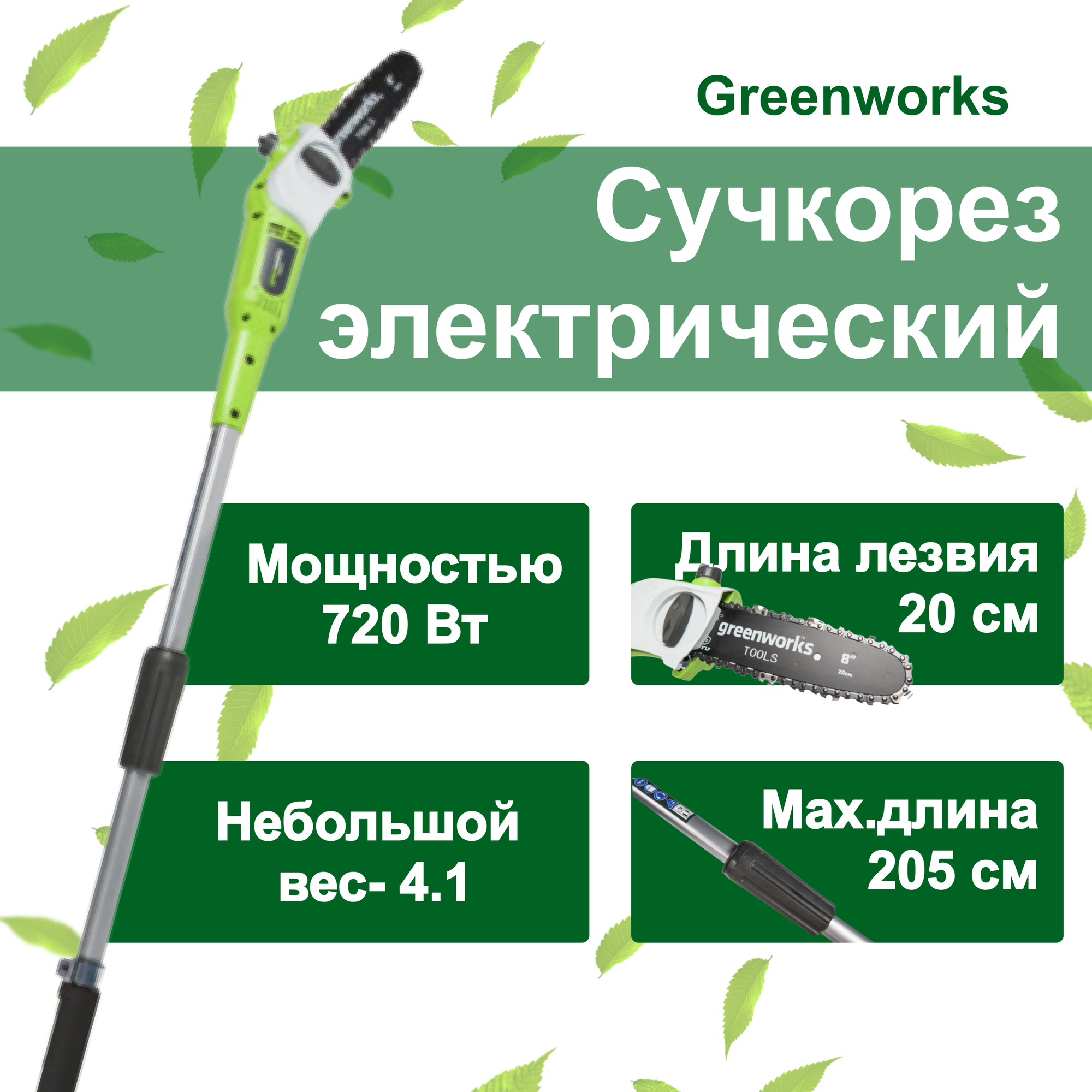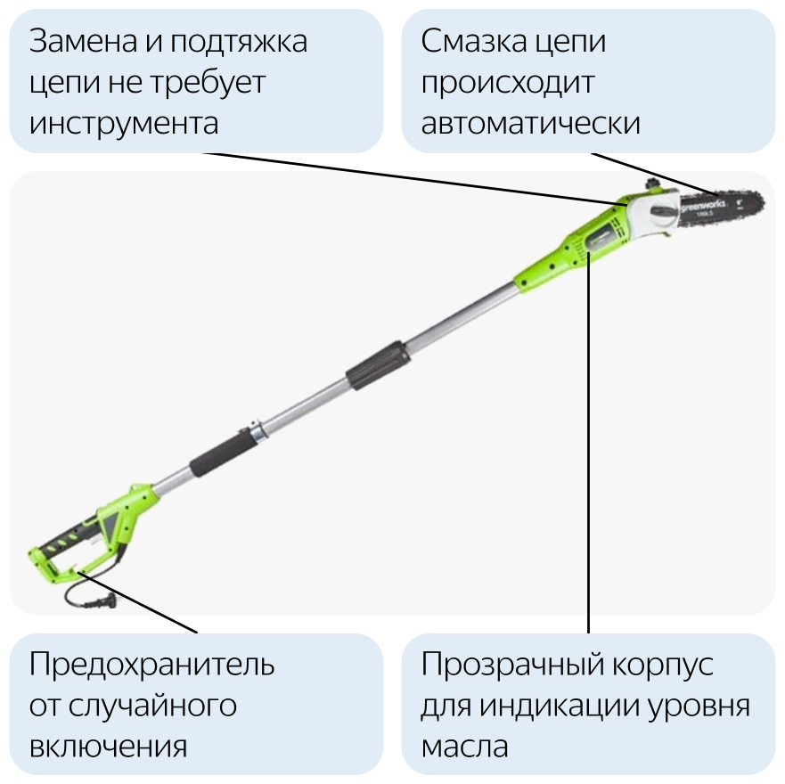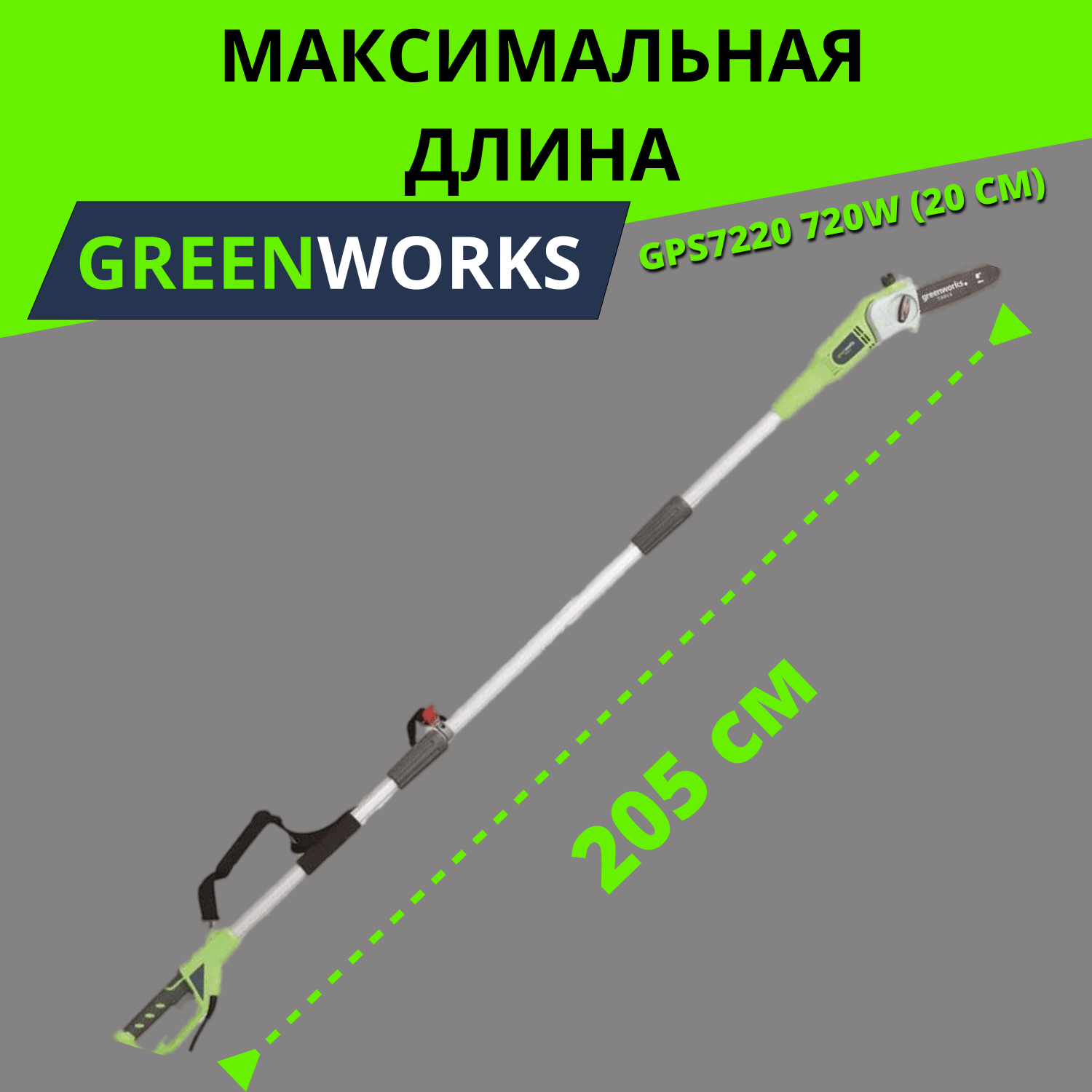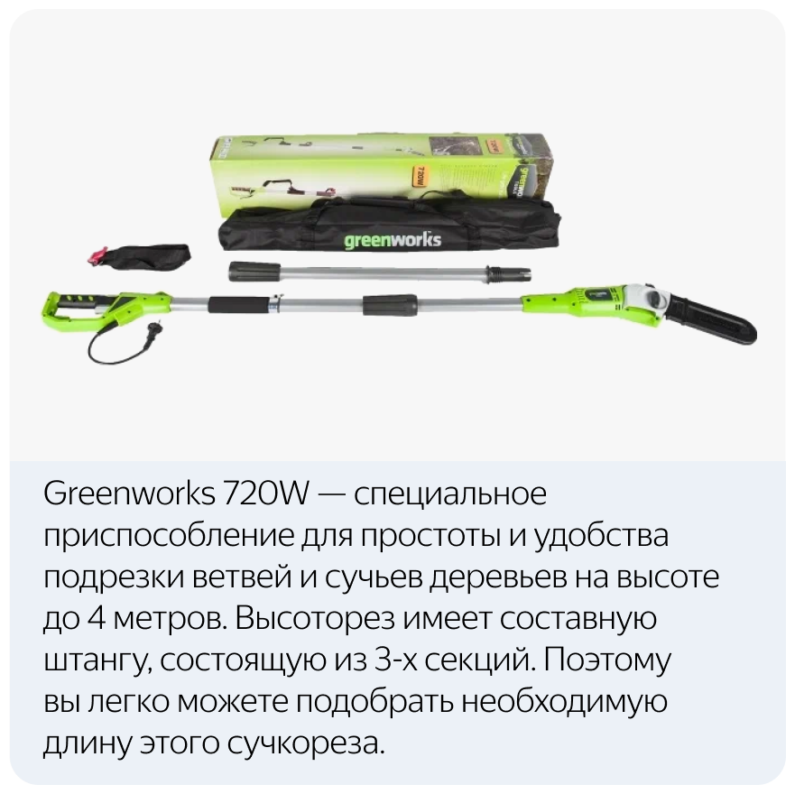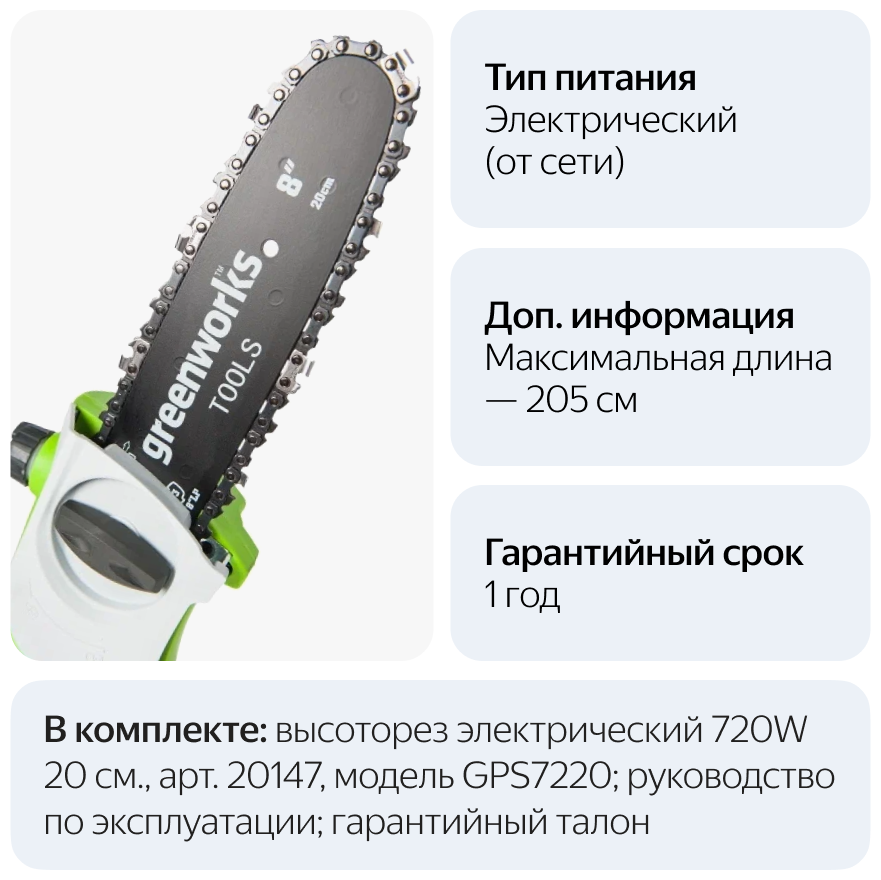 Высоторез электрический удлиненный GREENWORKS GPS7220 720Вт,46см,3/8-1,3-33,макс.длина 255см (20147)